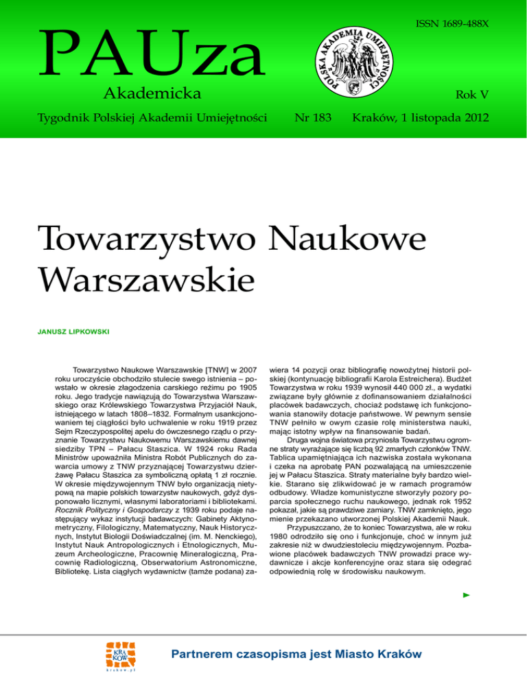 PAUza ISSN 1689-488X Akademicka Tygodnik Polskiej Akademii Umiejętności Rok V Nr 183 Kraków, 1 listopada 2012 Towarzystwo Naukowe Warszawskie Janusz Lipkowski Towarzystwo Naukowe Warszawskie [TNW] w 2007 roku uroczyście obchodziło stulecie swego istnienia – powstało w okresie złagodzenia carskiego reżimu po 1905 roku. Jego tradycje nawiązują do Towarzystwa Warszawskiego oraz Królewskiego Towarzystwa Przyjaciół Nauk, istniejącego w latach 1808–1832. Formalnym usankcjonowaniem tej ciągłości było uchwalenie w roku 1919 przez Sejm Rzeczypospolitej apelu do ówczesnego rządu o przy znanie Towarzystwu Naukowemu Warszawskiemu dawnej siedziby TPN – Pałacu Staszica. W 1924 roku Rada Ministrów upoważniła Ministra Robót Publicznych do zawarcia umowy z TNW przyznającej Towarzystwu dzierżawę Pałacu Staszica za symboliczną opłatą 1 zł rocznie. W okresie międzywojennym TNW było organizacją niety pową na mapie polskich towarzystw naukowych, gdyż dys ponowało licznymi, własnymi laboratoriami i bibliotekami. Rocznik Polityczny i Gospodarczy z 1939 roku podaje na stępujący wykaz instytucji badawczych: Gabinety Aktyno metryczny, Filologiczny, Matematyczny, Nauk Historycznych, Instytut Biologii Doświadczalnej (im. M. Nenckiego), Instytut Nauk Antropologicznych i Etnologicznych, Muzeum Archeologiczne, Pracownię Mineralogiczną, Pracownię Radiologiczną, Obserwatorium Astronomiczne, Bibliotekę. Lista ciągłych wydawnictw (tamże podana) za- wiera 14 pozycji oraz bibliografię nowożytnej historii polskiej (kontynuację bibliografii Karola Estreichera). Budżet Towarzystwa w roku 1939 wynosił 440 000 zł., a wydatki związane były głównie z dofinansowaniem działalności placówek badawczych, chociaż podstawę ich funkcjonowania stanowiły dotacje państwowe. W pewnym sensie TNW pełniło w owym czasie rolę ministerstwa nauki, mając istotny wpływ na finansowanie badań. Druga wojna światowa przyniosła Towarzystwu ogromne straty wyrażające się liczbą 92 zmarłych członków TNW. Tablica upamiętniająca ich nazwiska została wykonana i czeka na aprobatę PAN pozwalającą na umieszczenie jej w Pałacu Staszica. Straty materialne były bardzo wielkie. Starano się zlikwidować je w ramach programów odbudowy. Władze komunistyczne stworzyły pozory poparcia społecznego ruchu naukowego, jednak rok 1952 pokazał, jakie są prawdziwe zamiary. TNW zamknięto, jego mienie przekazano utworzonej Polskiej Akademii Nauk. Przypuszczano, że to koniec Towarzystwa, ale w roku 1980 odrodziło się ono i funkcjonuje, choć w innym już zakresie niż w dwudziestoleciu międzywojennym. Pozbawione placówek badawczych TNW prowadzi prace wydawnicze i akcje konferencyjne oraz stara się odegrać odpowiednią rolę w środowisku naukowym. ► Partnerem czasopisma jest Miasto Kraków 2 www.pauza.krakow.pl Numer 183 1 listopada 2012 ► Akademia Umiejętności odegrała bardzo istotną rolę w tworzeniu Towarzystwa Naukowego Warszawskiego jako organizacji na najwyższym poziomie naukowym. W środowisku warszawskim pod zaborem rosyjskim brakowało polskich profesorów o powszechnie uznanym autorytecie. W gronie 15 członków założycieli Towarzystwa w 1907 roku dziewięciu było członkami AU. Większość pozosta łych była związana z rosyjskim, Cesarskim Uniwersytetem Warszawskim. Warto też wspomnieć o próbach utwo rzenie w Warszawie towarzystwa naukowego, podejmowanych przez warszawskich członków Akademii Umiejętności. W roku 1904 próby te nie powiodły się wskutek sprzeciwu władz carskich, ale potem, przy zaangażowaniu środowiska warszawskiej Szkoły Głównej i twórców Kasy Mianowskiego, przyniosły wreszcie sukces w okresie politycznej odwilży w Rosji. Trzeba też wspomnieć o współpracy TNW–PAU – po odzyskaniu niepodległości – (a także współpracy TNW z Towarzystwem Naukowym Lwowskim i Akademią Nauk Technicznych) w Komitecie Porozumiewawczym, którego celem było wspólne popieranie i obrona interesów nauki polskiej, wykonywanie wspólnych przedsięwzięć naukowych, reprezentacja polskiej nauki za granicą, wspieranie wydawnictw naukowych oraz ustalanie stosunku do naukowych instytucji i form ich popierania. Komitet powo ływał Radę Nauk Ścisłych i Stosowanych, której zada nia były doniosłe, a mianowicie (cytuję): śledzenie za roz wojem wszystkich dziedzin wiedzy, szybkie informowanie świata naukowego o dorobku nauki polskiej w zakresie wiedzy czystej i stosowanej, wydawanie opinii we wszyst kich sprawach związanych z rozwojem nauk ścisłych i ich zastosowań, służenie Rządowi RP pomocą fachową we wszystkich zagadnieniach związanych z potrzebami Państwa, uzgadnianie wniosków przedstawianych przez poszczególne komitety naukowe. Komitetów było 15, pokrywały całość ówczesnej nauki. Przełom polityczny w Polsce w roku 1989 nie przyniósł oczekiwanego odrodzenia społecznego ruchu naukowego. Wprawdzie zlikwidowano wszelkiego rodzaju kontrole i „nadzory” o podłożu politycznym, ale demokratyczna władza nie wykazuje ochoty delegowania istotnej części swoich kompetencji w gestię towarzystw naukowych. Nawet projekt specjalnej ustawy o towarzystwach naukowych nie może przebić się pod obrady Sejmu, mimo że nie zawiera żadnych (!) zobowiązań wobec władz państwowych. Uważam to za błąd. Nie można wszystkiego uregulować rozporządzeniami ministerialnymi i regulaminami, i tak mamy ich nadmiar. Potrzebujemy dobrze zorganizowanego środowiska naukowego, którego opinia będzie ważyć bardziej niż drobiazgowe przepisy. Można to jeszcze nadrobić, póki żyją uczeni świadomi prawdziwej misji nauki. Towarzystwo Naukowe Warszawskie po odrodzeniu w 1980 roku znalazło się w znacznie trudniejszej sytuacji niż Polska Akademia Umiejętności. Podstawowym problemem było (i nadal pozostaje) oficjalne uznanie ciągłości TNW. Urzędy w tej kwestii nie zachowują się konsekwentnie mimo, że sprawa w