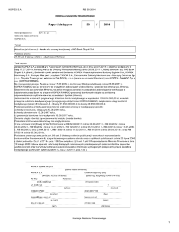 KOPEX S.A. RB 59 2014 KOMISJA NADZORU FINANSOWEGO Raport bieżący nr 59 / 2014 2014-07-23 Data sporządzenia: Skróc ona nazwa emitenta KOPEX S.A. Temat Aktualizacja informacji - Aneks do umowy kredytowej z ING Bank Śląski S.A. Podstawa prawna Art. 56 ust. 5 Ustawy o ofercie - aktualizac ja informacji Treść raportu: Zarząd KOPEX S.A. z siedzibą w Katowicach (Emitent) informuje, że w dniu 23.07.2014 r. otrzymał podpisany z datą 17.07.2014 r. kolejny Aneks do Umowy Wieloproduktowej z dnia 28.06.2011 r., której stronami są: ING Bank Śląski S.A. (Bank), Emitent i spółki zależne od Emitenta: KOPEX -Przedsiębiorstwo Budowy Szybów S.A., KOPEX Machinery S.A., Fabryka Maszyn i Urządzeń TAGOR S.A., Zabrzańskie Zakłady Mechaniczne - Maszyny Górnicze Sp. z o.o., Śląskie Towarzystwo Wiertnicze DALBIS Sp. z o.o (zwane w umowie Klientami) oraz KOPEX - FAMAGO Sp. z o.o. (KOPEX-FAMAGO). Na mocy podpisanego Aneksu z dnia 17.07.2014 r. do Umowy Wieloproduktowej z dnia 28.06.2011 r. KOPEX-FAMAGO został zwolniony ze wszystkich zobowiązań wobec Banku i przestał być stroną ww. Umowy. Stosownie do postanowień Umowy, wszelkie mogące powstać w przyszłości zobowiązania wynikające z udzielonych przez Bank na zlecenie KOPEX-FAMAGO gwarancji bankowych objęte są solidarną odpowiedzialnością Emitenta oraz pozostałych Spółek (Klienci). Jednocześnie w ramach przyznanego Klientom limitu kredytowego w wysokości 135.814.000,00 zł, wskutek przejęcia sublimitu kredytowego przysługującego dotychczas KOPEX-FAMAGO, zwiększeniu uległ sublimit kredytowy przyznany Emitentowi, tj. z kwoty 31.950.000,00 zł do kwoty 49.950.000,00 zł. Podpisany Aneks przedłuża również okres ważności umowy w następujący sposób: a) kredyt w rachunku bieżącym 20.08.2014 roku, b) kredyt obrotowy do 19.08.2017 roku, c) gwarancje bankowe i akredytywy do 19.08.2017 roku. Zmianie uległo również oprocentowanie kredytu (marża banku). Pozostale istotne warunki umowy nie uległy zmianie. O ww. umowie kredytowej Emitent informował w RB Nr 86/2011 z dnia 30.06.2011 r., RB 50/2012 z dnia 23.03.2012 r., RB 98/2012 z dnia 10.07.2012 r., RB 125/2012 z dnia 05.10.2012 r., RB 2/2013 z dnia 11.01.2013 r., RB 65/2013 z dnia 22.07.2013 r., RB 13/2014 z dnia 11.02.2014 r., RB 41/2014 z dnia 29.04.2014 r. oraz RB 47/2014 z dnia 05.06.2014 r. Podstawa prawna przekazania: art. 56 ust. 5 Ustawy o ofercie publicznej i warunkach wprowadzania instrumentów finansowych do zorganizowanego systemu obrotu oraz o spółkach publicznych z dnia 29 lipca 2005 r. (tekst jednolity - Dz.U. z 2013 r. poz. 1382) w związku z § 5 ust. 1 pkt 3 Rozporządzenia Ministra Finansów z dnia 19 lutego 2009 roku w sprawie informacji bieżących i okresowych przekazywanych przez emitentów papierów wartościowych oraz warunków uznawania za równoważne informacji wymaganych przepisami prawa państwa niebędącego państwem członkowskim (t.j. Dz.U. z 2014 r. poz. 133 ). KOPEX Spółka Akc yjna (pełna nazwa emitenta) Elektromaszynowy (ele) KOPEX S.A. (skróc ona nazwa emitenta) 40-172 (sektor wg. klasyfikac ji GPW w W-wie) Katowice (kod poc ztowy) (miejscowość) ul. Grabowa 1 (ulica) (032) 6047000 (numer) (032) 6047100 (telefon) [email protected] (fax) kopex.com.pl (e-mail) 634-012-68-49 (www) 271981166 (NIP) (REGON) Komisja Nadzoru Finansowego 1 KOPEX S.A. RB 59 2014 PODPISY OSÓB REPREZENTUJĄCYCH SPÓŁKĘ Data Imię i Nazwisko Stanowisko/Funkc ja 2014-07-23 Józef Wolski Prezes Zarządu 2014-07-23 Joanna Węgrzyn Członek Zarządu Podpis Komisja Nadzoru Finansowego 2
