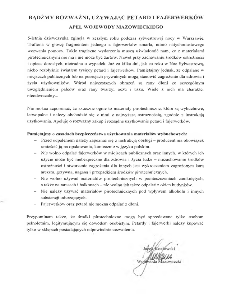 BĄDŹMY ROZWAŻNI, UŻYWAJĄC PETARD I FAJERWERKÓW APEL WOJEWODY MAZOWIECKIEGO 5-letnia dziewczynka zginęła w zeszłym roku podczas sylwestrowej nocy w Warszawie. Trafiona w głowę fragmentem jednego z fajerwerków zmarła, mimo natychmiastowego wezwania pomocy. Takie tragiczne wydarzenia muszą uświadomić nam, że z materiałami pirotechnicznymi nie ma i nie może być żartów. Nawet przy zachowaniu środków ostrożności i opiece dorosłych, nietrudno o wypadek. Już za kilka dni, jak co roku w Noc Sylwestrową, niebo rozbłyśnie światłem tysięcy petard i fajerwerków. Pamiętajmy jednak, że odpalane w miejscach publicznych lub na posesjach prywatnych mogą stanowić zagrożenie dla zdrowia i życia użytkowników. Wśród najczęstszych obrażeń są rany dłoni ze szczególnym uwzględnieniem palców oraz rany twarzy, oczu i uszu. Wiele z nich ma charakter nieodwracalny... Nie można zapominać, że sztuczne ognie to materiały pirotechniczne, które są wybuchowe, łatwopalne i należy obchodzić się z nimi z najwyższą ostrożnością zgodnie z instrukcją użytkowania. Apeluję o rozważny zakup i rozsądne użytkowanie petard i fajerwerków. Pamiętajmy o zasadach bezpieczeństwa użytkowania materiałów wybuchowych: - Przed odpaleniem należy zapoznać się z instrukcją obsługi - producent ma obowiązek umieścić ją na opakowaniu, koniecznie w języku polskim. - Nie wolno odpalać fajerwerków w miejscach publicznych oraz innych, w których ich użycie może być niebezpieczne dla zdrowia i życia ludzi - niezachowanie środków ostrożności i stworzenie zagrożenia dla innych jest wykroczeniem zagrożonym karą aresztu, grzywną naganą i przepadkiem środków pirotechnicznych. - Nie wolno używać materiałów pirotechnicznych w pomieszczeniach zamkniętych, - Nie należy używać materiałów pirotechnicznych pod wpływem alkoholu i innych - Fajerwerków oraz petard nie można odpalać z dłoni. a także na tarasach i balkonach - nie wolno ich także odpalać z okien budynków. substancji odurzających. Przypominam także, że środki pirotechniczne mogą być sprzedawane tylko osobom pełnoletnim, legitymującym się dowodem osobistym. Petardy i fajerwerki należy kupować tylko w sklepach posiadających odpowiednie zezwolenia.