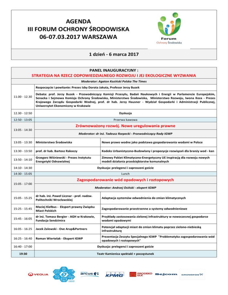 AGENDA III FORUM OCHRONY ŚRODOWISKA 06-07.03.2017 WARSZAWA 1 dzień - 6 marca 2017 PANEL INAUGURACYJNY : STRATEGIA NA RZECZ ODPOWIEDZIALNEGO ROZWOJU I JEJ EKOLOGICZNE WYZWANIA Moderator: Agaton Koziński Polska The Times Rozpoczęcie i powitanie: Prezes Izby Dorota Jakuta, Profesor Jerzy Buzek 11.00 - 12.30 Debata: prof. Jerzy Buzek - Przewodniczący Komisji Przesyłu, Badań Naukowych i Energii w Parlamencie Europejskim, Senacka i Sejmowa Komisja Ochrony Środowiska, Ministerstwo Środowiska, Ministerstwo Rozwoju, Iwona Koza - Prezes Krajowego Zarządu Gospodarki Wodnej, prof. dr hab. Jerzy Hausner - Wydział Gospodarki i Administracji Publicznej, Uniwersytet Ekonomiczny w Krakowie 12.30 - 12:50 Dyskusja 12:50 - 13:05 Przerwa kawowa Zrównoważony rozwój. Nowe uregulowania prawne 13:05 - 14:30 Moderator: dr inż. Tadeusz Rzepecki - Przewodniczący Rady IGWP 13:05 - 13:30 Ministerstwo Środowiska Nowe prawo wodne jako podstawa gospodarowania wodami w Polsce 13:30 - 13:50 prof. dr hab. Bartosz Rakoczy Kodeks Urbanistyczno-Budowlany i propozycje rozwiązań dla branży wod - kan 13:50 - 14:10 Grzegorz Wiśniewski - Prezes Instytutu Energetyki Odnawialnej Zimowy Pakiet Klimatyczno-Energetyczny UE inspiracją dla rozwoju nowych modeli działania przedsiębiorstw komunalnych 14:10 - 14:30 Dyskusja: prelegenci i zaproszeni goście 14:30 - 15:05 Lunch Zagospodarowanie wód opadowych i roztopowych 15:05 - 17:00 Moderator: Andrzej Osiński - ekspert IGWP 15:05 - 15:25 dr hab. inż. Paweł Licznar - prof. nadzw. Politechniki Wrocławskiej Adaptacja systemów odwodnienia do zmian klimatycznych 15:25 - 15:45 Maciej Kiełbus - Ekspert prawny Związku Miast Polskich Zagospodarowanie przestrzenne a systemy odwodnieniowe 15:45 - 16:05 dr inż. Tomasz Bergier - AGH w Krakowie, Fundacja Sendzimira Przykłady zastosowania zielonej infrastruktury w nowoczesnej gospodarce wodami opadowymi 16:05 - 16:25 Jacek Zalewski - Ove Arup&Partners Potencjał adaptacji miast do zmian klimatu poprzez zielono-niebieską infrastrukturę 16:25 - 16:40 Roman Wiertelak - Ekspert IGWP Prezentacja Zeszytu Specjalnego IGWP "Problematyka zagospodarowania wód opadowych i roztopowych" 16:40 - 17:00 Dyskusja: prelegenci i zaproszeni goście 19:30 Teatr Kamienica spektakl + poczęstunek 2 dzień - 7 marca 2017 Nowoczesna firma wodociągowa cz. I 9:30 - 12:10 Moderator: Piotr Ziętara -Wiceprezes Zarządu Miejskiego Przedsiębiorstwa Wodociągów i Kanalizacji S.A. w Krakowie 9:30 - 9:50 Tomasz Konieczny - Dyrektor Centrum Nowych Technologii MPWiK S.A. we Wrocławiu Projekty B+R praktycznym narzędziem do budowy innowacyjnej firmy wodociągowej 9:50 - 10:20 dr Paweł Chudziński - Prezes Zarządu Aquanet S.A. w Poznaniu Andrzej Osiński - Ekspert IGWP ds. benchmarkingu Benchmarking jako narzędzie zarządzania przedsiębiorstwem wod-kan 10:20 - 10:40 dr inż. Wojciech Koral - Politechnika Śląska Monitoring systemów i obiektów wodociągowych 10:40 - 11:00 Klara Ramm - menadżer rozwoju Veolia Praktyczne wdrożenia gospodarki w obiegu zamkniętym 11:00 - 11:30 Janusz Adamek - Prezes Zarządu Sądeckie Wodociągi Sp. z o.o. Rola zdalnych odczytów wodomierzy w optymalizacji działań firm Jan Buczkowski - Prezes MPECWiK Sp. z o.o. w Środzie wodociągowo-kanalizacyjnych Wielkopolskiej 11:30 - 11:50 Michał Wiktor Żmijewski - koordynator Piątka Sp. J. Przedsiębiorstwo wodociągowe w czasach transformacji cyfrowej 11:50 - 12:10 dyskusja: prelegenci i zaproszeni goście 12:10 - 12:25 Przerwa kawowa Nowoczesna firma wodociągowa cz. II 12:25 - 15:05 Moderator: dr Krzysztof Głuc - Wiceprezes Zarządu Sądeckich Wodociągów Sp. z o.o. 12:25 - 12:45 dr inż. Tadeusz Rzepecki - Prezes Zarządu Tarnowskie Wodociągi Sp. z o.o. 12:45 - 13:05 Andrzej Wójtowicz - Prezes Zarządu Wodociągi Słupsk Sp. Wyzwania strategiczne przedsiębiorstwa wodociągowego w z o.o. zmieniającej się rzeczywistości 13:05 - 13:25 13:25 - 13:45 Wykorzystanie środków europejskich: OZE metodą na obniżenie kosztów działalności na przykładzie Tarnowskich Wodociągów Mirosław Proppe - szef zespołu doradczego dla administracji publicznej i infrastruktury w Polsce i Europie Środkowo-Wschodniej KPMG w Polsce Sławomir Wasilewski - Kierownik Działu Technik Informatycznych w Pionie Wsparcia MPWIK w m. st. Warszawie S.A. Zarządzanie infrastrukturą wodociągowo-kanalizacyjną Wsparcie procesu eksploatacji sieci wodociągowej i kanalizacyjnej zintegrowanymi rozwiązaniami informatycznymi 14:05 - 14:25 dr inż. Marek Szelągowski - Akademia Finansów i Biznesu Vistula Zarządzanie procesowe w przedsiębiorstwie komunalnym perspektywy i możliwości 14:25 - 14:45 Andrzej Czernecki - Przewodniczący Związku Gmin Dorzecza Wisłoki Procesy konsolidacji zarządzania usługami wod-kan i ich efekty 14:45 - 15:05 dyskusja: prelegenci i zaproszeni goście zakończenie 15:05 LUNCH