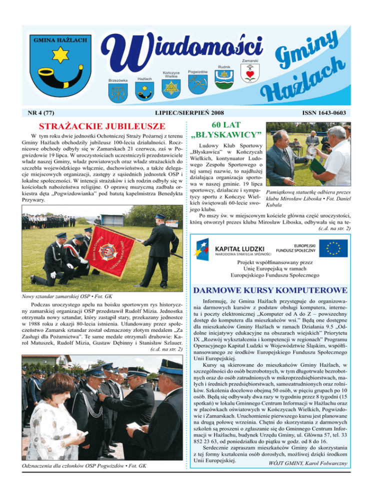 Wiadomości Gminy Hażlach, lipiec/sierpień 2008 Nr 4 (77) LIPIEC/SIERPIEŃ 2008 STRAŻACKIE JUBILEUSZE W tym roku dwie jednostki Ochotniczej Straży Pożarnej z terenu Gminy Hażlach obchodziły jubileusz 100-lecia działalności. Rocznicowe obchody odbyły się w Zamarskach 21 czerwca, zaś w Pogwizdowie 19 lipca. W uroczystościach uczestniczyli przedstawiciele władz naszej Gminy, władz powiatowych oraz władz strażackich do szczebla wojewódzkiego włącznie, duchowieństwo, a także delegacje miejscowych organizacji, zastępy z sąsiednich jednostek OSP i lokalne społeczności. W intencji strażaków i ich rodzin odbyły się w kościołach nabożeństwa religijne. O oprawę muzyczną zadbała orkiestra dęta „Pogwizdowianka” pod batutą kapelmistrza Benedykta Przywary. ISSN 1643-0603 60 LAT „BŁYSKAWICY” Ludowy Klub Sportowy „Błyskawica” w Kończycah Wielkich, kontynuator Ludowego Zespołu Sportowego o tej samej nazwie, to najdłużej działająca organizacja sportowa w naszej gminie. 19 lipca sportowcy, działacze i sympa- Pamiątkową statuetkę odbiera prezes tycy sportu z Kończyc Wiel- klubu Mirosław Liboska • Fot. Daniel kich świętowali 60-lecie swo- Kubala jego klubu. Po mszy św. w miejscowym kościele główna część uroczystości, którą otworzył prezes klubu Mirosław Liboska, odbywała się na te(c.d. na str. 2) Projekt współfinansowany przez Unię Europejską w ramach Europejskiego Funduszu Społecznego Nowy sztandar zamarskiej OSP • Fot. GK Podczas uroczystego apelu na boisku sportowym rys historyczny zamarskiej organizacji OSP przedstawił Rudolf Mizia. Jednostka otrzymała nowy sztandar, który zastąpił stary, przekazany jednostce w 1988 roku z okazji 80-lecia istnienia. Ufundowany przez społeczeństwo Zamarsk sztandar został odznaczony złotym medalem „Za Zasługi dla Pożarnictwa”. Te same medale otrzymali druhowie: Karol Matuszek, Rudolf Mizia, Gustaw Dębinny i Stanisław Szlauer. (c.d. na str. 2) Odznaczenia dla członków OSP Pogwizdów • Fot. GK DARMOWE KURSY KOMPUTEROWE Informuję, że Gmina Hażlach przystępuje do organizowania darmowych kursów z podstaw obsługi komputera, internetu i poczty elektronicznej „Komputer od A do Z – powszechny dostęp do komputera dla mieszkańców wsi.” Będą one dostępne dla mieszkańców Gminy Hażlach w ramach Działania 9.5 „Oddolne inicjatywy edukacyjne na obszarach wiejskich” Priorytetu IX „Rozwój wykształcenia i kompetencji w regionach” Programu Operacyjnego Kapitał Ludzki w Województwie Śląskim, współfinansowanego ze środków Europejskiego Funduszu Społecznego Unii Europejskiej. Kursy są skierowane do mieszkańców Gminy Hażlach, w szczególności do osób bezrobotnych, w tym długotrwale bezrobotnych oraz do osób zatrudnionych w mikroprzedsiębiorstwach, małych i średnich przedsiębiorstwach, samozatrudnionych oraz rolników. Szkolenia docelowo obejmą 50 osób, w pięciu grupach po 10 osób. Będą się odbywały dwa razy w tygodniu przez 8 tygodni (15 spotkań) w lokalu Gminnego Centrum Informacji w Hażlachu oraz w placówkach oświatowych w Kończycach Wielkich, Pogwizdowie i Zamarskach. Uruchomienie pierwszego kursu jest planowane na drugą połowę września. Chętni do skorzystania z darmowych szkoleń są proszeni o zgłaszanie się do Gminnego Centrum Informacji w Hażlachu, budynek Urzędu Gminy, ul. Główna 57, tel. 33 852 23 63, od poniedziałku do piątku w godz. od 8 do 16. Serdecznie zapraszam mieszkańców Gminy do skorzystania z tej formy kształcenia osób dorosłych, możliwej dzięki środkom Unii Europejskiej. WÓJT GMINY, Karol Folwarczny Wiadomości Gminy Hażlach, lipiec/sierpień 2008 STRAŻACKIE JUBILEUSZE 60 LAT „BŁYSKAWICY” (dok. ze str. 1) (dok. ze str. 1) Srebrnymi Medalami „Za Zasługi dla Pożarnictwa” zostali uhonorowani: Edward Zawada, Andrzej Gojniczek, Stanisław Pietrowski i Stanisław Baran. Za czynny udział w szkoleniu pożarniczym oraz osiągane wyniki odznakami „Strażak Wzorowy” zostali wyróżnieni: Łukasz Wisła, Jan Palac, Piotr Golasowski, Roman Misiarz, Mirosław Foldyna i Grzegorz Ligocki. Kolejnym miłym akcentem uroczystości było symboliczne przekazanie przez wójta Karola Folwarcznego kluczyków do nowego wozu bojowego marki „Magirus Deutz”. W remizie czynna była okolicznościowa wystawa pożarniczych akcesoriów, stworzona wspólnie ze Zdzisławem Wigłaszem z OSP Bobrek. Zamarscy strażacy z okazji jubileuszu wydali okolicznościowe widokówki. renie boiska sportowego. Uczestniczyli w niej przedstawiciele władz Gminy Hażlach, władz piłkarskich ze Skoczowa, Bielska-Białej i Katowic, powiatowego i wojewódzkiego Zrzeszenia Ludowych Zespołów Sportowych, a także radni, prezesi sąsiednich klubów, delegacje miejscowych organizacji i instytucji oraz mieszkańcy i sponsorzy. Z historią rozwoju działalności sportowej klubu i rozbudowy jego zaplecza zapoznał zebranych Józef Piekar. Jubileusz był okazją do uhonorowania najbardziej zasłużonych działaczy i sportowców medalami i odznakami przyznanymi przez władze Polskiego Związku Piłki Nożnej oraz Zrzeszenia LZS. Srebrną Odznakę PZPN przyznano: Wiesławowi Brachaczkowi, Władysławowi Czakonowi, Rudolfowi Machejowi, Józefowi Sufie i Antoniemu Trylskiemu, Brązową Odznakę PZPN: Franciszkowi Bierskiemu, Józefowi Foltynowi i Józefowi Piekarowi. Złotą Odznakę Śląskiego Związku Piłki Nożnej otrzymali: Antonina Stoły oraz Wójt Gminy Karol Folwarczny, Srebrną Odznakę: Daniel Kubala, Bolesław Kula, Bronisław Parchański, Leszek Smelik, Bogusław Sufa, Brązową Odznakę: Krzysztof i Tomasz Stoły. Honorowymi Odznakami Beskidzkiego Okręgowego Związku Piłki Nożnej uhonorowano 33 osoby. Odznakami „Zasłużony Działacz LZS” wyróżniono: Józefa Brachaczka, Władysława Czakona, Tadeusza Frydeckiego, Stanisława Jurgałę, Tadeusza Smelika i Władysława Żywczoka. Medale Zrzeszenia LZS odeb