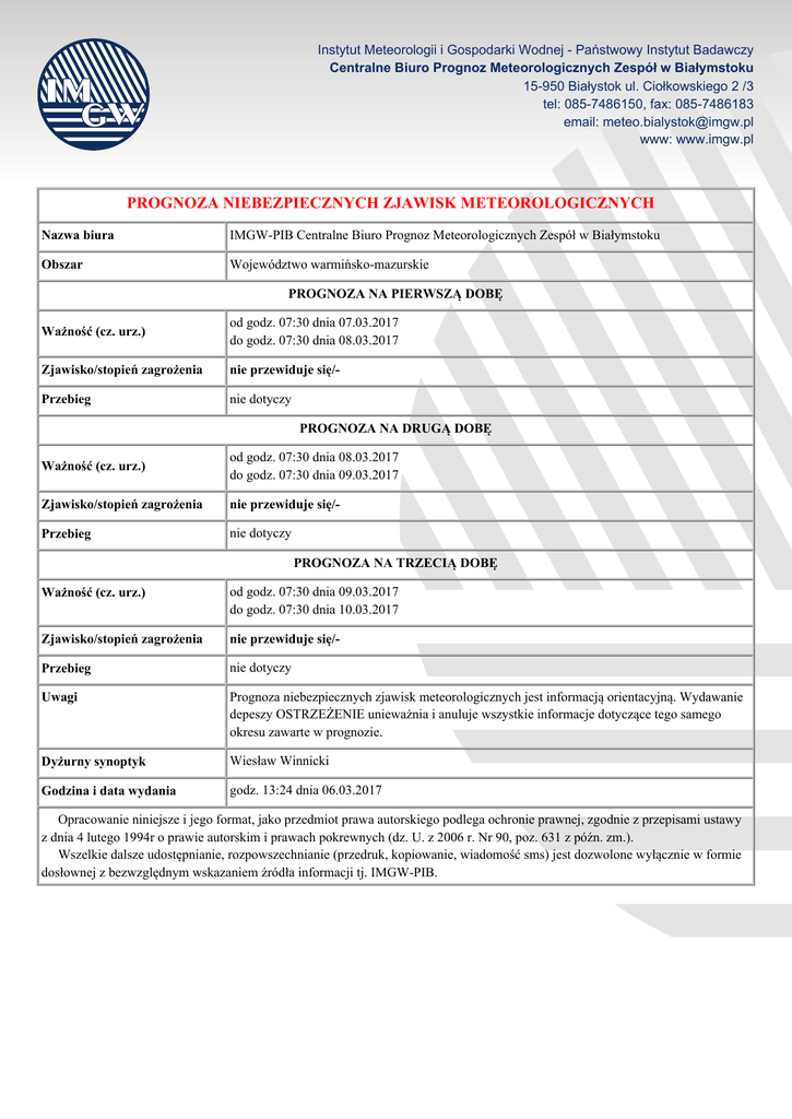 Instytut Meteorologii i Gospodarki Wodnej - Państwowy Instytut Badawczy Centralne Biuro Prognoz Meteorologicznych Zespół w Białymstoku 15-950 Białystok ul. Ciołkowskiego 2 /3 tel: 085-7486150, fax: 085-7486183 email: [email protected] www: www.imgw.pl PROGNOZA NIEBEZPIECZNYCH ZJAWISK METEOROLOGICZNYCH Nazwa biura IMGW-PIB Centralne Biuro Prognoz Meteorologicznych Zespół w Białymstoku Obszar Województwo warmińsko-mazurskie PROGNOZA NA PIERWSZĄ DOBĘ Ważność (cz. urz.) od godz. 07:30 dnia 07.03.2017 do godz. 07:30 dnia 08.03.2017 Zjawisko/stopień zagrożenia nie przewiduje się/- Przebieg nie dotyczy PROGNOZA NA DRUGĄ DOBĘ Ważność (cz. urz.) od godz. 07:30 dnia 08.03.2017 do godz. 07:30 dnia 09.03.2017 Zjawisko/stopień zagrożenia nie przewiduje się/- Przebieg nie dotyczy PROGNOZA NA TRZECIĄ DOBĘ Ważność (cz. urz.) od godz. 07:30 dnia 09.03.2017 do godz. 07:30 dnia 10.03.2017 Zjawisko/stopień zagrożenia nie przewiduje się/- Przebieg nie dotyczy Uwagi Prognoza niebezpiecznych zjawisk meteorologicznych jest informacją orientacyjną. Wydawanie depeszy OSTRZEŻENIE unieważnia i anuluje wszystkie informacje dotyczące tego samego okresu zawarte w prognozie. Dyżurny synoptyk Wiesław Winnicki Godzina i data wydania godz. 13:24 dnia 06.03.2017 Opracowanie niniejsze i jego format, jako przedmiot prawa autorskiego podlega ochronie prawnej, zgodnie z przepisami ustawy z dnia 4 lutego 1994r o prawie autorskim i prawach pokrewnych (dz. U. z 2006 r. Nr 90, poz. 631 z późn. zm.). Wszelkie dalsze udostępnianie, rozpowszechnianie (przedruk, kopiowanie, wiadomość sms) jest dozwolone wyłącznie w formie dosłownej z bezwzględnym wskazaniem źródła informacji tj. IMGW-PIB.