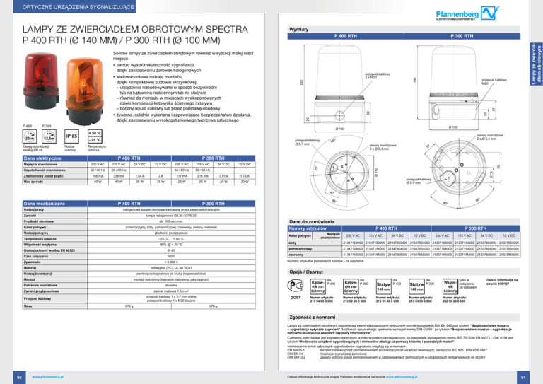 Optyczne urządzenia sygnalizujące Wymiary P 400 RTH P 300 RTH Lampy ze zwierciadłem obrotowym Lampy ze zwierciadłem obrotowym SPECTRA P 400 RTH (Ø 140 mm) / P 300 RTH (Ø 100 mm) Solidne lampy ze zwierciadłem obrotowym również w sytuacji małej ilości miejsca • bardzo wysoka skuteczność sygnalizacji, dzięki zastosowaniu żarówek halogenowych Temperatura robocza 230 V AC 115 V AC Częstotliwość znamionowa 50 / 60 Hz 50 / 60 Hz 186 mA 338 mA 1,54 A 40 W 40 W 35 W Znamionowy pobór prądu Moc żarówki P 300 RTH 24 V DC 12 V DC 230 V AC 115 V AC 50 / 60 Hz 50 / 60 Hz 24 V DC 12 V DC 3A 117 mA 35 W 25 W 216 mA 0,91 A 1,72 A 25 W 20 W 20 W 55 P 400 RTH Napięcie znamionowe otwory montażowe 3 x Ø 5,4 mm 27,5 Dane elektryczne otwory montażowe 2 x Ø 5,4 mm ° 120 przepust kablowy Ø 5-7 mm 27 Rodzaj ochrony - 25 °C Ø 110 Zasięg sygnalizacji według EN 54 IP 65 Ø 100 Ø 140 + 50 °C 25° r= 12,5m 20 58 20 P 300 r= 20 m przepust kablowy M20 37 220 • żywotna, solidnie wykonana i zapewniająca bezpieczeństwo działania, dzięki zastosowaniu wysokogatunkowego tworzywa sztucznego P 400 150 przepust kablowy 2 x M20 • wielowariantowe rodzaje montażu, dzięki kompaktowej budowie skrzynkowej: – urządzenia nabudowywane w sposób bezpośredni lub na kątowniku naściennym lub na statywie – również do montażu w miejscach wyeksponowanych dzięki kombinacji kątownika ściennego i statywu – boczny wpust kablowy lub przez podstawę obudowy przepust kablowy Ø 5-7 mm 47 Dane mechaniczne Rodzaj pracy P 400 RTH lampa halogenowa G6,35 / GY6,35 Prędkość obrotowa Dane do zamówienia ok. 180 obr./min. przezroczysty, żółty, pomarańczowy, czerwony, zielony, niebieski Rodzaj pokrywy gładkość, przejrzystość Temperatura robocza - 25 °C ... + 50 °C Wilgotność względna 90% @ + 20 °C Rodzaj ochrony według EN 60529 IP 65 Czas załączania 100% Żywotność 230 V AC 115 V AC 24 V DC 12 V DC 21347103000 21347153000 21347803000 21347853000 21337103000 21337153000 21337803000 21337853000 czerwony 21347105000 21347155000 21347805000 21347855000 21337105000 21337155000 21337805000 21337855000 dla przepust kablowy 1 x 5-7 mm dolne; przepust kablowy 1 x M20 boczne 578 g P 300 RTH 12 V DC 21347104000 21347154000 21347804000 21347854000 21337104000 21337154000 21337804000 21337854000 zaciski śrubowe 1,5 mm2 Przepust kablowy 24 V DC żółty dowolna Zaciski przyłączeniowe 115 V AC pomarańczowy montaż naścienny (kątownik naścienny, jako osprzęt) Położenie montażowe 230 V AC Opcje / Osprzęt zamknięcie bagnetowe ze śrubą bezpieczeństwa Montaż P 400 RTH Napięcie znamionowe Numery artykułów pozostałych kolorów - na zapytanie poliwęglan (PC), UL 94 VO f1 Rodzaj konstrukcji Numery artykułów Kolor pokrywy > 5.000 h Materiał Masa ° 60 45° halogenowe światło obrotowe kierowane przez zwierciadło rotacyjne Żarówki Kolor pokrywy 85° P 300 RTH GOST dla Kątow- P 400 nik naścienny Kątow- P 300 nik naścienny Numer artykułu: 213 94 00 0 000 Numer artykułu: 213 92 00 0 000 Statyw dla P 400 145 mm Numer artykułu: 213 95 00 0 000 Statyw dla P 300 140 mm Numer artykułu: 213 93 00 0 000 tylko w Wspor- połączeniu nik ze statywem ścienny Dalsze informacje na stronie 106/107 Numer artykułu: 282 50 20 0 000 370 g Zgodność z normami Lampy ze zwierciadłem obrotowym odpowiadają swymi właściwościami optycznymi normie europejskiej DIN EN 842 pod tytułem “Bezpieczeństwo maszyn – sygnalizacja optyczna zagrożeń“. Możliwość opcjonalnego spełnienia wymagań normy DIN EN 981 po tytułem “Bezpieczeństwo maszyn – sygnalizacja optyczno-akustyczna zagrożeń i sygnały informacyjne“. Czerwony kolor świateł jest sygnałem awaryjnym, a żółty sygnałem ostrzegawczym, co odpowiada wymaganiom normy IEC 73 / DIN EN 60073 / VDE 0199 pod tytułem “Kodowanie urządzeń sygnalizacyjnych i elementów obsługi za pomocą kolorów i pozostałych metod“. Informacje na temat optycznych sygnalizatorów zagrożenia znajdują się w normach: EN 60825-1 Bezpieczeństwo przed promieniowaniem pochodzącym od urządzeń laserowych, identyczne IEC 825 i DIN-VDE 0837 DIN EN 54Instalacje sygnalizacji pożarowej DIN 54113-2Zasady ochrony przed promieniowaniem w zastosowaniach technicznych w urządzeniach rentgenowskich do 500 kV 90 www.pfannenberg.pl Dalsze informacje techniczne znajdą Państwo w internecie na stronie www.pfannenberg.pl 91