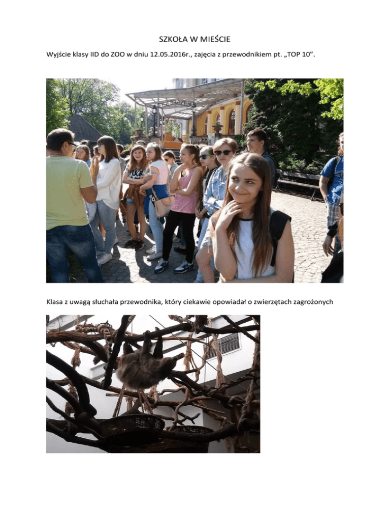SZKOŁA W MIEŚCIE Wyjście klasy IID do ZOO w dniu 12.05.2016r., zajęcia z przewodnikiem pt. „TOP 10”. Klasa z uwagą słuchała przewodnika, który ciekawie opowiadał o zwierzętach zagrożonych wyginięciem lub pozbawionych wolności. Najciekawszym miejscem, które odwiedziliśmy była małpiarnia, gdzie spotkaliśmy leniwca. W ramach zajęd obejrzeliśmy ptaki zagrożone wyginięciem. Wszystkich rozbawił gibon, który popisywał się swoimi zdolnościami przed klasą. Odwiedziliśmy terrarium, gdzie mieliśmy kilka minut, aby obejrzed przeróżne gatunki zwierząt. W ramach zwiedzania terrarium oglądaliśmy motyle, które chętnie siadały na rękach. Na koniec wypełniliśmy karty pracy dotyczące zwierząt, o których mieliśmy zajęcia, po czym odwiedziliśmy Afrykarium. Wycieczka bardzo nam się podobała. Była ona miłą ucieczką od zajęd w szkole. Nauczyliśmy się także wiele o zwierzętach i o tym jak łatwo możemy im zagrozid. Przekonaliśmy się, że warto dbad o ich spokojne życie i ich środowisko naturalne. Mamy nadzieję, że wkrótce ponownie wybierzemy się na taką wycieczkę. Tekst: Gabriela Milejska, Anna Kulesza Kl.IID Fot.: Mateusz Przysłup, Aurelia Władczyk Kl.IID