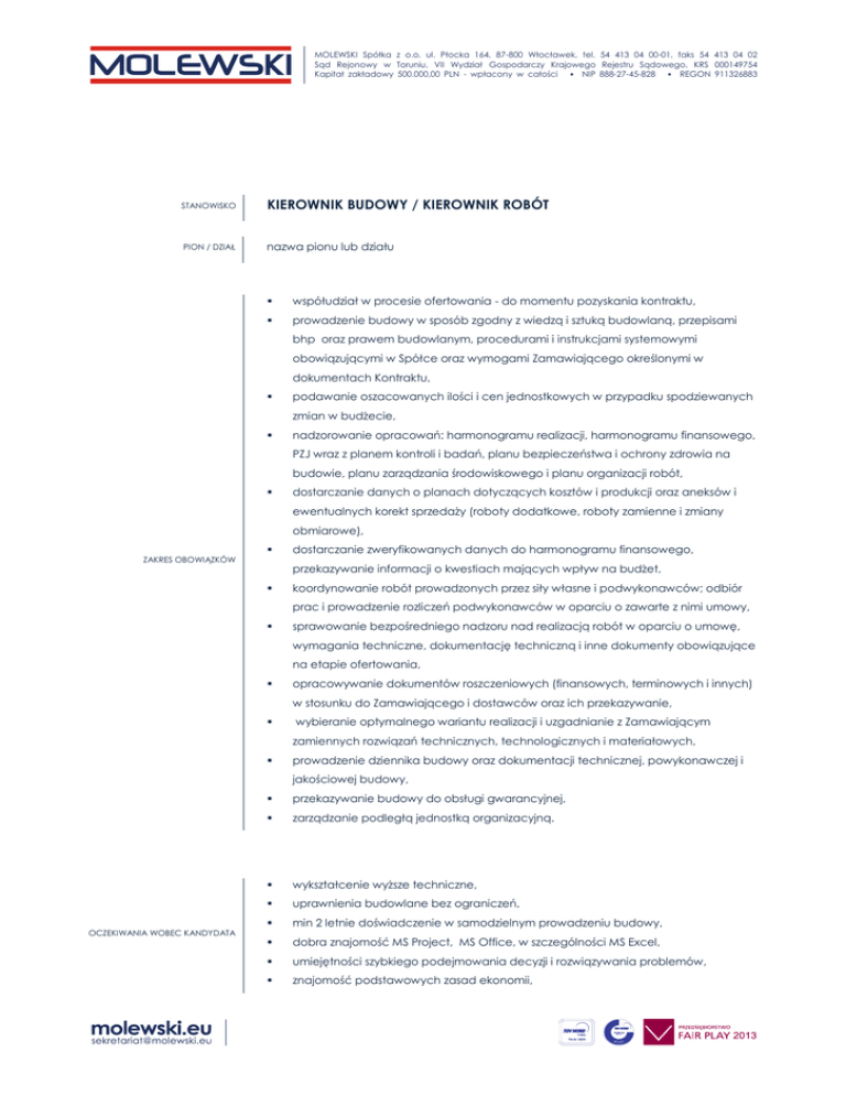 MOLEWSKI Spółka z o.o. ul. Płocka 164, 87-800 Włocławek, tel. 54 413 04 00-01, faks 54 413 04 02 Sąd Rejonowy w Toruniu, VII Wydział Gospodarczy Krajowego Rejestru Sądowego, KRS 000149754 Kapitał zakładowy 500.000,00 PLN - wpłacony w całości • NIP 888-27-45-828 • REGON 911326883 STANOWISKO KIEROWNIK BUDOWY / KIEROWNIK ROBÓT PION / DZIAŁ nazwa pionu lub działu współudział w procesie ofertowania - do momentu pozyskania kontraktu, prowadzenie budowy w sposób zgodny z wiedzą i sztuką budowlaną, przepisami bhp oraz prawem budowlanym, procedurami i instrukcjami systemowymi obowiązującymi w Spółce oraz wymogami Zamawiającego określonymi w dokumentach Kontraktu, podawanie oszacowanych ilości i cen jednostkowych w przypadku spodziewanych zmian w budżecie, nadzorowanie opracowań: harmonogramu realizacji, harmonogramu finansowego, PZJ wraz z planem kontroli i badań, planu bezpieczeństwa i ochrony zdrowia na budowie, planu zarządzania środowiskowego i planu organizacji robót, dostarczanie danych o planach dotyczących kosztów i produkcji oraz aneksów i ewentualnych korekt sprzedaży (roboty dodatkowe, roboty zamienne i zmiany obmiarowe), ZAKRES OBOWIĄZKÓW dostarczanie zweryfikowanych danych do harmonogramu finansowego, przekazywanie informacji o kwestiach mających wpływ na budżet, koordynowanie robót prowadzonych przez siły własne i podwykonawców; odbiór prac i prowadzenie rozliczeń podwykonawców w oparciu o zawarte z nimi umowy, sprawowanie bezpośredniego nadzoru nad realizacją robót w oparciu o umowę, wymagania techniczne, dokumentację techniczną i inne dokumenty obowiązujące na etapie ofertowania, opracowywanie dokumentów roszczeniowych (finansowych, terminowych i innych) w stosunku do Zamawiającego i dostawców oraz ich przekazywanie, wybieranie optymalnego wariantu realizacji i uzgadnianie z Zamawiającym zamiennych rozwiązań technicznych, technologicznych i materiałowych, prowadzenie dziennika budowy oraz dokumentacji technicznej, powykonawczej i jakościowej budowy, OCZEKIWANIA WOBEC KANDYDATA przekazywanie budowy do obsługi gwarancyjnej, zarządzanie podległą jednostką organizacyjną. wykształcenie wyższe techniczne, uprawnienia budowlane bez ograniczeń, min 2 letnie doświadczenie w samodzielnym prowadzeniu budowy, dobra znajomość MS Project, MS Office, w szczególności MS Excel, umiejętności szybkiego podejmowania decyzji i rozwiązywania problemów, znajomość podstawowych zasad ekonomii, strona: 2 z 2 OFERUJEMY FORMA SKŁADANIA APLIKACJI umiejętności negocjacyjne, mobilność na terenie Polski zatrudnienie w rozwijającej się i nowocześnie zarządzanej firmie, stabilne warunki zatrudnienia, możliwość zdobycia doświadczenia i rozwoju zawodowego. osobiście: siedziba firmy ul. Płocka 164,87-800 Włocławek e-mail: [email protected]
