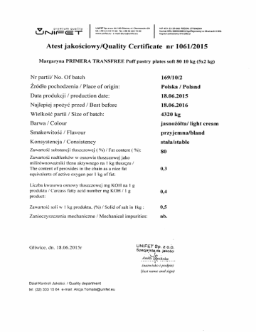 Atest jakościowy/Quality Certificate nr 1 06|/2015