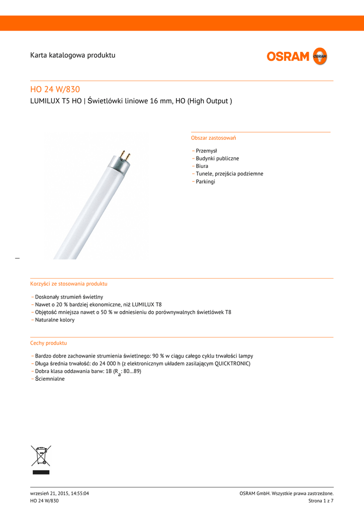 Karta katalogowa produktu HO 24 W/830 LUMILUX T5 HO | Świetlówki liniowe 16 mm, HO (High Output ) Obszar zastosowań _ Przemysł _ Budynki publiczne _ Biura _ Tunele, przejścia podziemne _ Parkingi __ Korzyści ze stosowania produktu _ Doskonały strumień świetlny _ Nawet o 20 % bardziej ekonomiczne, niż LUMILUX T8 _ Objętość mniejsza nawet o 50 % w odniesieniu do porównywalnych świetlówek T8 _ Naturalne kolory Cechy produktu _ Bardzo dobre zachowanie strumienia świetlnego: 90 % w ciągu całego cyklu trwałości lampy _ Długa średnia trwałość: do 24 000 h (z elektronicznym układem zasilającym QUICKTRONIC) _ Dobra klasa oddawania barw: 1B (R : 80…89) a _ Ściemnialne wrzesień 21, 2015, 14:55:04 HO 24 W/830 OSRAM GmbH. Wszystkie prawa zastrzeżone. Strona 1 z 7 Karta katalogowa produktu Dane techniczne Dane elektryczne Moc znamionowy 24,0 W Znamionowa skuteczność świetlna (SE 25 78 lm/W Moc znamionowa 22,50 W Dane fotometryczne __ Ogólny wskaźnik oddawania barw Ra ≥80 Znamionowy strumień świetlny 1750 lm Str. świetlny znam. w temp. otocz. 25 ° 1750 lm Str. świetlny znam. w temp. otocz. 35 ° 2000 lm Barwa światła 830 Temperatura barwowa 3000 K Znamionowy strumień świetlny 1750 lm Barwa światła zgodna z EN 12464-1 LUMILUX Warm White Wsp. zachow. str. świetlnego po 2 000 h 0,95 Wsp. zachow. str. świetlnego po 4 000 h 0,93 Wsp. zachow. str. świetlnego po 6 000 h 0,92 Wsp. zachow. str. świetlnego po 8 000 h 0,90 Wsp. zachow. str. świetlnego po 12 000 h 0,90 Wsp. zachow. str. świetlnego po 16 000 h 0,90 Wsp. zachow. str. świetlnego po 20 000 h 0,89 Wymiary i waga Średnica rury 16 mm Długość 549,0 mm Długość bez trzonka pinowego/połączenie 549,00 mm Średnica 16,0 mm wrzesień 21, 2015, 14:55:04 HO 24 W/830 OSRAM GmbH. Wszystkie prawa zastrzeżone. Strona 2 z 7 Karta katalogowa produktu Maksymalna średnica 16,0 mm Temperatury i warunki pracy Temp. otoczenia, maks. str. świetlny 35,0 °C Trwałość Trwałość użytkowa 19000 h 1) Trwałość 24000 h 1) Współczynnik trwałości po 2 000 h 0,99 Współczynnik trwałości po 4 000 h 0,99 Współczynnik trwałości po 6 000 h 0,99 Współczynnik trwałości po 8 000 h 0,99 Współczynnik trwałości po 12 000 h 0,99 Współczynnik trwałości po 16 000 h 0,97 Współczynnik trwałości po 20 000 h 0,85 Tryb pracy LLMF/LSF HF Trwałość 24000 h Znamionowa trwałość 24000 h 1) Start na gorąco EUZ __ Dodatkowe dane produktu Trzonek (standardowe rozwiązanie) G5 Nominalna zawartość rtęci 1,5 mg Zgodnie z Dyrektywą WEEE Tak Uwaga dotycząca produktu Do zasilania tylko przez elektroniczny układ zasilający (EUZ)/Lampy przeznaczone do opraw o temperaturze wewnętrznej w zakresie 30…40 °C; optymalny strumień świetlny osiąga w temperaturze 35 °C Możliwości Ściemnianie Tak Do zastosowania w oświetleniu wew. Tak Certyfikaty i Normy Klasa efektywności energetycznej A Zużycie energii 25 kWh/1000h wrzesień 21, 2015, 14:55:04 HO 24 W/830 OSRAM GmbH. Wszystkie prawa zastrzeżone. Strona 3 z 7 Karta katalogowa produktu Rozsył światła Rozkład widmowy promieniowania __ System Gwarancji Gwarancja Systemowa OSRAM + w połączeniu z elektronicznymi układami zasilającymi OSRAM Gwarancja Instrukcja bezpieczeństwa W przypadku zbicia lampy: www.osram.com/brokenlamp wrzesień 21, 2015, 14:55:04 HO 24 W/830 OSRAM GmbH. Wszystkie prawa zastrzeżone. Strona 4 z 7 Karta katalogowa produktu Opcje kontroli Opcje kontroli Dane logistyczne __ Kod produktu Opis produktu Opakowanie (liczba produktów / opakowanie) Wymiary (długość x szerokość x wysokość) Objętość Waga brutto 4050300453491 HO 24 W/830 Karton wysylkowy 40 600 mm x 88 mm x 194 mm 10.24 dm³ 2485.00 g 4050300591667 HO 24 W/830 Karton wysylkowy 20 587 mm x 90 mm x 110 mm 5.81 dm³ 1473.00 g Wymieniony kod produktu oznacza najmniejszą ilość produktu, jaka może być zamówiona. Jednostka transportowa może zawierać jedną sztukę lub więcej. Składając zamówienie prosimy o zamawianie ilości odpowiadających jednej lub wielokrotności jednostki transportowej. Odnośniki/łącza Więcej informacji na temat elektronicznych układów zasilających QUICKTRONIC na stronie www.osram.com/QUICKTRONIC Oświadczenie Zastrzega się możliwość zmian bez uprzedzenia. Błędy i ominięcia są możliwe. Należy zawsze upewnić się czy korzystasz z najnowszej wersji katalogu. wrzesień 21, 2015, 14:55:04 HO 24 W/830 OSRAM GmbH. Wszystkie prawa zastrzeżone. Strona 5 z 7 Karta katalogowa produktu HO 24 W/830 LUMILUX T5 HO | Świetlówki liniowe 16 mm, HO (High Output ) Nazwa produktu Nazwa produktu EUZ EAN Prąd znamionow y Straty mocy Str. świetlny znam. w temp. otocz. 35 ° Liczba źródeł światła HO 24 W/830 QT-ECO 1x18-24/220-240 L 4050300660417 0.15 A 20.00 W 1600 lm 1 QT-ECO 1x18-24/220-240 S 4050300638560 0.15 A 20.00 W 1600 lm 1 QT-FIT 5/8 1x18-39 4008321873927 0.13 A 28.00 W 1750 lm 1 QT-FIT 5/8 2x18-39 4008321873903 0.24 A 53.00 W 1750 lm 2 QTi 1x14/24/21/39 GII 4008321383334 0.12 A 26.00 W 1750 lm 1 QTi 1x14/24 DIM 4050300870922 0.11 A 26.00 W 1750 lm 1 QTi 2x14/24/21/39 GII 4008321383396 0.23 A 50.00 W 1750 lm 2 QTi 2x14/24 DIM 4050300870946 0.22 A 50.00 W 1750 lm 2 QTi 3x14/24 DIM 4008321069719 0.32 A 74.00 W 1750 lm 3 QTi 4x14/24 DIM 4008321069993 0.43 A 98.00 W 1750 lm 4 QTi DALI 1x14/24 DIM 4050300870380 0.11 A 25.30 W 1750 lm 1 QTi DALI 2x14/24 DIM 4050300870861 0.22 A 49.30 W 1750 lm 2 QTi DALI 3x14/24 DIM 4008321069955 0.32 A 73.40 W 1750 lm 3 QTi DALI 4x14/24 DIM 4008321070036 0.43 A 97.60 W 1750 lm 4 QT-M 2x26-42/220-240 S 4008321110022 0.23 A 54.00 W 3500 lm 2 QTP5 1x24-39 4008321329110 0.12 A 26.00 W 1750 lm 1 QTP5 2x24-39 4008321329417 0.23 A 49.00 W 1750 lm 2 QTP-M 1x26-42 4008321329134 0.12 A 25.00 W 1750 lm 1 __ wrzesień 21, 2015, 14:55:04 HO 24 W/830 OSRAM GmbH. Wszystkie prawa zastrzeżone. Strona 6 z 7 Karta katalogowa produktu Nazwa produktu Nazwa produktu EUZ EAN Prąd znamionow y Straty mocy S