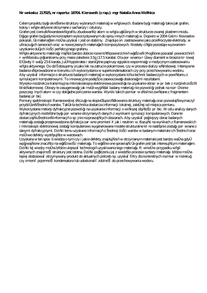 Nr wniosku: 217025, nr raportu: 18704. Kierownik (z rap.): mgr Natalia Anna Woźnica Celem projektu było określenie struktury wybranych materiałów węglowych. Badane były materiały takie jak grafen, koksy i węgle aktywne otrzymane z sacharozy i celulozy. Grafen jest cieniutką warstewką grafitu zbudowaną z atomów węgla ułożonych w strukturze zwanej plastrem miodu. Długo grafen był jedynie konceptem wykorzystywanym do opisu innych materiałów. Dopiero w 2004 Geim i Novoselov pokazali, że materiał ten można uzyskać i jest on stabilny. Znajduje on zastosowanie jako przeźroczyste elektrody, w ultraczułych sensorach oraz w nowoczesnych materiałach kompozytowych. Niestety ciągle pozostaje wyzwaniem uzyskanie dużych ilości perfekcyjnego grafenu. Węgle aktywne to materiały mające bardzo dobrze rozwiniętą powierzchnię właściwą. Mogą one posiadać powierzchnię równą boisku piłkarskiemu przy masie zaledwie 3.5g (17.5 karata). Dla porównania różowy diament w broszce królowej Elżbiety II waży 23.6 karata. Już Hippokrates i starożytne papirusy egipskie wspominały o medycznym zastosowaniu węgla aktywnego. Do dziś stosujemy je jako lek na zatrucie pokarmowe, czy w procesie dializy wątrobowej. Intensywne badania są prowadzone w kierunku ich wykorzystania w superkondensatorach czy przy przechowywaniu wodoru. Aby uzyskać informacje o strukturze badanych materiałów wykorzystano kilka technik badawczych w powiązaniu z symulacjami komputerowymi. To innowacyjne podejście zaowocowało doskonałymi rezultatami. Wysoko-rozdzielcza transmisyjna mikroskoskopia elektronowa pozwoliła na uzyskanie obrazów próbek z rozdzielczością bliską atomowej. Obrazy te zasugerowały jak może wyglądać badany materiał, nie pozwoliły jednak na rozróżnienie poszczególnych atomów czy dokładne policzenie warstw. Wyniki takich pomiarów są silnie związane z fragmentem badanej próbki. Pomiary spektroskopii Ramanowskiej są czułe na stopień uporządkowania struktury materiału oraz pozwalają wyznaczyć przybliżoną średnicę warstw. Także ta technika dostarcza informacji lokalnej, zależnej od miejsca pomiaru. Wykorzystane metody dyfrakcyjne pozwoliły na uzyskanie informacji o większej objętości próbki. W celu analizy danych dyfrakcyjnych niezbędne było porównanie otrzymanych danych z wynikami symulacji komputerowych. Dane te dostarczają uśrednioną informację o spójnie rozpraszających obszarach. Aby uzyskać pełniejszy obraz badanych materiału została przeprowadzona dyfrakcja zarówno promieni X jak i neutronów. Bazując na wynikach z Ramanowskich i mikroskopii elektronowej zostały komputerowo wygenerowane modele strukturalne które następnie zostały porównane z danymi dyfrakcyjnymi. Dzięki temu uzyskano informację o średniej ilości warstw w badanym materiale ich średnicę oraz możliwe defekty występujące w warstwach. Uzyskana w ten sposób wiedza o tym czy i jakie defekty znajdują się w otrzymanym materiale jest bardzo ważna gdyż wpływają one znacząco na właściwości materiału. To właśnie one sprawiają, że grafen jest tak interesującym materiałem. Dzięki tej wiedzy można będzie ulepszać technologię uzyskiwania tego materiału. Również w przypadku węgli aktywnych znajomość struktury jest istotna. Dzięki połączeniu jej z wiedzą o procesie syntezy materiału będzie można lepiej dostosować otrzymywany produkt do aktualnych potrzeb np. uzyskać filtry dla konkretnych rozmiarów molekuł czy zmienić pojemność kondensatora lub udoskonalić zdolność do przechowywania wodoru.