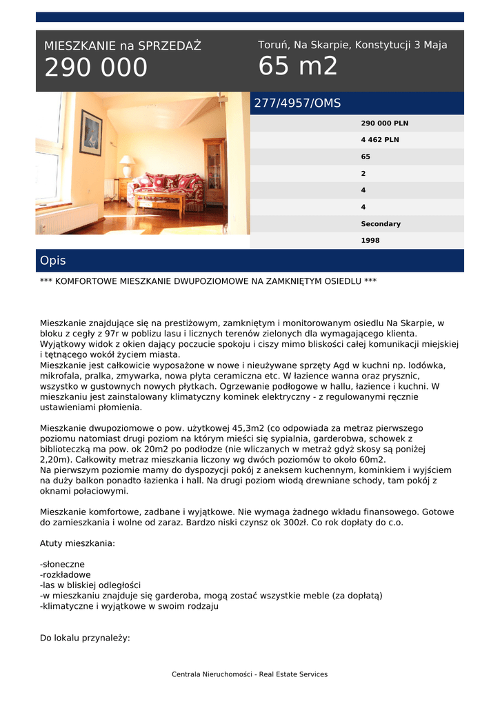 MIESZKANIE na SPRZEDAŻ 290 000 Toruń, Na Skarpie, Konstytucji 3 Maja 65 m2 277/4957/OMS 290 000 PLN 4 462 PLN 65 2 4 4 Secondary 1998 Opis *** KOMFORTOWE MIESZKANIE DWUPOZIOMOWE NA ZAMKNIĘTYM OSIEDLU *** Mieszkanie znajdujące się na prestiżowym, zamkniętym i monitorowanym osiedlu Na Skarpie, w bloku z cegły z 97r w poblizu lasu i licznych terenów zielonych dla wymagającego klienta. Wyjątkowy widok z okien dający poczucie spokoju i ciszy mimo bliskości całej komunikacji miejskiej i tętnącego wokół życiem miasta. Mieszkanie jest całkowicie wyposażone w nowe i nieużywane sprzęty Agd w kuchni np. lodówka, mikrofala, pralka, zmywarka, nowa płyta ceramiczna etc. W łazience wanna oraz prysznic, wszystko w gustownych nowych płytkach. Ogrzewanie podłogowe w hallu, łazience i kuchni. W mieszkaniu jest zainstalowany klimatyczny kominek elektryczny - z regulowanymi ręcznie ustawieniami płomienia. Mieszkanie dwupoziomowe o pow. użytkowej 45,3m2 (co odpowiada za metraz pierwszego poziomu natomiast drugi poziom na którym mieści się sypialnia, garderobwa, schowek z biblioteczką ma pow. ok 20m2 po podłodze (nie wliczanych w metraż gdyż skosy są poniżej 2,20m). Całkowity metraz mieszkania liczony wg dwóch poziomów to około 60m2. Na pierwszym poziomie mamy do dyspozycji pokój z aneksem kuchennym, kominkiem i wyjściem na duży balkon ponadto łazienka i hall. Na drugi poziom wiodą drewniane schody, tam pokój z oknami połaciowymi. Mieszkanie komfortowe, zadbane i wyjątkowe. Nie wymaga żadnego wkładu finansowego. Gotowe do zamieszkania i wolne od zaraz. Bardzo niski czynsz ok 300zł. Co rok dopłaty do c.o. Atuty mieszkania: -słoneczne -rozkładowe -las w bliskiej odległości -w mieszkaniu znajduje się garderoba, mogą zostać wszystkie meble (za dopłatą) -klimatyczne i wyjątkowe w swoim rodzaju Do lokalu przynależy: Centrala Nieruchomości - Real Estate Services balkon, piwnica Opis budynku: Czteropiętrowy blok z cegły oddany do użytku w 1997 roku. Opis lokalizacji: Komunikacja: liczne linie autobusowe, linie tramwajowe. Tereny rekreacyjne: las, ścieżki rowerowe, fitness, basen. W okolicy liczne punkty usługowe, sklepy, szkoły, przedszkola, apteka. Dostępne media: TV kablowa, internet, kanalizacja, prąd, woda ciepła, woda zimna, c.o. Cena do negocjacji!!! ***************** KAROLINA RUTKOWSKA TEL 663 899 715 *********************************** Centrala Nieruchomości: ZAPEWNIAMY BEZPŁATNE I PROFESJONALNE DORADZTWO ZARÓWNO W ZAKRESIE NIERUCHOMOŚCI JAK I POZYSKIWANIU POD NIE KREDYTÓW HIPOTECZNYCH Powyższe informacje zostały sporządzone na podstawie oświadczeń właścicieli i nie są ofertą w rozumieniu przepisów Kodeksu Cywilnego. Mają one jedynie charakter informacyjny. Większość naszych klientów pochodzi z polecenia - ZAUFAJ NAM I TY I NIE CZEKAJ, AŻ KTOŚ CIĘ WYPRZEDZI! Zadzwoń i umów się na prezentację ! Nr licencji pośrednika odpowiedzialnego za wykonanie umowy pośrednictwa 14260. zobacz inne nasze oferty na www.centralanieruchomosci.pl facebook.com/Centrala.N Karolina Rutkowska tel. (+48) 663 899 715 email: [email protected] Centrala Nieruchomości - Real Estate Services Powered by TCPDF (www.tcpdf.org)