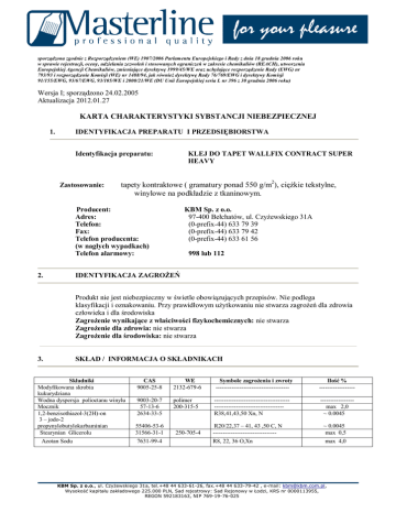 sporządzona zgodnie z Rozporządzeniem (WE) 1907/2006 Parlamentu Europejskiego i Rady z dnia 18 grudnia 2006 roku w sprawie rejestracji, oceny, udzielania zezwoleń i stosowanych ograniczeń w zakresie chemikaliów (REACH), utworzenia Europejskiej Agencji Chemikaliów, zmieniające dyrektywę 1999/45/WE oraz uchylające rozporządzenie Rady (EWG) nr 793/93 i rozporządzenie Komisji (WE) nr 1488/94, jak również dyrektywę Rady 76/769/EWG i dyrektywy Komisji 91/155/EWG, 93/67/EWG, 93/105/WE i 2000/21/WE (DU Unii Europejskiej seria L nr 396 z 30 grudnia 2006 roku) Wersja I; sporządzono 24.02.2005 Aktualizacja 2012.01.27 KARTA CHARAKTERYSTYKI SYBSTANCJI NIEBEZPIECZNEJ 1. IDENTYFIKACJA PREPARATU I PRZEDSIĘBIORSTWA Identyfikacja preparatu: Zastosowanie: KLEJ DO TAPET WALLFIX CONTRACT SUPER HEAVY tapety kontraktowe ( gramatury ponad 550 g/m2), ciężkie tekstylne, winylowe na podkładzie z tkaninowym. Producent: Adres: Telefon: Fax: Telefon producenta: (w nagłych wypadkach) Telefon alarmowy: 2. KBM Sp. z o.o. 97-400 Bełchatów, ul. Czyżewskiego 31A (0-prefix-44) 633 79 39 (0-prefix-44) 633 79 42 (0-prefix-44) 633 61 56 998 lub 112 IDENTYFIKACJA ZAGROŻEŃ Produkt nie jest niebezpieczny w świetle obowiązujących przepisów. Nie podlega klasyfikacji i oznakowaniu. Przy prawidłowym użytkowaniu nie stwarza zagrożeń dla zdrowia człowieka i dla środowiska Zagrożenie wynikające z właściwości fizykochemicznych: nie stwarza Zagrożenie dla zdrowia: nie stwarza Zagrożenie dla środowiska: nie stwarza 3. SKŁAD / INFORMACJA O SKŁADNIKACH Składniki Modyfikowana skrobia kukurydziana Wodna dyspersja polioctanu winylu Mocznik 1,2-benzisothiazol-3(2H)-on 3 – jodo-2 propynylobutylokarbaminian Stearynian Glicerolu Azotan Sodu CAS 9005-25-8 WE 2132-679-6 Symbole zagrożenia i zwroty ------------------------------------- Ilość % ------------------ 9003-20-7 57-13-6 2634-33-5 polimer 200-315-5 -----------------------------------------------------------------------R38,41,43,50 Xn, N ----------------max 2,0 ~ 0.0045 55406-53-6 31566-31-1 7631-99-4 250-705-4 R20/22,37 – 41, 43 ,50 C, N -------------------------------- ~ 0.0045 max 0,5 R8, 22, 36 O,Xn max 4,0 KBM Sp. z o.o., ul. Czyżewskiego 31a, tel.+48 44 633-61-26, fax.+48 44 633-79-42 , e-mail: [email protected], Wysokość kapitału zakładowego 225.000 PLN, Sad rejestrowy: Sad Rejonowy w Łodzi, KRS nr 0000113955, REGON 592183163, NIP 769-19-76-025 sporządzona zgodnie z Rozporządzeniem (WE) 1907/2006 Parlamentu Europejskiego i Rady z dnia 18 grudnia 2006 roku w sprawie rejestracji, oceny, udzielania zezwoleń i stosowanych ograniczeń w zakresie chemikaliów (REACH), utworzenia Europejskiej Agencji Chemikaliów, zmieniające dyrektywę 1999/45/WE oraz uchylające rozporządzenie Rady (EWG) nr 793/93 i rozporządzenie Komisji (WE) nr 1488/94, jak również dyrektywę Rady 76/769/EWG i dyrektywy Komisji 91/155/EWG, 93/67/EWG, 93/105/WE i 2000/21/WE (DU Unii Europejskiej seria L nr 396 z 30 grudnia 2006 roku) 4. PIERWSZA POMOC Zatrucia inhalacyjne: W normalnych warunkach produkt nie stanowi zagrożenia. Kontakt ze skórą: W razie kontaktu skórę zmyć dużą ilością wody z mydłem. Nie dopuścić do wyschnięcia na powierzchni skóry. Stosować krem nawilżający. Kontakt z oczami: Przemywać oczy czystą wodą przez około 15 minut. Zapewnić pomoc okulistyczną jeśli podrażnienie nie ustępuje Spożycie: Wypłukać usta wodą. Zapewnić pomoc medyczną. Uwaga: We wszystkich przypadkach pojawienia się niepokojących objawów lub jakichkolwiek wątpliwości należy zasięgnąć porady lekarza. 5. POSTĘPOWANIE W PRZYPADKU POŻARU Zalecane środki gaśnicze: Stosować tradycyjne środki gaśnicze. Nie stwarza żadnego zagrożenia pożarem lub wybuchem. 6. POSTĘPOWANIE W WYPADKU NIEZAMIERZONEGO UWOLNIENIA DO ŚRODOWISKA Ochrona osobista: podano w punkcie 8 Środowiskowe środki ostrożności: produkt nie jest klasyfikowany jako szkodliwy dla środowiska. Jednak należy zapobiegać wyciekom i wprowadzeniom do kanalizacji i ścieków wodnych. Jeśli niewielkie ilości cieków wodnych co jest mało prawdopodobne, aby powodować szkody, wszystkie incydenty dużych ilości powinny być zgłaszane do lokalnych lub krajowych organów ochrony środowiska. Metody oczyszczania: Podjęcie: Duże wycieki powinny być zawarte i pompowane do naczynia odbiorczego. Małe wycieki powinny zostać wchłonięte obojętnym sorbentem. Do dyspozycji znajduje się w rozdziale 13 KBM Sp. z o.o., ul. Czyżewskiego 31a, tel.+48 44 633-61-26, fax.+48 44 633-79-42 , e-mail: [email protected], Wysokość kapitału zakładowego 225.000 PLN, Sad rejestrowy: Sad Rejonowy w Łodzi, KRS nr 0000113955, REGON 592183163, NIP 769-19-76-025 sporządzona zgodnie z Rozporządzeniem (WE) 1907/2006 Parlamentu Europejskiego i Rady z dnia 18 grudnia 2006 roku w sprawie rejestracji, oceny, udzielania zezwoleń i stosowanych ograniczeń w zakresie chemikaliów (REACH), utworzenia Europejskiej Agencji Chemikaliów, zmieniające dyrektywę 1999/45/WE oraz uchylające rozporządzenie Rady (EWG) nr 793/93 i rozporządzenie Komisji (WE) nr 1488/94, jak również dyrektywę Rady 76/769/EWG i dyrektywy Komisji 91/155/EWG, 93/67/EWG, 93/105/WE i 2000/21/WE (DU Unii Europejskiej seria L nr 396 z 30 grudnia 2006 roku) 7. OBCHODZENIE SIĘ Z SUBSTANCJĄ I JEJ MAGAZYNOWANIE Produkt należy stosować zgodnie z informacjami podanymi w karcie technicznej produktu Miejsca pracy dobrze wentylowane. Magazynowanie: Jeśli to możliwe przechowywać w oryginalnym opakowaniu. Przechowywać w temperaturze od +5 ° do +25 ° C chronić przed mrozem i bezpośrednim nasłonecznieniem. Pojemniki trzymać szczelnie zamknięte. Chronić przed wilgocią. 8. KONTROLA NARAŻANIA I ŚRODKI OCHRONY INDYWIDUALNEJ Dodatkowe zalecenia w zakresie środków inżynieryjnych: Zapewnić odpowiednią wentylację. Środki ochrony indywidualnej: Myć ręce przed każdą przerwą i po zakończeniu pracy. W miejscu pracy 
