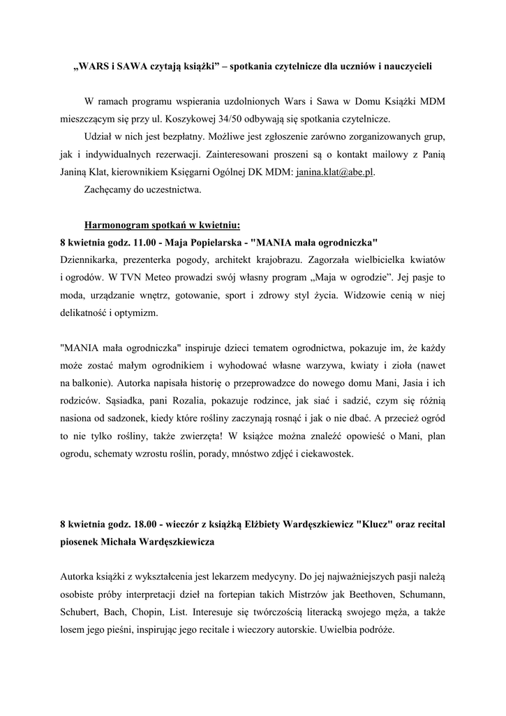 „WARS i SAWA czytają książki” – spotkania czytelnicze dla uczniów i nauczycieli W ramach programu wspierania uzdolnionych Wars i Sawa w Domu Książki MDM mieszczącym się przy ul. Koszykowej 34/50 odbywają się spotkania czytelnicze. Udział w nich jest bezpłatny. Możliwe jest zgłoszenie zarówno zorganizowanych grup, jak i indywidualnych rezerwacji. Zainteresowani proszeni są o kontakt mailowy z Panią Janiną Klat, kierownikiem Księgarni Ogólnej DK MDM: [email protected]. Zachęcamy do uczestnictwa. Harmonogram spotkań w kwietniu: 8 kwietnia godz. 11.00 - Maja Popielarska - "MANIA mała ogrodniczka" Dziennikarka, prezenterka pogody, architekt krajobrazu. Zagorzała wielbicielka kwiatów i ogrodów. W TVN Meteo prowadzi swój własny program „Maja w ogrodzie”. Jej pasje to moda, urządzanie wnętrz, gotowanie, sport i zdrowy styl życia. Widzowie cenią w niej delikatność i optymizm. "MANIA mała ogrodniczka" inspiruje dzieci tematem ogrodnictwa, pokazuje im, że każdy może zostać małym ogrodnikiem i wyhodować własne warzywa, kwiaty i zioła (nawet na balkonie). Autorka napisała historię o przeprowadzce do nowego domu Mani, Jasia i ich rodziców. Sąsiadka, pani Rozalia, pokazuje rodzince, jak siać i sadzić, czym się różnią nasiona od sadzonek, kiedy które rośliny zaczynają rosnąć i jak o nie dbać. A przecież ogród to nie tylko rośliny, także zwierzęta! W książce można znaleźć opowieść o Mani, plan ogrodu, schematy wzrostu roślin, porady, mnóstwo zdjęć i ciekawostek. 8 kwietnia godz. 18.00 - wieczór z książką Elżbiety Wardęszkiewicz "Klucz" oraz recital piosenek Michała Wardęszkiewicza Autorka książki z wykształcenia jest lekarzem medycyny. Do jej najważniejszych pasji należą osobiste próby interpretacji dzieł na fortepian takich Mistrzów jak Beethoven, Schumann, Schubert, Bach, Chopin, List. Interesuje się twórczością literacką swojego męża, a także losem jego pieśni, inspirując jego recitale i wieczory autorskie. Uwielbia podróże. "Klucz" to historia Meli, którą poznajemy w dość młodym wieku. Wychowuję się w na pozór "normalnej" rodzinie, będąc tak naprawdę ofiarą swojego sadystycznego ojca. Widzimy jak Mela dorasta oraz jak jej dzieciństwo wpływa na dalsze wybory życiowe. Możemy zobaczyć jak, starając się uciec od poprzedniego kata, wpada w szpony nowego, którym okazuję się jej mąż. Czy uda jej się wychować swoją córkę tak jak naprawdę tego chcę? A może jednak widmo przeszłości jej w tym przeszkodzi? Podczas wieczoru z książką, uczestnicy spotkania, będą mieli okazję wysłuchać poezji i piosenek Michała Wardęszkiewicza. 11 kwietnia godz. 11.00 -Warsztaty literacko - plastyczne z książką "Kolory" Pierwsze wydanie zbioru tych wierszy miało miejsce w 1973 roku. Książkę malarsko i radośnie zilustrowała Teresa Wilbik. Autorka i ilustratorka zabierają małego czytelnika w poetycką podróż po porach roku i ulotnych chwilach, w których przyroda się zmienia. Kolory odnajdują, także w świecie zwierzątek, bajkowych postaci i dziecięcych marzeń. Teraz została ona wznowiona, by móc cieszyć dzisiejszych małych czytelników. Spotkanie będzie pełne atrakcji i niespodzianek, związanych z książką, malowaniem i pracami ręcznymi. 14 kwietnia godz. 18:00 Jan Tokarski „Czas zwyrodniały” Jan Tokarski – z wykształcenia doktor nauk humanistycznych Instytutu Historii PAN. Publikuje we współpracy między innymi z "Przeglądem politycznym" oraz kwartalnikiem "Kronos". Zajmuje się historią myśli politycznej oraz filozofią XX wieku. Głównym tematem książki "Czas zwyrodniały" jest życie w czasach, gdzie nie ma wyraźnego podziału na przeszłość, teraźniejszość oraz przyszłość. Trwamy w epoce bez wizji, bez konkretnego celu, w świecie bez wyraźnych granic czy podziałów. Autor w swoim eseju rozważa czy czas, w którym nie żyjemy, nie jest przez to w pewnym sensie zwyrodniały. 21 kwietnia godz.11.00 - „Przygoda z małpką", Warsztaty literacko-plastyczne, Biblioteka Główna ul. Koszykowa 26/28, sala konferencyjna Stefania Szuchowa - jest pisarką oraz autorką słuchowisk dla dzieci i młodzieży. Absolwentka Uniwersytetu Jagiellońskiego w Krakowie. Od zawsze poświęcała się nauczaniu, również w ciężkich czasach okupacji. Do jej głównych zainteresowań należała tematyka przyrodnicza oraz krytyka literacka. Uhonorowana Nagrodą Prezesa Rady Ministrów za twórczość dla dzieci. Książka "Przygoda z małpką" opowiada historię Dudusia. Pewnego dnia, podczas wycieczki za miasto, chłopiec gubi się pośród tłumu ludzi. Podobne historie zdarzają się czasem dzieciom i zazwyczaj kończą się dobrze, pod warunkiem, że dziecko wie jak się nazywa i gdzie mieszka. Jednak bohater tej książki nie wiedział. Autorka w bardzo prosty i bezpretensjonalny sposób pokazuje, jak ważne jest, by dziecko takie informacje posiadało. Bardzo pouczająca propozycja również dla rodziców. 22 kwietnia godz. 18:00 - Michał Jagiełło „Zszywanie – w ucieczce”, „Wołanie w górach” Michał Jagiełło - miłośnik gór i wspinaczki. Motywy górskie bardzo często przewijają się w jego twórczości. A pisze nie tylko prozę, ale również eseje oraz poezję. Był wiceministrem kultury i sztuki oraz dyrektorem Biblioteki Narodowej. Krzyżem Komandorskim Orderu Odrodzenia Polski. W 2009 roku został odznaczony Krzyżem Komandorskim Orderu Odrodzenia Polski. Autor niezwykle interesujący, ciepły i pełen życia. W tomiku „Zszywanie – w ucieczce” na swój sposób rozlicza się z życiem. Jest to jego spowiedź z tego, co go w życiu bolało, co cieszyło. Uzewnętrznia swoje niedoskonałości. Jak często bywa u Michała Jagiełły - tłem jego opowieści są góry. W „Wołaniu w górach” autor opisuje historię powstania i działalności TOPR. Jest to zbiór opowieści z najciekawszych, ale również 