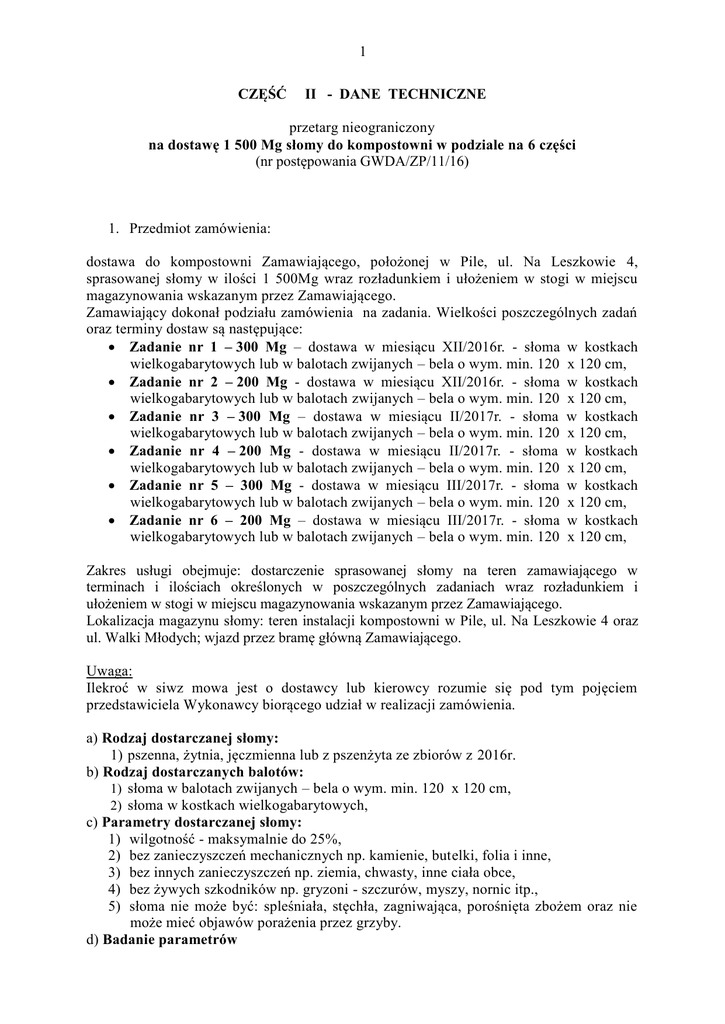 1 CZĘŚĆ II - DANE TECHNICZNE przetarg nieograniczony na dostawę 1 500 Mg słomy do kompostowni w podziale na 6 części (nr postępowania GWDA/ZP/11/16) 1. Przedmiot zamówienia: dostawa do kompostowni Zamawiającego, położonej w Pile, ul. Na Leszkowie 4, sprasowanej słomy w ilości 1 500Mg wraz rozładunkiem i ułożeniem w stogi w miejscu magazynowania wskazanym przez Zamawiającego. Zamawiający dokonał podziału zamówienia na zadania. Wielkości poszczególnych zadań oraz terminy dostaw są następujące: Zadanie nr 1 – 300 Mg – dostawa w miesiącu XII/2016r. - słoma w kostkach wielkogabarytowych lub w balotach zwijanych – bela o wym. min. 120 x 120 cm, Zadanie nr 2 – 200 Mg - dostawa w miesiącu XII/2016r. - słoma w kostkach wielkogabarytowych lub w balotach zwijanych – bela o wym. min. 120 x 120 cm, Zadanie nr 3 – 300 Mg – dostawa w miesiącu II/2017r. - słoma w kostkach wielkogabarytowych lub w balotach zwijanych – bela o wym. min. 120 x 120 cm, Zadanie nr 4 – 200 Mg - dostawa w miesiącu II/2017r. - słoma w kostkach wielkogabarytowych lub w balotach zwijanych – bela o wym. min. 120 x 120 cm, Zadanie nr 5 – 300 Mg - dostawa w miesiącu III/2017r. - słoma w kostkach wielkogabarytowych lub w balotach zwijanych – bela o wym. min. 120 x 120 cm, Zadanie nr 6 – 200 Mg – dostawa w miesiącu III/2017r. - słoma w kostkach wielkogabarytowych lub w balotach zwijanych – bela o wym. min. 120 x 120 cm, Zakres usługi obejmuje: dostarczenie sprasowanej słomy na teren zamawiającego w terminach i ilościach określonych w poszczególnych zadaniach wraz rozładunkiem i ułożeniem w stogi w miejscu magazynowania wskazanym przez Zamawiającego. Lokalizacja magazynu słomy: teren instalacji kompostowni w Pile, ul. Na Leszkowie 4 oraz ul. Walki Młodych; wjazd przez bramę główną Zamawiającego. Uwaga: Ilekroć w siwz mowa jest o dostawcy lub kierowcy rozumie się pod tym pojęciem przedstawiciela Wykonawcy biorącego udział w realizacji zamówienia. a) Rodzaj dostarczanej słomy: 1) pszenna, żytnia, jęczmienna lub z pszenżyta ze zbiorów z 2016r. b) Rodzaj dostarczanych balotów: 1) słoma w balotach zwijanych – bela o wym. min. 120 x 120 cm, 2) słoma w kostkach wielkogabarytowych, c) Parametry dostarczanej słomy: 1) wilgotność - maksymalnie do 25%, 2) bez zanieczyszczeń mechanicznych np. kamienie, butelki, folia i inne, 3) bez innych zanieczyszczeń np. ziemia, chwasty, inne ciała obce, 4) bez żywych szkodników np. gryzoni - szczurów, myszy, nornic itp., 5) słoma nie może być: spleśniała, stęchła, zagniwająca, porośnięta zbożem oraz nie może mieć objawów porażenia przez grzyby. d) Badanie parametrów 2 1) jakość dostarczanej słomy objęta będzie stałym nadzorem ze strony Zamawiającego; 2) Zamawiający zastrzega sobie prawo badania wilgotności dostarczanej słomy na każdym dostarczającym ją pojeździe. Wilgotność określana będzie przez Zamawiającego w obecności dostawcy przy pomocy urządzenia pomiarowego należącego do Zamawiającego. Badanie polegać będzie na wykonaniu 10 pomiarów, a wilgotność określana będzie na podstawie średniej wyliczanej z tych pomiarów i określana będzie w protokole badania wilgotności. (załącznik nr 4 do SIWZ). 3) pozostałe parametry - ocena organoleptyczna i wizualna dostarczanej słomy prowadzona będzie przed wjazdem na magazyn kompostowni, w obecności przedstawiciela Wykonawcy (np. dostawcy lub kierowcy). e) Przekroczenia parametrów: 1) wilgotność – przekroczenie zawartości procentowej powyżej 25% powoduje: procentowe obniżenie ceny dla ilości słomy, której dane badanie dotyczyło, wg wzoru: Obniżka ceny [%] = zmierzona zaw. procentowa [%] – 25 [%] lub odmowę odbioru danej partii słomy, 2) w przypadku nieprzestrzegania pozostałych parametrów, Zamawiający zastrzega sobie prawo odmowy odbioru tych balotów/kostki i odebrania tylko balotów/kostki, które spełniają wymagania określone w punkcie c) Parametry dostarczanej słomy: 2) - 5). 3) baloty/kostki niespełniające parametrów określonych w zamówieniu dostawca jest zobowiązany niezwłocznie zabrać z terenu kompostowni na własny koszt. f) Dostawa i rozliczenie: 1) Każda dostawa słomy, ewidencjonowana będzie poprzez ważenie na wadze wskazanej przez Zamawiającego i na jego koszt. 2) Waga każdej dostawy ustalana będzie na podstawie wagi netto z dowodu ważenia. 3) Każda dostawa słomy udokumentowana zostanie protokołem odbioru słomy. 4) Rozliczenie za dostawę słomy nastąpi po zakończeniu odbioru słomy. 5) Zapłata za dostawę wraz z usługą ustawienia w stogi płatna będzie przelewem w ciągu 10 dni od daty otrzymania faktury przez Zamawiającego, a w przypadku rolników ryczałtowców - 30 dni od daty wystawienia przez Zamawiającego faktury VAT RR. g) Obowiązki dostawcy: 1. Dowóz balotów/kostek słomy na magazyn obiektu kompostowni w dni robocze od poniedziałku do piątku od godz. 7.30 do godz. 14.30; inne dni oraz godziny dowozu dopuszczalne są po ustaleniu z Kierownikiem Zakładu Przetwarzania Odpadów, 2. Rozpoczęcie dostawy słomy nastąpi w terminie do 5 dni od chwili zgłoszenia zapotrzebowania w oparciu o zamówienie Zamawiającego składane telefonicznie przez Kierownika Zakładu Przetwarzania Odpadów, wysłane fax-em lub e-mailem lub zgłaszane w inny sposób nie budzący wątpliwości. 3. Wykonawca jest zobowiązany zrealizować zadanie w miesiącu rozpoczęcia dostawy. Koszty transportu obciążają Wykonawcę. 4. Wykonawca jest zobowiązany każdorazowo dokonać ważenia dostarczanej słomy na legalizowanej wadze przed wjazdem na teren magazynu, na koszt Zamawiającego; 5. Wykonawca jest zobowiązany każdorazowo dokonać rozładunku wraz z ułożeniem w stogi o powierzchni do 1000m 2 lub o wysokości stogu od 5m do 8m, na terenie kompostowni w miejscu magazynowania wskazanym przez Zamawiającego. Koszty rozładunku i ułożenia w stogi obciąża