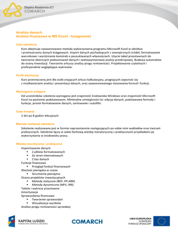 Analiza danych. Analiza finansowa w MS Excel - księgowość Cele szkolenia Kurs obejmuje zaawansowane metody wykorzystania programu Microsoft Excel w obróbce i przetwarzaniu danych księgowych. Import danych pochodzących z zewnętrznych źródeł, formatowanie warunkowe i wyróżnianie komórek o poszukiwanych własnościach. Użycie tabel przestawnych do tworzenia zbiorczych podsumowań danych i wielowymiarowej analizy przekrojowej. Budowa automatów do oceny inwestycji. Tworzenie arkuszy analizy progu rentowności. Projektowanie czytelnych i profesjonalnie wyglądające wykresów. Profil słuchaczy Kurs przeznaczony jest dla osób znających arkusz kalkulacyjny, pragnących zapoznać się z możliwościami analizy i prezentacji danych, oraz zaawansowanego stosowania formuł i funkcji. Wymagania wstępne Od uczestników szkolenia wymagana jest znajomość środowiska Windows oraz znajomość Microsoft Excel na poziomie podstawowym. Minimalne umiejętności to: edycja danych, podstawowe formuły i funkcje, proste formatowanie danych, sortowanie i autofiltr. Czas trwania 2 dni po 8 godzin lekcyjnych Metoda realizacji szkolenia Szkolenie realizowane jest w formie naprzemiennie następujących po sobie mini wykładów oraz ćwiczeń praktycznych. Szkolenie łączy w sobie fachową wiedzę merytoryczną z praktycznymi przykładami jej wykorzystania w środowisku pracy. Wiedza teoretyczna i praktyczna Importowanie danych Z plików formatowanych Ze stron internetowych Z baz danych Funkcje finansowe Przegląd funkcji finansowych Wartość pieniądza w czasie Strumienie pieniężne Ocena projektów inwestycyjnych Metody statyczne (BEP, PP,ARR) Metody dynamiczne (NPV, IRR) Tabele i wykresy przestawne Amortyzacja Sprawozdania finansowe Tworzenie sprawozdań Wizualizacja wyników Analiza progu rentowności sprzedaży Tworzenie arkuszy analizy progów rentowności Tworzenie wykresów Tworzenie zaawansowanych wykresów Tworzenie nowych typów wykresów – wykresy użytkownika Analizowanie danych za pomocą tabel przestawnych Pojęcie tabeli przestawnej Tworzenie tabel przestawnych Szkielet tabeli przestawnej Modyfikacje tabel przestawnych Obliczenia na tabeli przestawnej Grupowanie danych w tabeli Przykłady użycia tabel przestawnych Wykresy przestawne Raporty tabeli przestawnej Analiza symulacji Zastosowanie scenariuszy Szukaj wyniku Elementy graficzne – obrazy danych Dynamiczne i statyczne obrazy danych Zarządzanie zeszytami Zabezpieczenia zeszytów hasłami Zastosowanie podsumowania w zeszytach Umiejętności Po ukończeniu kursu uczestnik będzie posiadał wiedzę na temat zaawansowanych sposobów: importowania danych ze źródeł zewnętrznych analizy finansowej zaawansowanego formatowania danych, tworzenia wykresów użytkownika, analizowania danych, oceniania projektów inwestycyjnych, użycia tabel przestawnych analizy progów rentowności wielowymiarowej analizy przekrojowej Ścieżka rozwoju Po zakończeniu szkolenia rekomendowane jest skorzystanie z: „Excel 2007 w firmie. Controlling, finanse i nie tylko” Sebastian Wilczewski, Maciej Wrzód