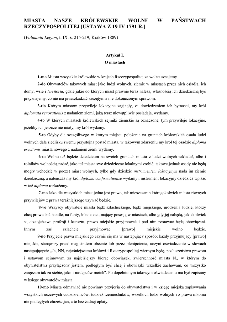 1-mo Miasta wszystkie królewskie w krajach Rzeczypospolitej za wolne uznajemy.