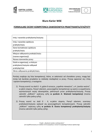 Biuro Karier WSE FORMULARZ OCENY KOMPETENCJI ZAWODOWYCH PRAKTYKANTA/STAŻYSTY Imię i nazwisko praktykanta/stażysty Imię i nazwisko opiekuna praktyki/stażu Dane kontaktowe opiekuna praktyki/stażu Miejsce odbywania praktyki/stażu (nazwa organizacji) Nazwa stanowiska pracy Dział w organizacji, w którym praktykant/stażysta odbywał praktykę/staż Okres odbywania praktyki/stażu Poniżej znajduje się lista kompetencji, które, w zależności od charakteru pracy, mogą być mniej lub bardziej przydatne (a niekiedy niezbędne) w pracy. Proszę zapoznać się z listą i opisem kompetencji, a następnie: 1) Proszę ocenić na skali 0 - 4, gdzie 0 oznacza „zupełnie nieważna”, a 4 „bardzo ważna”, w jakim stopniu, Pana/i zdaniem, poszczególne kompetencje są ważne w wypełnianiu wymienionych wyżej obowiązków, pełnionych przez praktykanta/stażystę. Proszę zakreślić „kółkiem” wybraną cyfrę w punkcie A: Ważność kompetencji (można zakreślić tylko jedną cyfrę). 2) Proszę ocenić na skali 0 - 4, w jakim stopniu, Pana/i zdaniem, oceniany praktykant/stażysta wykazał się poszczególnymi kompetencjami. Proszę zakreślić „kółkiem” wybraną cyfrę w punkcie B: Ocena kompetencji praktykanta/stażysty (można zakreślić tylko jedną cyfrę). Projekt „Absolwent wiedza i profesjonalizm” jest współfinansowany ze środków Unii Europejskiej w ramach Europejskiego Funduszu Społecznego 1 Poziom 0 - Brak występowania kompetencji lub negatywne przejawy jej występowania. Poziom 1 Zachowania wskazujące na sporadyczne występowanie kompetencji. Praktykant wymaga aktywnego wsparcia. Poziom 2 Dobry poziom przyswojenia kompetencji, pozwalający na samodzielne wykonywanie zadań. Praktykant dobrze sobie radzi z zadaniami typowymi. Poziom 3 Kompetencje przejawiają się we wszystkich zachowaniach. Poziom przyswojenia kompetencji jest tutaj bardzo dobry. Praktykant potrafi rozwiązywać zadania wykraczające również poza zadania typowe. Poziom 4 - Poziom mistrzowski. Kompetencje przejawiają się we wszystkich zachowaniach oraz w zachowaniach wspierających inne osoby. Kompetencje INICJATYWA Praktykant/Stażysta(P/S) wykazuje zapał i entuzjazm w codziennej pracy, aktywnie podchodzi do realizacji poleceń przełożonego. Inicjuje nowe rozwiązania, biorąc za nie odpowiedzialność. Jest pomocny i zmotywowany. Dostrzega i wykorzystuje okazje do pogłębiania wiedzy oraz rozwoju własnych kompetencji. A. Ważność kompetencji 0 1 2 3 zupełnie nieważna 4 bardzo ważna 8 - nie dotyczy (zaznacz, jeżeli uważasz, że odbywana praktyka/staż nie pozwoliła na wykazanie się tą kompetencją 9 - trudno powiedzieć (zaznacz, jeżeli praktykant/stażysta miał okazję wykazać się tą kompetencją, ale nie potrafisz tego ocenić na skali 5-stopniowej) B. Ocena kompetencji praktykanta/stażysty 0 1 2 3 4 P0 P1 P2 P3 P4 8 - nie dotyczy (zaznacz, jeżeli uważasz, że odbywana przez praktyka/staż nie pozwala na wykazanie się tą kompetencją 9 - trudno powiedzieć (zaznacz, jeżeli praktykant/stażysta miał okazję wykazać się tą kompetencją, ale nie potrafisz tego ocenić na skali 5-stopniowej) Projekt „Absolwent wiedza i profesjonalizm” jest współfinansowany ze środków Unii Europejskiej w ramach Europejskiego Funduszu Społecznego 2 KOMUNIKATYWNOŚĆ P/S umiejętnie komunikuje się z otoczeniem. Formułuje myśli w spójne, jasne i precyzyjne wypowiedzi. Wykazuje łatwość w nawiązywaniu kontaktów. W stosunku do współpracowników jest otwarty, towarzyski i koleżeński. A. Ważność kompetencji 1 0 2 3 zupełnie nieważna 4 8 - nie dotyczy 9 - trudno powiedzieć bardzo ważna B. Ocena kompetencji praktykanta/stażysty 0 1 P0 P1 2 3 4 P2 P3 P4 8 - nie dotyczy 9 - trudno powiedzieć WSPÓŁPRACA P/S potrafi współpracować w zespole, aktywnie i z zaangażowaniem wspiera zadania zespołu. Efektywnie współdziała z przełożonym(i); dzieli się informacjami i wiedzą, dba o dobrą atmosferę pracy, jest otwarty na konstruktywną krytykę. A. Ważność kompetencji 1 0 2 3 zupełnie nieważna 4 8 - nie dotyczy 9 - trudno powiedzieć bardzo ważna B. Ocena kompetencji praktykanta/stażysty 0 1 P0 P1 2 3 4 P2 P3 P4 8 - nie dotyczy 9 - trudno powiedzieć Projekt „Absolwent wiedza i profesjonalizm” jest współfinansowany ze środków Unii Europejskiej w ramach Europejskiego Funduszu Społecznego 3 Poziom 0 - Brak występowania kompetencji lub negatywne przejawy jej występowania. Poziom 1 Zachowania wskazujące na sporadyczne występowanie kompetencji. Praktykant wymaga aktywnego wsparcia. Poziom 2 Dobry poziom przyswojenia kompetencji, pozwalający na samodzielne wykonywanie zadań. Praktykant dobrze sobie radzi z zadaniami typowymi. Poziom 3 Kompetencje przejawiają się we wszystkich zachowaniach. Poziom przyswojenia kompetencji jest tutaj bardzo dobry. Praktykant potrafi rozwiązywać zadania wykraczające również poza zadania typowe. Poziom 4 Poziom mistrzowski. Kompetencje przejawiają się we wszystkich zachowaniach, oraz zachowaniach wspierających te osoby. SAMODZIELNOŚĆ P/S, w miarę swoich możliwości i posiadanych kompetencji, potrafi samodzielnie wykonać powierzone mu zadania, nie absorbując nadmiernie uwagi współpracowników. A. Ważność kompetencji 1 0 2 3 zupełnie nieważna 4 8 - nie dotyczy 9 - trudno powiedzieć bardzo ważna B. Ocena kompetencji praktykanta/stażysty 0 1 P0 P1 2 3 4 P2 P3 P4 8 - nie dotyczy 9 - trudno powiedzieć Projekt „Absolwent wiedza i profesjonalizm” jest współfinansowany ze środków Unii Europejskiej w ramach Europejskiego Funduszu Społecznego 4 ORGANIZACJA PRACY P/S, realizując powierzone zadania, postępuje w sposób uporządkowany i przemyślany, potrafi w zadanym terminie sprawnie wykonać określoną pracę. Planuje swoje zajęcia, optymalnie wykorzystując czas. Jest systematyczny i przewidujący. A. Ważność kompetencji 1 0 2 3 zupełnie nieważna 4 8 - nie dotyczy 9 - t