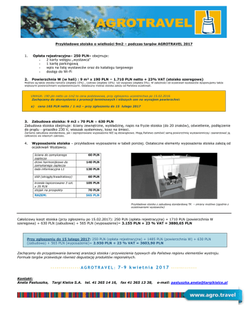Przykładowe stoisko o wielkości 9m2 – podczas targów AGROTRAVEL 2017 1. 2. Opłata - rejestracyjna– 250 PLN– obejmuje: 2 karty wstępu „wystawca“ 1 kartę parkingową wpis na listę wystawców oraz do katalogu targowego dostęp do Wi-Fi Powierzchnia W (w hali) : 9 m² x 190 PLN = 1.710 PLN netto + 23% VAT (stoisko szeregowe) Możliwe są także stoiska narożne (dopłata 15%) , czołowe (dopłata 10%) lub wyspowe (dopłata 5%). W zależności od oczekiwań wystawców dysponujemy także większymi powierzchniami wystawienniczymi. Ostateczny metraż stoiska zależy od Państwa oczekiwań. UWAGA: 190 pln netto za 1m2 to cena podstawowa, przy zgłoszeniu uczestnictwa po 15.02.2016 Zachęcamy do skorzystania z promocji terminowych i niższych cen na wynajem powierzchni: a) cena 165 PLN netto / 1 m2 – przy zgłoszeniu do 15 lutego 2017 3. Zabudowa stoiska: 9 m2 x 70 PLN = 630 PLN Zabudowa stoiska obejmuje: ściany zewnętrzne, wykładzinę, napis na fryzie stoiska (do 20 znaków), oświetlenie, podłączenie do prądu - gniazdko 230 V, wieszak systemowy, kosz na śmieci. Zarówno zabudowa standardowa, jak i zaproponowane wyposażenie NIE są obowiązkowe. Mogą Państwo zamówić samą powierzchnię wystawienniczą i zaaranżować ją całkowicie we własnym zakresie. 4. Wyposażenie stoiska – przykładowe wyposażenie w tabeli poniżej. Ostateczne elementy wyposażenia stoiska zależą od oczekiwań Wystawcy. ściana do zamykanego zaplecza drzwi harmonijkowe do zamykanego zaplecza lada informacyjna L1 stół (okrągły/kwadratowy) 60 PLN 140 PLN 130 PLN 60 PLN krzesła tapicerowane 3 szt. x 35 PLN stojak na prospekty 105 PLN RAZEM: 565 PLN 70 PLN Przykładowe stoisko z zabudową standardową TK – zmiany możliwe (zgodnie z oczekiwaniami wystawców) Całościowy koszt stoiska (przy zgłoszeniu po 15.02.2017): 250 PLN (opłata rejestracyjna) + 1710 PLN (powierzchnia W szeregowa) + 630 PLN (zabudowa) + 565 PLN (wyposażenie)= 3.155 PLN + 23 % VAT = 3880,65 PLN Przy zgłoszeniu do 15 lutego 2017: 250 PLN (opłata rejestracyjna) + 1485 PLN (powierzchnia W) + 630 PLN (zabudowa) + 565 PLN (wyposażenie)= 2.930 PLN + 23 % VAT = 3603,90 PLN Zachęcamy do przygotowania barwnej aranżacji stoiska i przywiezienia typowych dla Państwa regionu elementów wystroju. Formuła targów przewiduje również degustację produktów regionalnych. ---------------AGROTRAVEL: Kontakt: Aneta Pastuszka, Targi Kielce S.A. tel. 41 365 14 16, 7-9 kwietnia 2017 fax 41 365 13 38, ------------- e-mail: [email protected]