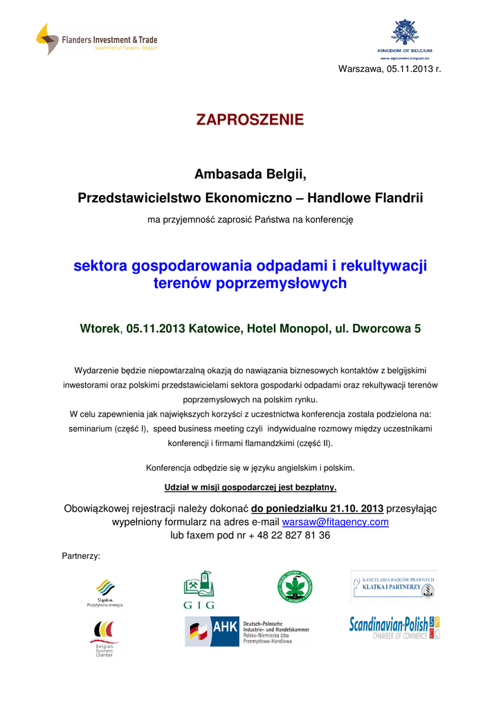 Warszawa, 05.11.2013 r. ZAPROSZENIE Ambasada Belgii, Przedstawicielstwo Ekonomiczno – Handlowe Flandrii ma przyjemność zaprosić Państwa na konferencję sektora gospodarowania odpadami i rekultywacji terenów poprzemysłowych Wtorek, 05.11.2013 Katowice, Hotel Monopol, ul. Dworcowa 5 Wydarzenie będzie niepowtarzalną okazją do nawiązania biznesowych kontaktów z belgijskimi inwestorami oraz polskimi przedstawicielami sektora gospodarki odpadami oraz rekultywacji terenów poprzemysłowych na polskim rynku. W celu zapewnienia jak największych korzyści z uczestnictwa konferencja została podzielona na: seminarium (część I), speed business meeting czyli indywidualne rozmowy między uczestnikami konferencji i firmami flamandzkimi (część II). Konferencja odbędzie się w języku angielskim i polskim. Udział w misji gospodarczej jest bezpłatny. Obowiązkowej rejestracji należy dokonać do poniedziałku 21.10. 2013 przesyłając wypełniony formularz na adres e-mail [email protected] lub faxem pod nr + 48 22 827 81 36 Partnerzy: Program misji gospodarczej 14:00 - 14.15 Rejestracja uczestników, powitalna kawa. 14.15 – 14.30 Inauguracja konferencji Pan Luc Strybol, Radca Ekonomiczny i Handlowy Regionu Flandrii, Ambasada Belgii 14.30 – 16.00 SEMINARIUM Gospodarowanie odpadami i rekultywacja terenów na Śląsku Prof. Jan Skowronek – Instytut Ekologii Terenów Uprzemysłowionych Systemowe podejście do zagospodarowania terenów poprzemysłowych na przykładzie województwa śląskiego Pan Jan Bondaruk – Główny Instytut Górnictwa Prawne aspekty rekultywacji gleb w Polsce Pan Jędrzej Klatka - Klatka i Partnerzy, Kancelaria Radców Prawnych Polityka i ekspertyzy w zakresie gospodarowania odpadami i rekultywacji terenów we Flandrii OVAM Pani Anne Vandeputte – Project Manager, Public Waste Agency of Flanders Firmy z Flandrii [szczegóły w broszurze informacyjnej] 16.00 – 17:00 Speed Business Meeting - indywidualne rozmowy między uczestnikami konferencji i firmami z Flandrii 17:00 KOKTAJL Dodatkowych informacji udziela Pani Iwona Ciołek e-mail [email protected], T +48 22 584 73 40