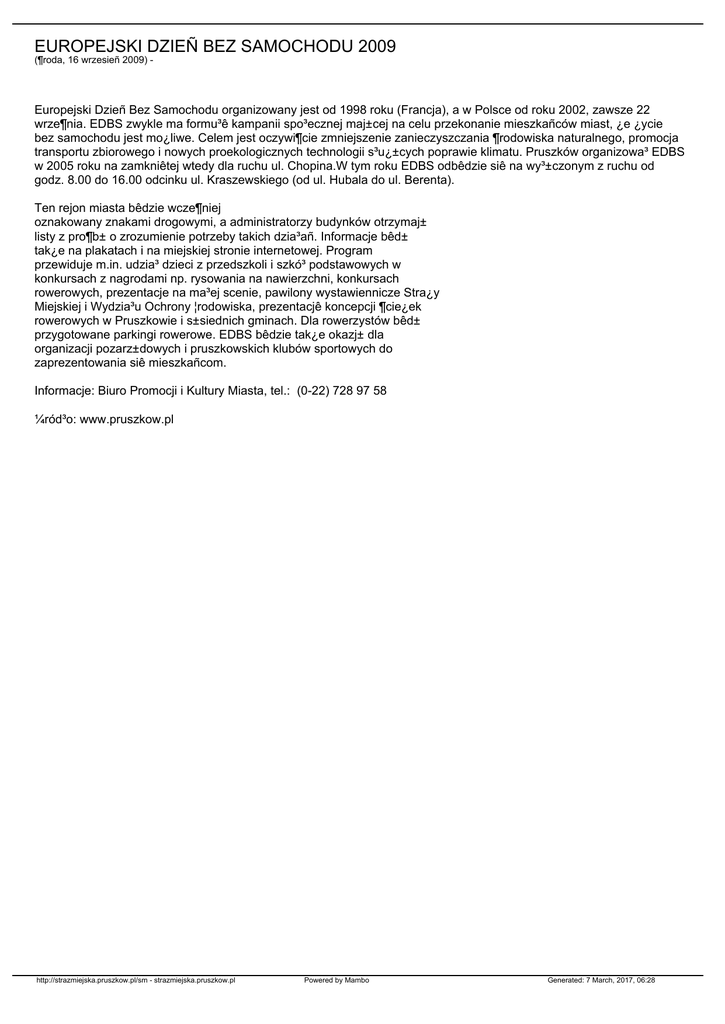 EUROPEJSKI DZIEÑ BEZ SAMOCHODU 2009 (¶roda, 16 wrzesieñ 2009) - Europejski Dzieñ Bez Samochodu organizowany jest od 1998 roku (Francja), a w Polsce od roku 2002, zawsze 22 wrze¶nia. EDBS zwykle ma formu³ê kampanii spo³ecznej maj±cej na celu przekonanie mieszkañców miast, ¿e ¿ycie bez samochodu jest mo¿liwe. Celem jest oczywi¶cie zmniejszenie zanieczyszczania ¶rodowiska naturalnego, promocja transportu zbiorowego i nowych proekologicznych technologii s³u¿±cych poprawie klimatu. Pruszków organizowa³ EDBS w 2005 roku na zamkniêtej wtedy dla ruchu ul. Chopina.W tym roku EDBS odbêdzie siê na wy³±czonym z ruchu od godz. 8.00 do 16.00 odcinku ul. Kraszewskiego (od ul. Hubala do ul. Berenta). Ten rejon miasta bêdzie wcze¶niej oznakowany znakami drogowymi, a administratorzy budynków otrzymaj± listy z pro¶b± o zrozumienie potrzeby takich dzia³añ. Informacje bêd± tak¿e na plakatach i na miejskiej stronie internetowej. Program przewiduje m.in. udzia³ dzieci z przedszkoli i szkó³ podstawowych w konkursach z nagrodami np. rysowania na nawierzchni, konkursach rowerowych, prezentacje na ma³ej scenie, pawilony wystawiennicze Stra¿y Miejskiej i Wydzia³u Ochrony ¦rodowiska, prezentacjê koncepcji ¶cie¿ek rowerowych w Pruszkowie i s±siednich gminach. Dla rowerzystów bêd± przygotowane parkingi rowerowe. EDBS bêdzie tak¿e okazj± dla organizacji pozarz±dowych i pruszkowskich klubów sportowych do zaprezentowania siê mieszkañcom. Informacje: Biuro Promocji i Kultury Miasta, tel.: (0-22) 728 97 58 ¼ród³o: www.pruszkow.pl http://strazmiejska.pruszkow.pl/sm - strazmiejska.pruszkow.pl Powered by Mambo Generated: 7 March, 2017, 06:28