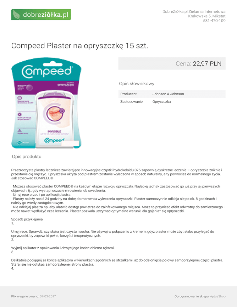 DobreZiółka.pl Zielarnia Internetowa Krakowska 5, Mikstat 531-470-109 Compeed Plaster na opryszczkę 15 szt. Cena: 22,97 PLN Opis słownikowy Producent Johnson & Johnson Zastosowanie Opryszczka Opis produktu Przezroczyste plastry lecznicze zawierające innowacyjne cząstki hydrokoloidu 075 zapewnią dyskretne leczenie – opryszczka zniknie i przestanie cię męczyć. Opryszczka ukryta pod plastrem zostanie wyleczona w sposób naturalny, a ty powrócisz do normalnego życia. Jak stosować COMPEED® Możesz stosować plaster COMPEED® na każdym etapie rozwoju opryszczki. Najlepiej jednak zastosować go już przy jej pierwszych objawach, tj., gdy wystąpi uczucie mrowienia lub swędzenia. Umyj ręce przed i po aplikacji plastra. Plastry należy nosić 24 godziny na dobę do momentu wyleczenia opryszczki. Plaster samoczynnie odkleja się po ok. 8 godzinach i należy go wtedy zastąpić nowym. Nie odklejaj plastra np. aby ułatwić dostęp powietrza do zainfekowanego miejsca. Może to przynieść efekt odwrotny do zamierzonego i może nawet wydłużyć czas leczenia. Plaster pozwala utrzymać optymalne warunki dla gojenia* się opryszczki. Sposób przyklejania 1. Umyj ręce. Sprawdź, czy skóra jest czysta i sucha. Nie używaj w połączeniu z kremem, gdyż plaster może zbyt słabo przylegać do opryszczki, by zapewnić pełnię korzyści terapeutycznych. 2. Wyjmij aplikator z opakowania i chwyć jego końce obiema rękami. 3. Delikatnie pociągnij za końce aplikatora w kierunkach zgodnych ze strzałkami, aż do odsłonięcia połowy samoprzylepnej części plastra. Staraj się nie dotykać samoprzylepnej strony plastra. 4. Plik wygenerowano: 07-03-2017 Oprogramowanie sklepu: AptusShop DobreZiółka.pl Zielarnia Internetowa Krakowska 5, Mikstat 531-470-109 Przyłóż plaster do miejsca z opryszczką i delikatnie dociśnij palcem jego odsłoniętą część przyklejając go. 5. Chwyć górną część aplikatora i powoli odchyl ją w dół, starając się, aby plaster pozostał w odpowiednim miejscu i równo przylegał do wargi. Jak zdejmować plaster Jeśli plaster pozostaje przyklejony, nie ma konieczności zdejmowania go czy zmiany. Jeśli plaster zaczyna się odklejać od skóry, należy go zdjąć i nakleić nowy. Aby zdjąć plaster, należy odkleić go na krawędzi. Obiema dłońmi chwycić odklejoną krawędź plastra. Rozciągnąć plaster na boki, oddalając od siebie dłonie w miarę odklejania plastra. *leczenie zmian opryszczkowych Plik wygenerowano: 07-03-2017 Powered by TCPDF (www.tcpdf.org) Oprogramowanie sklepu: AptusShop