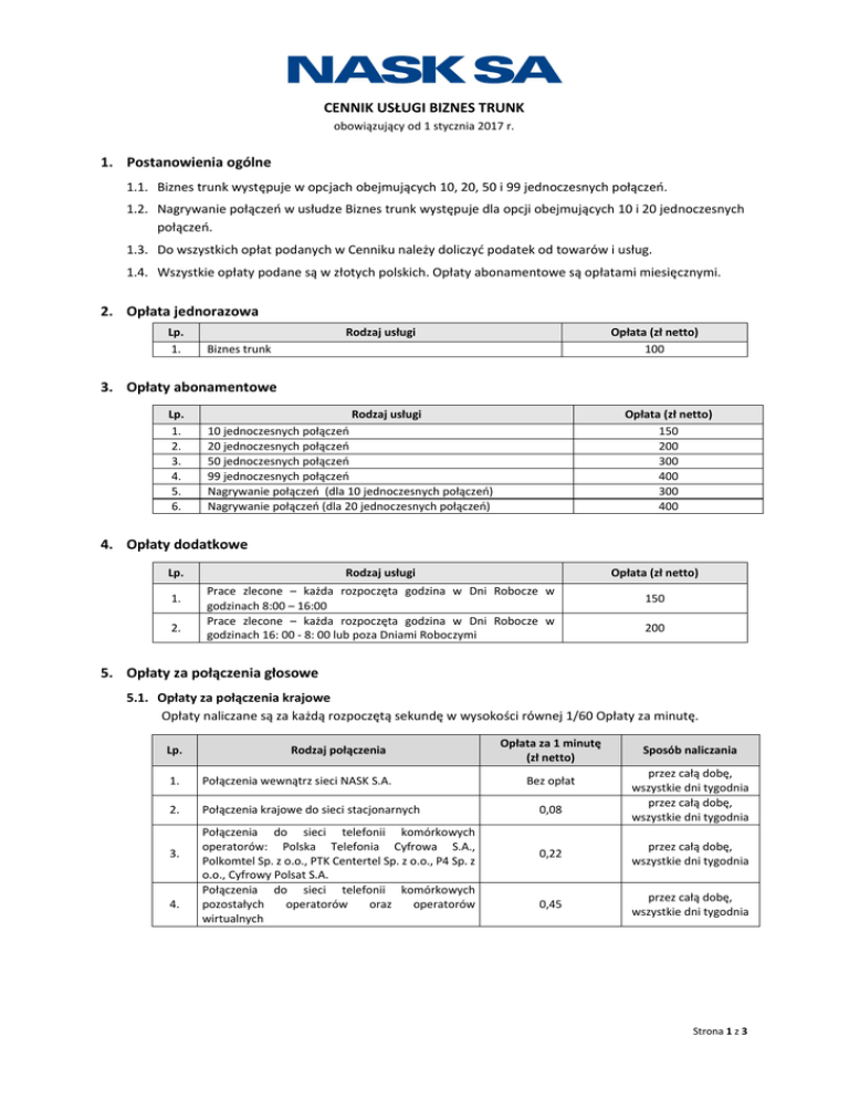 CENNIK USŁUGI BIZNES TRUNK obowiązujący od 1 stycznia 2017 r. 1. Postanowienia ogólne 1.1. Biznes trunk występuje w opcjach obejmujących 10, 20, 50 i 99 jednoczesnych połączeń. 1.2. Nagrywanie połączeń w usłudze Biznes trunk występuje dla opcji obejmujących 10 i 20 jednoczesnych połączeń. 1.3. Do wszystkich opłat podanych w Cenniku należy doliczyć podatek od towarów i usług. 1.4. Wszystkie opłaty podane są w złotych polskich. Opłaty abonamentowe są opłatami miesięcznymi. 2. Opłata jednorazowa Lp. 1. Rodzaj usługi Opłata (zł netto) 100 Biznes trunk 3. Opłaty abonamentowe Lp. 1. 2. 3. 4. 5. 6. Rodzaj usługi 10 jednoczesnych połączeń 20 jednoczesnych połączeń 50 jednoczesnych połączeń 99 jednoczesnych połączeń Nagrywanie połączeń (dla 10 jednoczesnych połączeń) Nagrywanie połączeń (dla 20 jednoczesnych połączeń) Opłata (zł netto) 150 200 300 400 300 400 4. Opłaty dodatkowe Lp. 1. 2. Rodzaj usługi Opłata (zł netto) Prace zlecone – każda rozpoczęta godzina w Dni Robocze w godzinach 8:00 – 16:00 Prace zlecone – każda rozpoczęta godzina w Dni Robocze w godzinach 16: 00 - 8: 00 lub poza Dniami Roboczymi 150 200 5. Opłaty za połączenia głosowe 5.1. Opłaty za połączenia krajowe Opłaty naliczane są za każdą rozpoczętą sekundę w wysokości równej 1/60 Opłaty za minutę. Lp. Rodzaj połączenia 1. Połączenia wewnątrz sieci NASK S.A. 2. Połączenia krajowe do sieci stacjonarnych 3. 4. Połączenia do sieci telefonii komórkowych operatorów: Polska Telefonia Cyfrowa S.A., Polkomtel Sp. z o.o., PTK Centertel Sp. z o.o., P4 Sp. z o.o., Cyfrowy Polsat S.A. Połączenia do sieci telefonii komórkowych pozostałych operatorów oraz operatorów wirtualnych Opłata za 1 minutę (zł netto) Bez opłat 0,08 Sposób naliczania przez całą dobę, wszystkie dni tygodnia przez całą dobę, wszystkie dni tygodnia 0,22 przez całą dobę, wszystkie dni tygodnia 0,45 przez całą dobę, wszystkie dni tygodnia Strona 1 z 3 CENNIK USŁUGI BIZNES TRUNK obowiązujący od 1 stycznia 2017 r. 5.2. Opłaty za połączenia międzynarodowe w ruchu automatycznym do sieci stacjonarnych Opłaty naliczane są za każdą rozpoczętą sekundę w wysokości równej 1/60 Opłaty za minutę. Opłata za 1 min (zł netto) Strefa Kraj 1 Andora, Australia, Austria, Belgia, Bułgaria, Chorwacja, Cypr, Czechy, Dania, Estonia, Finlandia, Francja, Grecja, Hiszpania, Holandia, Irlandia, Kanada, Litwa, Luxemburg, Łotwa, Malta, Niemcy, Nowa Zelandia, Norwegia, Portugalia, Rumunia, Słowacja, Słowenia, Stany Zjednoczone, Szwecja, Szwajcaria, Turcja, Węgry, Wielka Brytania, Włochy 2 Algieria, Argentyna, Brazylia, Chiny, Gruzja, Hongkong, Indie, Islandia, Japonia, Kazachstan, Korea Południowa, Lichtenstein, Monako, Republika Południowej Afryki, Rosja, Czarnogóra, Singapur, Tajlandia, Tajwan, Uzbekistan, Wietnam 0,90 3 Abchazja, Albania, Arabia Saudyjska, Armenia, Bahamy, Bośnia i Hercegowina, Czarnogóra, Egipt, Gibraltar, Iran, Irak, Jemen, Kuwejt, Kirgistan, Macedonia, Malezja, Maroko, Meksyk, Mołdawia, Pakistan, Serbia, Tadżykistan, Turkmenistan, Ukraina, Wyspy Dziewicze Stanów Zjednoczonych, Wyspy Dziewicze, Wielkiej Brytanii 1,50 4 Afganistan, Angola, Anguilla, Antarktyka, Antigua i Barbuda, Antyle Holenderskie, Aruba, Australia-Terytoria Zewnętrzne, Azerbejdżan, Bahrajn, Bangladesz, Barbados, Bermudy, Białoruś, Boliwia, Botswana, Brunei, Burkina Faso, Chile, Czad, Dominika, Dominikana, Ekwador, Etiopia, Falklandy, Fidżi, Filipiny, Gana, Grenada, Grenlandia, Gujana, Gujana Francuska, Gwadelupa, Gwatemala, Gwinea, Gwinea Równikowa, Haiti, Honduras, Indonezja, Izrael, Jamajka, Jordan, Kambodża, Kamerun, Katar, Kenia, Kolumbia, Kongo, Korea Północna, Kostaryka, Laos, Liberia, Libia, Madagaskar, Malediwy, Mali, Martynika, Mauretania, Mauritius, Mikronezja, Mongolia, Mozambik, Namibia, Nepal, Niger, Nigeria, Nikaragua, Palau, Palestyna, Panama, Paragwaj, Peru, Polinezja Francuska, Portoryko, Republika Środkowoafrykańska, Rwanda, San Marino, Samoa Amerykańskie, Senegal, Seszele, Somalia, Sri Lanka, Sudan, Surinam, Syria, Tanzania, Trinidad i Tobago, Uganda, Urugwaj, Wenezuela, Wyspy Marshalla, Zambia, Zimbabwe, Zjednoczone Emiraty Arabskie 5 Belize, Benin, Bhutan, Birma, Burundi, Diego Garcia, Dżibuti, Salwador, Erytrea, Gabon, Gambia, Guam, Guantanamo, Gwinea Bissau, Jemen, Kajmany, Kiribati, Komory, Kuba, Lesotho, Liban, Makau, Malawi, Mariany Północne, Montserrat, Nauru, Niue, Norfolk, Nowa Kaledonia, Oman, Papua Nowa Gwinea, Reunion, Święta Helena, Saint Kitts, Saint Lucia, Saint Pierre i Miquelon, Saint Vincent i Grenadyny, Samoa Zachodnia, Wyspy Św. Tomasza i Książęca, Sierra Leone, Suazi, Togo, Tokelau, Tonga, Turks i Caicos, Tuvalu, Tunezja, Vanuatu, Wallis i Futuna, Wybrzeże Kości Słoniowej, Wyspy Cooka, Wyspy Owcze, Wyspy Salomona, Wyspy Wniebowstąpienia, Wyspy Zielonego Przylądka 0,29 2,90 4,50 5.3. Opłaty za połączenia międzynarodowe w ruchu automatycznym do sieci komórkowych Opłaty naliczane są za każdą rozpoczętą sekundę w wysokości równej 1/60 Opłaty za minutę. Strefa Kraj Opłata za 1 min (zł netto) 1 Austria, Belgia, Bułgaria, Cypr, Czechy, Dania, Finlandia, Francja, Niemcy, Grecja, Hiszpania, Holandia, Islandia, Kanada, Litwa, Luxemburg, Litwa, Malta, Niemcy, Nowa Zelandia, Norwegia, Portugalia, Rumunia, San Marino, Słowacja, Słowenia, Stany Zjednoczone, Szwecja, Węgry, Wielka Brytania, Włochy 0,90 2 Australia, Brazylia, Chiny, Chorwacja, Gruzja, Hongkong, Indie, Izrael, Kazachstan, Kirgistan, Korea Południowa, Lichtenstein, Łotwa, Rosja, Republika Południowej Afryki, Singapur, Szwajcaria, Tajlandia, Tajwan, Turcja, Turkmenistan, Ukraina, Uzbekistan, Wietnam 1,50 3 Abchazja, Albania, Algieria, Andora, Argentyna, Armenia, Azerbejdżan, Arabia Saudyjska, Afganistan, Angola, Antigua i Barbuda Bahrajn, Bangladesz, Białoruś, Botswana, Bośnia i Hercegowina, Boliwia, Chile, Chorw