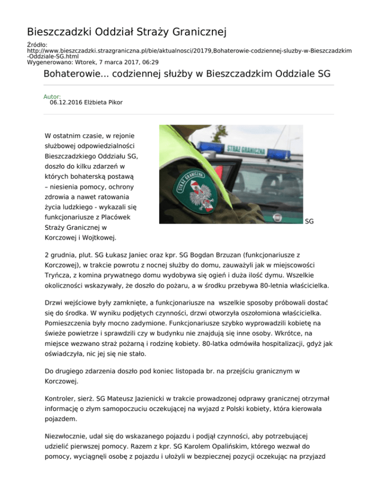 Bieszczadzki Oddział Straży Granicznej Źródło: http://www.bieszczadzki.strazgraniczna.pl/bie/aktualnosci/20179,Bohaterowie-codziennej-sluzby-w-Bieszczadzkim -Oddziale-SG.html Wygenerowano: Wtorek, 7 marca 2017, 06:29 Bohaterowie... codziennej służby w Bieszczadzkim Oddziale SG Autor: 06.12.2016 Elżbieta Pikor W ostatnim czasie, w rejonie służbowej odpowiedzialności Bieszczadzkiego Oddziału SG, doszło do kilku zdarzeń w których bohaterską postawą – niesienia pomocy, ochrony zdrowia a nawet ratowania życia ludzkiego - wykazali się funkcjonariusze z Placówek Straży Granicznej w SG Korczowej i Wojtkowej. 2 grudnia, plut. SG Łukasz Janiec oraz kpr. SG Bogdan Brzuzan (funkcjonariusze z Korczowej), w trakcie powrotu z nocnej służby do domu, zauważyli jak w miejscowości Tryńcza, z komina prywatnego domu wydobywa się ogień i duża ilość dymu. Wszelkie okoliczności wskazywały, że doszło do pożaru, a w środku przebywa 80-letnia właścicielka. Drzwi wejściowe były zamknięte, a funkcjonariusze na wszelkie sposoby próbowali dostać się do środka. W wyniku podjętych czynności, drzwi otworzyła oszołomiona właścicielka. Pomieszczenia były mocno zadymione. Funkcjonariusze szybko wyprowadzili kobietę na świeże powietrze i sprawdzili czy w budynku nie znajdują się inne osoby. Wkrótce, na miejsce wezwano straż pożarną i rodzinę kobiety. 80-latka odmówiła hospitalizacji, gdyż jak oświadczyła, nic jej się nie stało. Do drugiego zdarzenia doszło pod koniec listopada br. na przejściu granicznym w Korczowej. Kontroler, sierż. SG Mateusz Jazienicki w trakcie prowadzonej odprawy granicznej otrzymał informację o złym samopoczuciu oczekującej na wyjazd z Polski kobiety, która kierowała pojazdem. Niezwłocznie, udał się do wskazanego pojazdu i podjął czynności, aby potrzebującej udzielić pierwszej pomocy. Razem z kpr. SG Karolem Opalińskim, którego wezwał do pomocy, wyciągnęli osobę z pojazdu i ułożyli w bezpiecznej pozycji oczekując na przyjazd karetki pogotowia. W wyniku badań lekarskich, okazało się, że u podróżnej stwierdzono migotanie przedsionków serca. Kobiecie zostały podane odpowiednie medykamenty i już jako pasażerka mogła kontynuować podróż. W listopadzie, na ręce Komendanta BiOSG płk. SG dr. Piotra Patli, wpłynęły podziękowania od ojca nastolatka, któremu funkcjonariusze z Placówki w Wojtkowej, po wypadku w Bieszczadach, udzielili pierwszej pomocy. Jak się okazało, chłopak kierując samochodem wpadł w poślizg i rozbił pojazd. Po wypadku był w szoku, nie wiedział gdzie jest ani dokąd się udaje. Nie potrafił też podać z jakiego powodu znajduje się 500 km od domu rodzinnego. Funkcjonariusze, udzielili mu pierwszej pomocy, a także ustalili numer telefonu rodziców i poinformowali ich o zaistniałej sytuacji. Również, funkcjonariusze z tej Placówki udzielili pomocy choremu na nowotwór motocykliście. Mężczyzna, jadąc leśną drogą w okolicy m. Arłamów miał awarię motocykla i źle się poczuł. Jak twierdził, w tych okolicznościach bardzo potrzebował pomocy i sam nie poradziłby sobie z problemem technicznym motocykla. Wskazał również, że pomocy takiej nie otrzymał od mijających go wcześniej kierowców.
