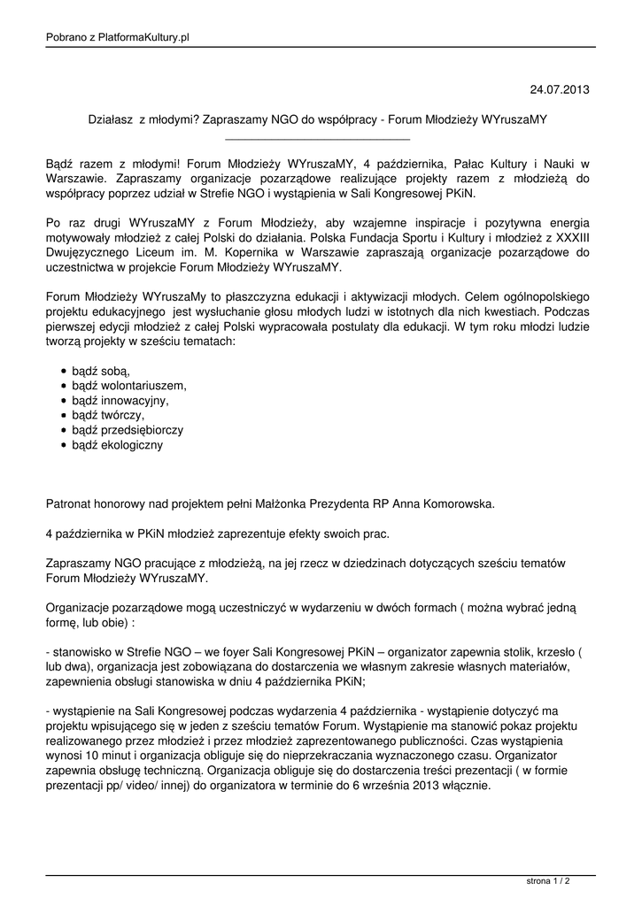 Pobrano z PlatformaKultury.pl 24.07.2013 Działasz z młodymi? Zapraszamy NGO do współpracy - Forum Młodzieży WYruszaMY ____________________________ Bądź razem z młodymi! Forum Młodzieży WYruszaMY, 4 października, Pałac Kultury i Nauki w Warszawie. Zapraszamy organizacje pozarządowe realizujące projekty razem z młodzieżą do współpracy poprzez udział w Strefie NGO i wystąpienia w Sali Kongresowej PKiN. Po raz drugi WYruszaMY z Forum Młodzieży, aby wzajemne inspiracje i pozytywna energia motywowały młodzież z całej Polski do działania. Polska Fundacja Sportu i Kultury i młodzież z XXXIII Dwujęzycznego Liceum im. M. Kopernika w Warszawie zapraszają organizacje pozarządowe do uczestnictwa w projekcie Forum Młodzieży WYruszaMY. Forum Młodzieży WYruszaMy to płaszczyzna edukacji i aktywizacji młodych. Celem ogólnopolskiego projektu edukacyjnego jest wysłuchanie głosu młodych ludzi w istotnych dla nich kwestiach. Podczas pierwszej edycji młodzież z całej Polski wypracowała postulaty dla edukacji. W tym roku młodzi ludzie tworzą projekty w sześciu tematach: bądź sobą, bądź wolontariuszem, bądź innowacyjny, bądź twórczy, bądź przedsiębiorczy bądź ekologiczny Patronat honorowy nad projektem pełni Małżonka Prezydenta RP Anna Komorowska. 4 października w PKiN młodzież zaprezentuje efekty swoich prac. Zapraszamy NGO pracujące z młodzieżą, na jej rzecz w dziedzinach dotyczących sześciu tematów Forum Młodzieży WYruszaMY. Organizacje pozarządowe mogą uczestniczyć w wydarzeniu w dwóch formach ( można wybrać jedną formę, lub obie) : - stanowisko w Strefie NGO – we foyer Sali Kongresowej PKiN – organizator zapewnia stolik, krzesło ( lub dwa), organizacja jest zobowiązana do dostarczenia we własnym zakresie własnych materiałów, zapewnienia obsługi stanowiska w dniu 4 października PKiN; - wystąpienie na Sali Kongresowej podczas wydarzenia 4 października - wystąpienie dotyczyć ma projektu wpisującego się w jeden z sześciu tematów Forum. Wystąpienie ma stanowić pokaz projektu realizowanego przez młodzież i przez młodzież zaprezentowanego publiczności. Czas wystąpienia wynosi 10 minut i organizacja obliguje się do nieprzekraczania wyznaczonego czasu. Organizator zapewnia obsługę techniczną. Organizacja obliguje się do dostarczenia treści prezentacji ( w formie prezentacji pp/ video/ innej) do organizatora w terminie do 6 września 2013 włącznie. strona 1 / 2 Pobrano z PlatformaKultury.pl Jak się zgłosić? Aby zgłosić organizację należy do 16 sierpnia 2013, pt, przesłać e-mail na adres: [email protected] wraz z wypełnionym (jednym bądz dwoma) załącznikiem: - formularz strefa ngo - formularz wystąpienie Organizator- młodzież tworząca projekt wybierze organizacje do Strefy i organizacje, które wystąpią w PKiN. Skontaktujemy się z wybranymi organizacjami. Organizator zastrzega, że dane i treść nadesłanych formularzy może być wykorzystana w materiałach promocyjnych ( program, broszury) projektu. Fanpage: https://www.facebook.com/forummlodziezy Bądź razem z młodymi- zgłoś organizację na Forum Młodzieży. W przypadku pytań prosimy o e-maile na adres: [email protected] Zapraszamy! strona 2 / 2