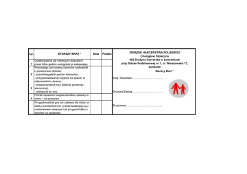 Lp. STARSZY BRAT * Opiekowała/ał się młodszym dzieckiem 1 przez kilka godzin umiejętnie je zabawiając Pozostając pod opieką rodziców zadbała/ał o powierzone dziecko 2 - przestrzegała/ał godzin karmienia, - przygotowała/ał do wyjścia na spacer w odpowiednim ubraniu, - towarzyszyła/ył przy toalecie porannej i 3 wieczornej, - ułoŜyła/ał do snu. Potrafi zapewnić bezpieczeństwo zabawy w 4 domu i na spacerze. Przygotowała/ał grę lub zabawę dla dzieci w wieku przedszkolnym, przeprowadzając ją z rodzeństwem własnym lub przyjaciół albo z dziećmi na podwórku Data Podpis ZWIĄZEK HARCERSTWA POLSKIEGO Chorągiew Stołeczna 462 DruŜyna Harcerska w Łomiankach przy Szkole Podstawowej nr 1, ul. Warszawska 73, Łomianki Starszy Brat * Imię i Nazwisko …………………………… DruŜyna/Zastęp ………………………….. DruŜynowy ………………………………..