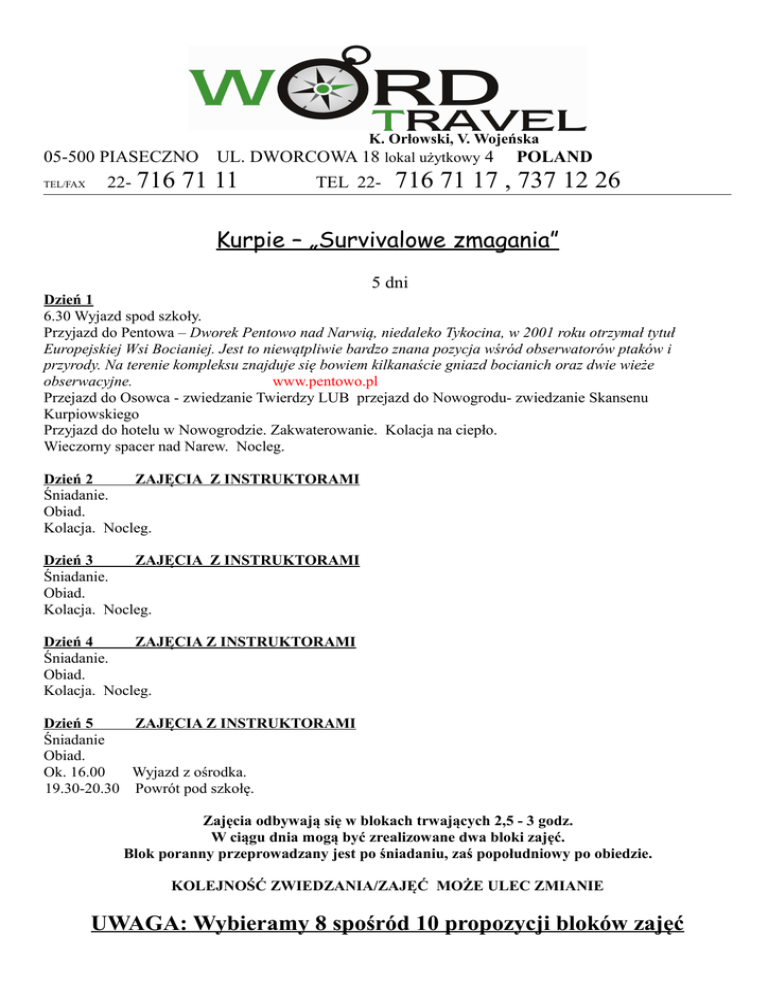 05-500 PIASECZNO TEL/FAX 22- 716 K. Orłowski, V. Wojeńska UL. DWORCOWA 18 lokal użytkowy 4 POLAND 71 11 TEL 22- 716 71 17 , 737 12 26 Kurpie – „Survivalowe zmagania” 5 dni Dzień 1 6.30 Wyjazd spod szkoły. Przyjazd do Pentowa – Dworek Pentowo nad Narwią, niedaleko Tykocina, w 2001 roku otrzymał tytuł Europejskiej Wsi Bocianiej. Jest to niewątpliwie bardzo znana pozycja wśród obserwatorów ptaków i przyrody. Na terenie kompleksu znajduje się bowiem kilkanaście gniazd bocianich oraz dwie wieże obserwacyjne. www.pentowo.pl Przejazd do Osowca - zwiedzanie Twierdzy LUB przejazd do Nowogrodu- zwiedzanie Skansenu Kurpiowskiego Przyjazd do hotelu w Nowogrodzie. Zakwaterowanie. Kolacja na ciepło. Wieczorny spacer nad Narew. Nocleg. Dzień 2 ZAJĘCIA Z INSTRUKTORAMI Śniadanie. Obiad. Kolacja. Nocleg. Dzień 3 ZAJĘCIA Z INSTRUKTORAMI Śniadanie. Obiad. Kolacja. Nocleg. Dzień 4 ZAJĘCIA Z INSTRUKTORAMI Śniadanie. Obiad. Kolacja. Nocleg. Dzień 5 ZAJĘCIA Z INSTRUKTORAMI Śniadanie Obiad. Ok. 16.00 Wyjazd z ośrodka. 19.30-20.30 Powrót pod szkołę. Zajęcia odbywają się w blokach trwających 2,5 - 3 godz. W ciągu dnia mogą być zrealizowane dwa bloki zajęć. Blok poranny przeprowadzany jest po śniadaniu, zaś popołudniowy po obiedzie. KOLEJNOŚĆ ZWIEDZANIA/ZAJĘĆ MOŻE ULEC ZMIANIE UWAGA: Wybieramy 8 spośród 10 propozycji bloków zajęć blok 1: Gigantyczne Piłkarzyki : Widowiskowy mecz w piłkę nożną rozgrywany w dmuchanym boisku piłkarskim. Zawodnicy zostają ubrani w nietypowe spódnice lub przyczepieni do poziomych belek. Skrępowane ruchy i niezdarne próby oddania strzału są zabawne zarówno dla grających jak i obserwujących grę. Dmuchawki: Zapoznanie z jedną z najstarszych broni myśliwskich południowoamerykańskich Indian. Nauka obsługi i strzelania do celu z profesjonalnych dmuchawek sportowych. Samodzielne robienie strzałek. Slackline: Balansowanie na specjalnej dynamicznej taśmie rozpiętej między drzewami. blok 2: Turniej team building: Zajęcia rozwijające umiejętności radzenia sobie w trudnych sytuacjach. Problemowe zadania stawiane przed grupą mające na celu zintegrować zespół we wspólnym dążeniu do celu poprzez aktywność i zabawę. Wiele ciekawych konkurencji, np. narty wieloosobowe, gąsienica, wyścig w spodniach na 3 nogi, latający dywan, wodnik, skaczące rury, wyścig na skrzynkach, przeciąganie liny i inne. blok 3: Ring bokserski: Zabawny pojedynek w dmuchanym ringu, przy użyciu gigantycznych rękawic bokserskich. Lucznictwo: Zapoznanie się z budową łuku, techniką strzelecką, omówienie zasad bezpieczeństwa, rodzaje łuków i ich zastosowanie. Strzelanie do tarcz z łuków sportowych. Elementy survivalu: Zadania tematyczne z survivalu: rozpalanie ognia, zdobywania pożywienia, sprzęt survivalowy. Budowanie szałasu: rodzaje szałasów, metody konstrukcji, cele i zastosowania; sprawdzenie umiejętności współpracy poprzez zespołowe wykonanie szałasu. blok 4: Przemarsze: Integracja na wojskowo. Piosenka marszowa powiązana z musztrą, nauką podstawowych komend wojskowych oraz zabawna prezentacja defilad przygotowanych przez uczestników. blok 5: Gladiatorzy: Zawodnicy stoją na podwyższeniu, próbują zepchnąć siebie piankowymi pałkami. Wyprawa po lodowe złoto: Zadanie terenowe na orientację, sprawdzające umiejętności poruszania się w terenie, z wykorzystaniem map oraz wskazówek instruktora. Symulator strzelecki: Wirtualne polowanie z wykorzystaniem multimedialnego sprzętu. Pasjonujący trening myśliwski oraz doskonała rozrywka dla każdego blok 6: Survivalowy tor przeszkód Integracyjna zabawa terenowa, podczas której uczestnicy podzieleni na drużyny zmierzają się z różnorodnymi zadaniami związanymi z tematyką survivalu. Wyzwaniem jest np. jak najszybsze rozpalenie ognia, uzyskanie określonej liczby punktów na tarczy strzeleckiej, odnalezienie ukrytego skarbu za pomocą wykrywacza metali. blok 7: Bumperball: Superbezpieczna zabawa polegająca na zapasach uczniów ubranych w dmuchane kule. Strzelnica paintballowa: Strzelanie do celu z broni paintballowej za pomocą gumowych kulek. Podstawy pierwszej pomocy: Zachowanie w przypadku zranień, złamań, omdleń, oparzeń, odmrożeń itp., pozycja właściwa bezpieczna, budowa prowizorycznych noszy, ratownictwo wodne, ćwiczenia z rzutki ratowniczej. blok 8: Gry terenowe: Strażnik totemu – zabawa leśna angażująca uczestników do współpracy i pozwalająca wykazać się umiejętnościami poruszania się po terenie. Zdobywanie flagi – zabawa leśna, angażująca cały zespół do odebrania flagi przeciwnikowi bądź też skutecznej jej ochrony. blok 9: Bramka radarowo – celnościowa: Oddawanie strzałów w dmuchaną bramkę badającą szybkość oddanego strzału oraz w celu rozgrywania zawodów na najcelniejszy strzał zajęć. Terenoznawstwo: Wyznaczanie kierunku, zadania terenowe na orientację sprawdzające umiejętność poruszania się w terenie. Strzelectwo: Zajęcia strzeleckie z wykorzystaniem broni pneumatycznej. Zadania sprawdzające pewność ręki oraz celność oka, gdzie czasem zwyczajna tarcza strzelecka okazuje się wielkim wyzwaniem. blok 10 Misja exploris: Uczestnicy podzieleni na zespoły, biorą udział w pieszym rajdzie terenowym. Grupy wyposażone w specjalnie przygotowane mapy, pokonują wyznaczoną trasę, na której zmierzają się z konkurencjami technicznymi, militarnymi i survivalowymi. Stawiane przed nimi zadania wymagają zaangażowania i współpracy. Przykładowe konkurencje na trasie przemarszu:zagadka logiczna, pole minowe, ukryte punkty, kratownica. Jest to program orientacyjny, który może ulec zmianom w zależności od predyspozycji oraz zaangażowania uczestników lub warunków atmosferycznych. W przypadku wystąpienia czynników niesprzyjających proponujemy zamianę zajęć na inne. Czynnikiem niesprzyjającym może być: brak technicznej możliwości realizacji zajęć w danym m