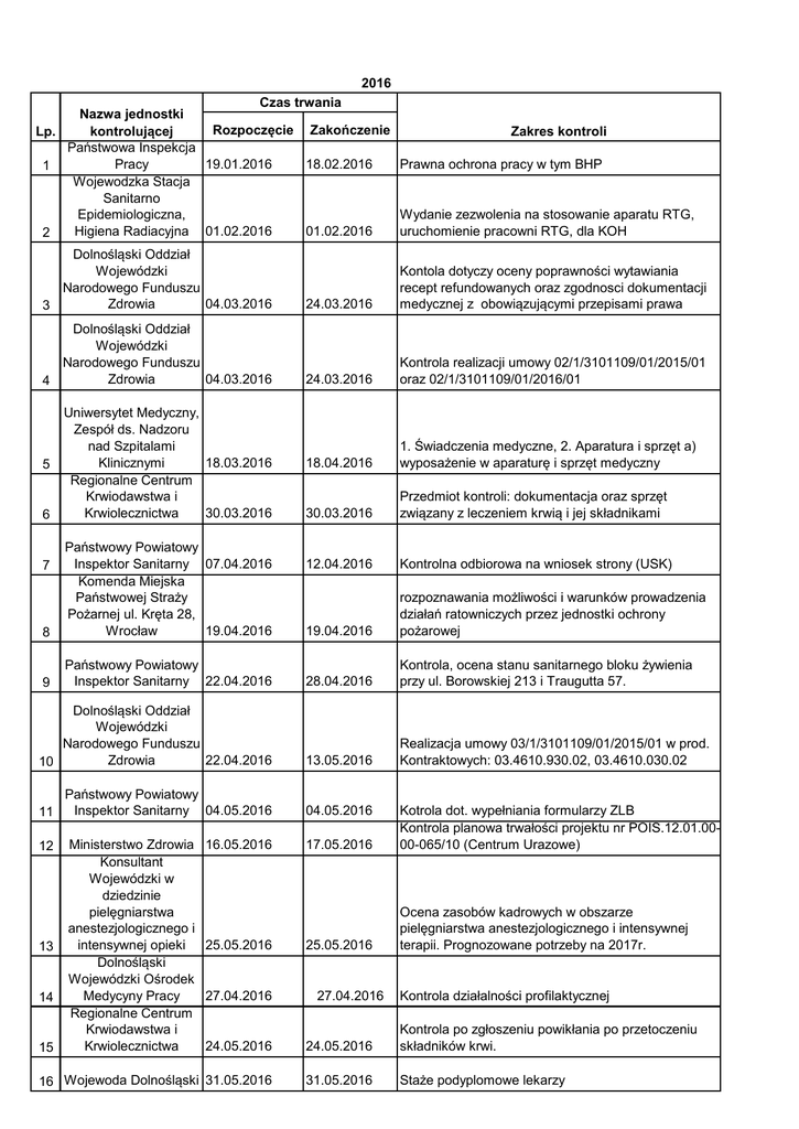 2016 Czas trwania Lp. 1 2 Nazwa jednostki Rozpoczęcie Zakończenie kontrolującej Zakres kontroli Państwowa Inspekcja Pracy 19.01.2016 18.02.2016 Prawna ochrona pracy w tym BHP Wojewodzka Stacja Sanitarno Epidemiologiczna, Wydanie zezwolenia na stosowanie aparatu RTG, Higiena Radiacyjna 01.02.2016 01.02.2016 uruchomienie pracowni RTG, dla KOH Dolnośląski Oddział Wojewódzki Narodowego Funduszu Zdrowia 04.03.2016 3 24.03.2016 Kontola dotyczy oceny poprawności wytawiania recept refundowanych oraz zgodnosci dokumentacji medycznej z obowiązującymi przepisami prawa Dolnośląski Oddział Wojewódzki Narodowego Funduszu Zdrowia 04.03.2016 4 24.03.2016 Kontrola realizacji umowy 02/1/3101109/01/2015/01 oraz 02/1/3101109/01/2016/01 18.04.2016 1. Świadczenia medyczne, 2. Aparatura i sprzęt a) wyposażenie w aparaturę i sprzęt medyczny 30.03.2016 Przedmiot kontroli: dokumentacja oraz sprzęt związany z leczeniem krwią i jej składnikami 12.04.2016 Kontrolna odbiorowa na wniosek strony (USK) 19.04.2016 rozpoznawania możliwości i warunków prowadzenia działań ratowniczych przez jednostki ochrony pożarowej 5 6 Uniwersytet Medyczny, Zespół ds. Nadzoru nad Szpitalami Klinicznymi 18.03.2016 Regionalne Centrum Krwiodawstwa i Krwiolecznictwa 30.03.2016 8 Państwowy Powiatowy Inspektor Sanitarny 07.04.2016 Komenda Miejska Państwowej Straży Pożarnej ul. Kręta 28, Wrocław 19.04.2016 9 Państwowy Powiatowy Inspektor Sanitarny 22.04.2016 28.04.2016 Kontrola, ocena stanu sanitarnego bloku żywienia przy ul. Borowskiej 213 i Traugutta 57. Dolnośląski Oddział Wojewódzki Narodowego Funduszu Zdrowia 22.04.2016 10 13.05.2016 Realizacja umowy 03/1/3101109/01/2015/01 w prod. Kontraktowych: 03.4610.930.02, 03.4610.030.02 Państwowy Powiatowy Inspektor Sanitarny 04.05.2016 11 04.05.2016 7 12 13 14 Ministerstwo Zdrowia Konsultant Wojewódzki w dziedzinie pielęgniarstwa anestezjologicznego i intensywnej opieki Dolnośląski Wojewódzki Ośrodek Medycyny Pracy Regionalne Centrum Krwiodawstwa i Krwiolecznictwa 16.05.2016 25.05.2016 27.04.2016 17.05.2016 Kotrola dot. wypełniania formularzy ZLB Kontrola planowa trwałości projektu nr POIS.12.01.0000-065/10 (Centrum Urazowe) 25.05.2016 Ocena zasobów kadrowych w obszarze pielęgniarstwa anestezjologicznego i intensywnej terapii. Prognozowane potrzeby na 2017r. 27.04.2016 Kontrola działalności profilaktycznej 24.05.2016 24.05.2016 Kontrola po zgłoszeniu powikłania po przetoczeniu składników krwi. 16 Wojewoda Dolnośląski 31.05.2016 31.05.2016 Staże podyplomowe lekarzy 15