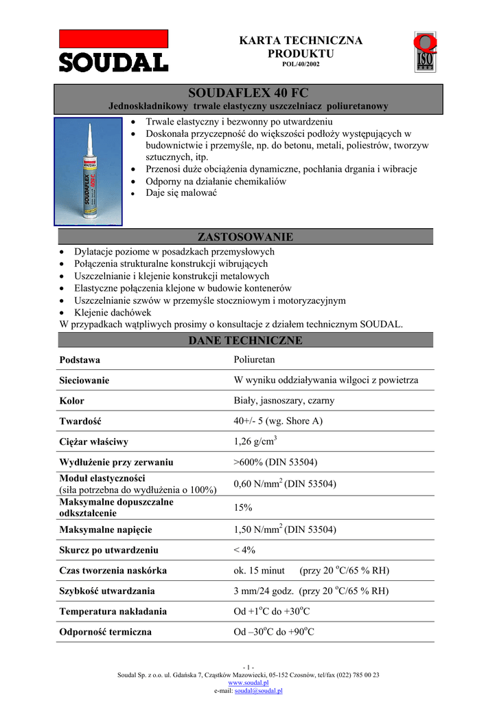 KARTA TECHNICZNA PRODUKTU POL/40/2002 SOUDAFLEX 40 FC Jednoskładnikowy trwale elastyczny uszczelniacz poliuretanowy • • • • • Trwale elastyczny i bezwonny po utwardzeniu Doskonała przyczepność do większości podłoży występujących w budownictwie i przemyśle, np. do betonu, metali, poliestrów, tworzyw sztucznych, itp. Przenosi duże obciążenia dynamiczne, pochłania drgania i wibracje Odporny na działanie chemikaliów Daje się malować ZASTOSOWANIE • Dylatacje poziome w posadzkach przemysłowych • Połączenia strukturalne konstrukcji wibrujących • Uszczelnianie i klejenie konstrukcji metalowych • Elastyczne połączenia klejone w budowie kontenerów • Uszczelnianie szwów w przemyśle stoczniowym i motoryzacyjnym • Klejenie dachówek W przypadkach wątpliwych prosimy o konsultacje z działem technicznym SOUDAL. DANE TECHNICZNE Podstawa Poliuretan Sieciowanie W wyniku oddziaływania wilgoci z powietrza Kolor Biały, jasnoszary, czarny Twardość 40+/- 5 (wg. Shore A) Ciężar właściwy 1,26 g/cm3 Wydłużenie przy zerwaniu >600% (DIN 53504) Moduł elastyczności (siła potrzebna do wydłużenia o 100%) Maksymalne dopuszczalne odkształcenie 0,60 N/mm2 (DIN 53504) Maksymalne napięcie 1,50 N/mm2 (DIN 53504) Skurcz po utwardzeniu < 4% Czas tworzenia naskórka ok. 15 minut Szybkość utwardzania 3 mm/24 godz. (przy 20 oC/65 % RH) Temperatura nakładania Od +1oC do +30oC Odporność termiczna Od –30oC do +90oC 15% (przy 20 oC/65 % RH) -1Soudal Sp. z o.o. ul. Gdańska 7, Cząstków Mazowiecki, 05-152 Czosnów, tel/fax (022) 785 00 23 www.soudal.pl e-mail: [email protected] Opakowanie Wymiary spoin Kartusz 310 ml, 12 sztuk w kartonie folia 600 ml, 12 sztuk w kartonie Uszczelnianie: Minimalna szerokość fugi - 5 mm Zalecamy stosowanie następującej zależności: Szerokość fugi w mm: 5 10 15 20 25 30 Głębokość fugi w mm: 5 10 10 12 15 15 Przy fugach > 30 mm prosimy o kontakt z działem technicznym firmy Soudal Klejenie: min. grubość spoiny - 2mm, max. grubość spoiny - 10 mm min. szerokość spoiny - 5 mm PRZECHOWYWANIE 9 miesięcy w fabrycznym opakowaniu, w suchym i chłodnym miejscu, w temperaturach od + 5°C do + 25°C. NORMY I CERTYFIKATY Produkt wytwarzany jest przez firmę SOUDAL NV w Turnhout w Belgii, zgodnie z wymogami jakościowymi normy ISO 9002. Posiada następujące dopuszczenia do obrotu: Polska: Aprobata ITB AT 15-4790/2001, Atest PZH HK/B/1262/01/98 Francja: SNJF – kat. 1 SPOSÓB UŻYCIA • • • • • Wszystkie podłoża muszą być czyste, suche, wolne od tłuszczu i luźnych zanieczyszczeń (kurz, stare szczeliwa, itp.). Podłoża porowate można zagruntować podkładem Soudal Primer 100. Aby uniknąć zabrudzenia brzegów spoin, a także w celu uzyskania prostej linii, należy osłonić okolice fugi taśmą maskującą, którą usuwa się natychmiast po obróbce fugi Produkt wyciskać ręcznym lub pneumatycznym pistoletem dopasowanym do rodzaju opakowania Czyszczenie narzędzi i podłoża: benzyną lakową bezpośrednio po użyciu. ZALECENIA BHP Przy użyciu uszczelniacza przestrzegać zwykłych zasad higieny pracy, a w szczególności: • unikać kontaktu ze skórą • w przypadku kontaktu ze skórą przemyć natychmiast wodą • może wywoływać podrażnienia oczu • w czasie pracy dobrze wietrzyć pomieszczenie • chronić przed dziećmi Uwaga: Wskazówki zawarte w tym dokumencie są wynikami naszych doświadczeń i praktyki. Ze względu na różnorodność materiałów i podłoży oraz wielorakość możliwych zastosowań, które pozostają poza naszą kontrolą, nie możemy przyjmować jakiejkolwiek odpowiedzialności za otrzymane rezultaty. We wszystkich przypadkach zaleca się przeprowadzenie próby. -2Soudal Sp. z o.o. ul. Gdańska 7, Cząstków Mazowiecki, 05-152 Czosnów, tel/fax (022) 785 00 23 www.soudal.pl e-mail: [email protected] KARTA TECHNICZNA PRODUKTU SD/235/2002 SOUDASEAL 235 SF Jednoskładnikowy trwale elastyczny klej-uszczelniacz na bazie MS POLYMER® • Doskonała przyczepność do wszelkich podłoŜy poliestrowych metalowych, drewnianych • MoŜna go nakładać nawet na wilgotne powierzchnie • Bezwonny, nie zawiera rozpuszczalników • NiewraŜliwy na działanie wielu chemikaliów • Po utwardzeniu daje się malować, równieŜ farbami wodnymi • Nie przebarwia powierzchni porowatych (np. kamienia naturalnego) • Odporny na działanie warunków atmosferycznych i promieniowania UV • Nie zawiera izocyjanianów ZASTOSOWANIE • Uszczelnienia strukturalne, gdzie wymagana jest elastyczność i wysoka siła spojenia • Połączenia strukturalne w konstrukcjach wibrujących • Idealny do połączeń elastycznych w przemyśle stoczniowym, samochodowym i budowie kontenerów W przypadkach wątpliwych prosimy o konsultacje z działem technicznym SOUDAL. DANE TECHNICZNE Podstawa MS POLYMER® Kolor Biały, czarny. Inne kolory na Ŝyczenie klienta Sieciowanie W wyniku oddziaływania wilgoci z powietrza WydłuŜenie przy zerwaniu 800 % (DIN 53504) Twardość 38 +/- 5 (wg. Shore A) CięŜar właściwy 1,40 g/cm3 Moduł elastyczności (siła potrzebna do wydłuŜenia o 100%) 0,75 N/mm2 ( DIN 53504) Maksymalne dopuszczalne odkształcenie ± 25 % Wymiary spoin Uszczelnianie: min. szerokość fugi - 5 mm Zalecamy stosowanie następującej zaleŜności: Szerokość fugi w mm: 5 10 15 20 25 30 Głębokość fugi w mm: 7,5 10 10 12 15 15 Klejenie: min. grubość spoiny– 2mm min. szerokość spoiny - 5 mm Czas tworzenia naskórka Ok. 12 minut (przy 20 oC/65 % RH) Szybkość utwardzania 3 mm/24 godz. (przy 20 oC/65 % RH) Temperatura nakładania Od +5oC do +30oC Odporność termiczna Od - 40 °C do + 90 °C -1Soudal Sp. z o.o. ul. Gdańska 7, Cząstków Mazowiecki, 05-152 Czosnów, tel/fax (022) 785 00 23 www.soudal.pl e-mail: [email protected] Odporność chemiczna Bardzo dobra odporność, jeśli chodzi o wodę, wodę słoną, tłuszcze alifatyczne, rozcieńczone kwasy i zasady, jak równieŜ oleje m