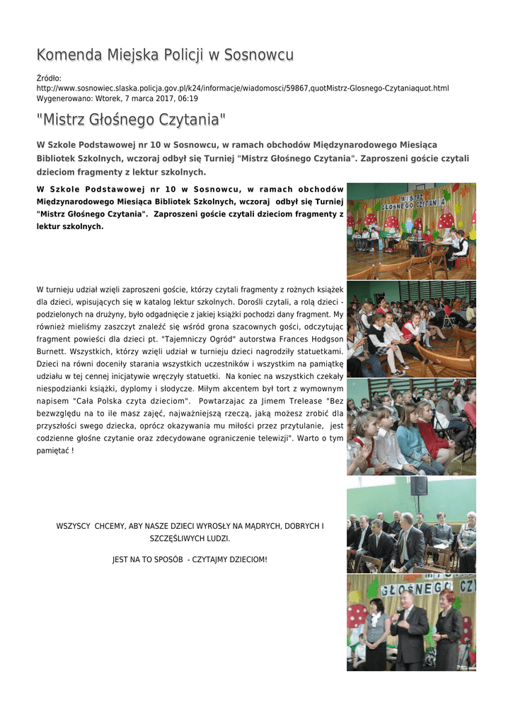 Komenda Miejska Policji w Sosnowcu Źródło: http://www.sosnowiec.slaska.policja.gov.pl/k24/informacje/wiadomosci/59867,quotMistrz-Glosnego-Czytaniaquot.html Wygenerowano: Wtorek, 7 marca 2017, 06:19 "Mistrz Głośnego Czytania" W Szkole Podstawowej nr 10 w Sosnowcu, w ramach obchodów Międzynarodowego Miesiąca Bibliotek Szkolnych, wczoraj odbył się Turniej "Mistrz Głośnego Czytania". Zaproszeni goście czytali dzieciom fragmenty z lektur szkolnych. W Szkole Podstawowej nr 10 w Sosnowcu, w ramach obchodów Międzynarodowego Miesiąca Bibliotek Szkolnych, wczoraj odbył się Turniej "Mistrz Głośnego Czytania". Zaproszeni goście czytali dzieciom fragmenty z lektur szkolnych. W turnieju udział wzięli zaproszeni goście, którzy czytali fragmenty z rożnych książek dla dzieci, wpisujących się w katalog lektur szkolnych. Dorośli czytali, a rolą dzieci podzielonych na drużyny, było odgadnięcie z jakiej książki pochodzi dany fragment. My również mieliśmy zaszczyt znaleźć się wśród grona szacownych gości, odczytując fragment powieści dla dzieci pt. "Tajemniczy Ogród" autorstwa Frances Hodgson Burnett. Wszystkich, którzy wzięli udział w turnieju dzieci nagrodziły statuetkami. Dzieci na równi doceniły starania wszystkich uczestników i wszystkim na pamiątkę udziału w tej cennej inicjatywie wręczyły statuetki. Na koniec na wszystkich czekały niespodzianki książki, dyplomy i słodycze. Miłym akcentem był tort z wymownym napisem "Cała Polska czyta dzieciom". Powtarzajac za Jimem Trelease "Bez bezwzględu na to ile masz zajęć, najważniejszą rzeczą, jaką możesz zrobić dla przyszłości swego dziecka, oprócz okazywania mu miłości przez przytulanie, jest codzienne głośne czytanie oraz zdecydowane ograniczenie telewizji". Warto o tym pamiętać ! WSZYSCY CHCEMY, ABY NASZE DZIECI WYROSŁY NA MĄDRYCH, DOBRYCH I SZCZĘŚLIWYCH LUDZI. JEST NA TO SPOSÓB - CZYTAJMY DZIECIOM! Ocena: 0/5 (0) Tweetnij