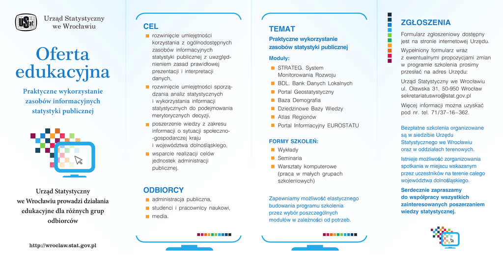Urząd Statystyczny we Wrocławiu Oferta edukacyjna Praktyczne wykorzystanie zasobów informacyjnych statystyki publicznej CEL rozwinięcie umiejętności korzystania z ogólnodostępnych zasobów informacyjnych statystyki publicznej z uwzględnieniem zasad prawidłowej prezentacji i interpretacji danych, rozwinięcie umiejętności sporządzania analiz statystycznych i wykorzystania informacji statystycznych do podejmowania merytorycznych decyzji, poszerzenie wiedzy z zakresu informacji o sytuacji społeczno-gospodarczej kraju i województwa dolnośląskiego, wsparcie realizacji celów jednostek administracji publicznej. Urząd Statystyczny we Wrocławiu prowadzi działania edukacyjne dla różnych grup odbiorców http://wroclaw.stat.gov.pl TEMAT Praktyczne wykorzystanie zasobów statystyki publicznej Moduły: STRATEG. System Monitorowania Rozwoju BDL. Bank Danych Lokalnych Portal Geostatystyczny Baza Demografia Dziedzinowe Bazy Wiedzy Atlas Regionów Portal Informacyjny EUROSTATU FORMY SZKOLEŃ: Wykłady Seminaria Warsztaty komputerowe (praca w małych grupach szkoleniowych) ODBIORCY administracja publiczna, studenci i pracownicy naukowi, media. Zapewniamy możliwość elastycznego budowania programu szkolenia przez wybór poszczególnych modułów w zależności od potrzeb. ZGŁOSZENIA Formularz zgłoszeniowy dostępny jest na stronie internetowej Urzędu. Wypełniony formularz wraz z ewentualnymi propozycjami zmian w programie szkolenia prosimy przesłać na adres Urzędu: Urząd Statystyczny we Wrocławiu ul. Oławska 31, 50-950 Wrocław [email protected] Więcej informacji można uzyskać pod nr. tel. 71 / 37–16 – 362. Bezpłatne szkolenia organizowane są w siedzibie Urzędu Statystycznego we Wrocławiu oraz w oddziałach terenowych. Istnieje możliwość zorganizowania spotkania w miejscu wskazanym przez uczestników na terenie całego województwa dolnośląskiego. Serdecznie zapraszamy do współpracy wszystkich zainteresowanych poszerzaniem wiedzy statystycznej.