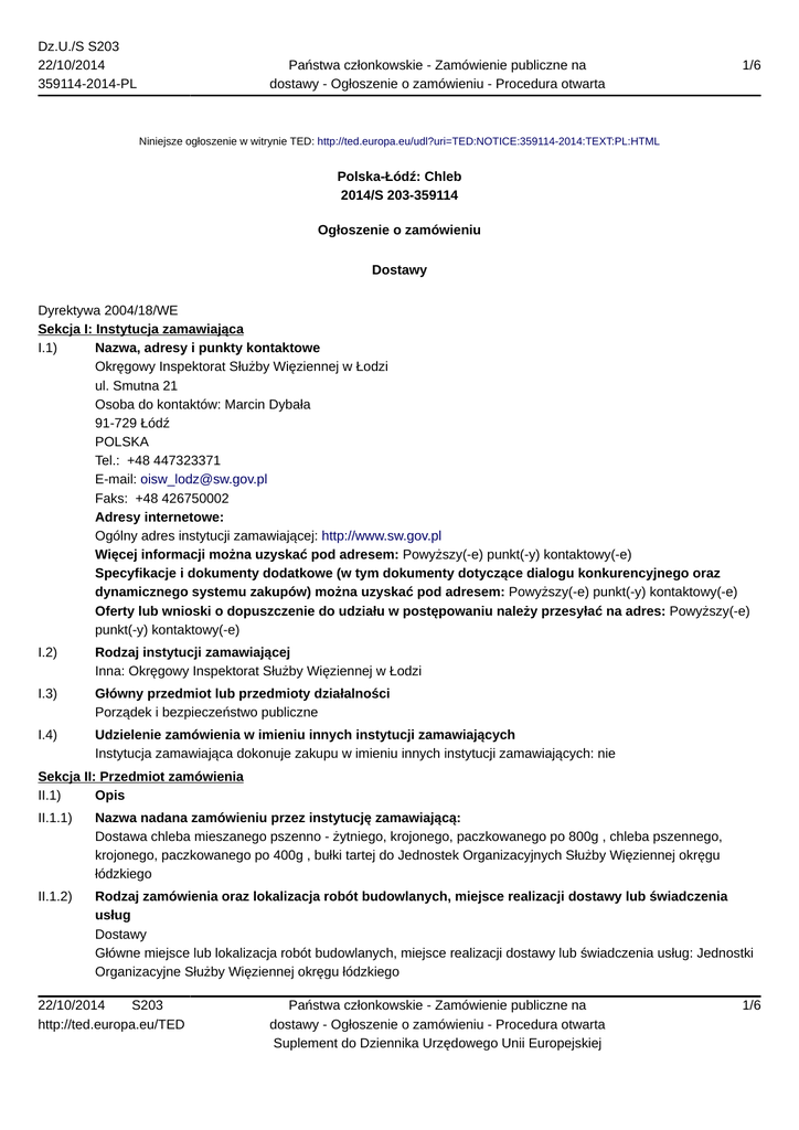 Dz.U./S S203 22/10/2014 359114-2014-PL Państwa członkowskie - Zamówienie publiczne na dostawy - Ogłoszenie o zamówieniu - Procedura otwarta 1/6 Niniejsze ogłoszenie w witrynie TED: http://ted.europa.eu/udl?uri=TED:NOTICE:359114-2014:TEXT:PL:HTML Polska-Łódź: Chleb 2014/S 203-359114 Ogłoszenie o zamówieniu Dostawy Dyrektywa 2004/18/WE Sekcja I: Instytucja zamawiająca I.1) Nazwa, adresy i punkty kontaktowe Okręgowy Inspektorat Służby Więziennej w Łodzi ul. Smutna 21 Osoba do kontaktów: Marcin Dybała 91-729 Łódź POLSKA Tel.: +48 447323371 E-mail: [email protected] Faks: +48 426750002 Adresy internetowe: Ogólny adres instytucji zamawiającej: http://www.sw.gov.pl Więcej informacji można uzyskać pod adresem: Powyższy(-e) punkt(-y) kontaktowy(-e) Specyfikacje i dokumenty dodatkowe (w tym dokumenty dotyczące dialogu konkurencyjnego oraz dynamicznego systemu zakupów) można uzyskać pod adresem: Powyższy(-e) punkt(-y) kontaktowy(-e) Oferty lub wnioski o dopuszczenie do udziału w postępowaniu należy przesyłać na adres: Powyższy(-e) punkt(-y) kontaktowy(-e) I.2) Rodzaj instytucji zamawiającej Inna: Okręgowy Inspektorat Służby Więziennej w Łodzi I.3) Główny przedmiot lub przedmioty działalności Porządek i bezpieczeństwo publiczne I.4) Udzielenie zamówienia w imieniu innych instytucji zamawiających Instytucja zamawiająca dokonuje zakupu w imieniu innych instytucji zamawiających: nie Sekcja II: Przedmiot zamówienia II.1) Opis II.1.1) Nazwa nadana zamówieniu przez instytucję zamawiającą: Dostawa chleba mieszanego pszenno - żytniego, krojonego, paczkowanego po 800g , chleba pszennego, krojonego, paczkowanego po 400g , bułki tartej do Jednostek Organizacyjnych Służby Więziennej okręgu łódzkiego II.1.2) Rodzaj zamówienia oraz lokalizacja robót budowlanych, miejsce realizacji dostawy lub świadczenia usług Dostawy Główne miejsce lub lokalizacja robót budowlanych, miejsce realizacji dostawy lub świadczenia usług: Jednostki Organizacyjne Służby Więziennej okręgu łódzkiego 22/10/2014 S203 http://ted.europa.eu/TED Państwa członkowskie - Zamówienie publiczne na dostawy - Ogłoszenie o zamówieniu - Procedura otwarta Suplement do Dziennika Urzędowego Unii Europejskiej 1/6 Dz.U./S S203 22/10/2014 359114-2014-PL Państwa członkowskie - Zamówienie publiczne na dostawy - Ogłoszenie o zamówieniu - Procedura otwarta 2/6 Kod NUTS II.1.3) Informacje na temat zamówienia publicznego, umowy ramowej lub dynamicznego systemu zakupów (DSZ) Ogłoszenie dotyczy zamówienia publicznego II.1.4) Informacje na temat umowy ramowej II.1.5) Krótki opis zamówienia lub zakupu Dostawa chleba mieszanego pszenno - żytniego, krojonego, paczkowanego po 800g , chleba pszennego, krojonego, paczkowanego po 400g , bułki tartej do Jednostek Organizacyjnych Służby Więziennej okręgu łódzkiego II.1.6) Wspólny Słownik Zamówień (CPV) 15811100 II.1.7) Informacje na temat Porozumienia w sprawie zamówień rządowych (GPA) Zamówienie jest objęte Porozumieniem w sprawie zamówień rządowych (GPA): nie II.1.8) Części To zamówienie podzielone jest na części: tak Oferty można składać w odniesieniu do jednej lub więcej części II.1.9) Informacje o ofertach wariantowych Dopuszcza się składanie ofert wariantowych: nie II.2) Wielkość lub zakres zamówienia II.2.1) Całkowita wielkość lub zakres: Dostawa chleba mieszanego pszenno - żytniego, krojonego, paczkowanego po 800g , chleba pszennego, krojonego, paczkowanego po 400g , bułki tartej do Jednostek Organizacyjnych Służby Więziennej okręgu łódzkiego II.2.2) Informacje o opcjach Opcje: nie II.2.3) Informacje o wznowieniach Jest to zamówienie podlegające wznowieniu: nie II.3) Czas trwania zamówienia lub termin realizacji Rozpoczęcie 1.1.2015. Zakończenie 31.12.2015 Informacje o częściach zamówienia Część nr: 1 Nazwa: Dostawa chleba mieszanego pszenno - żytniego, krojonego, paczkowanego po 800g , chleba pszennego, krojonego, paczkowanego po 400g , bułki tartej do Jednostek Organizacyjnych Służby Więziennej okręgu łódzkiego 1) Krótki opis CZĘŚĆ I a. Chleb mieszany pszenno - żytni, krojony, paczkowany po 800g – 344 100 kg b. Chleb pszenny, krojony, paczkowany po 400g – 67 710 kg c. Bułka tarta – 1 210 kg Dostawy będą realizowane do następujących jednostek organizacyjnych Służby Więziennej: Jednostka organizacyjna Chleb mieszany pszenno - żytni, krojony, paczkowany po 800g Chleb pszenny, krojony, paczkowany po 400g Bułka tarta ZK Płock 110 000 kg 30 000 kg 500 kg ZK Garbalin 124 100 kg 19 710 kg 480 kg 22/10/2014 S203 http://ted.europa.eu/TED Państwa członkowskie - Zamówienie publiczne na dostawy - Ogłoszenie o zamówieniu - Procedura otwarta Suplement do Dziennika Urzędowego Unii Europejskiej 2/6 Dz.U./S S203 22/10/2014 359114-2014-PL Państwa członkowskie - Zamówienie publiczne na dostawy - Ogłoszenie o zamówieniu - Procedura otwarta 3/6 ZK Łowicz 110 000 kg 18 000 kg 230 kg 2) Wspólny Słownik Zamówień (CPV) 15811100 3) Wielkość lub zakres CZĘŚĆ I a. Chleb mieszany pszenno - żytni, krojony, paczkowany po 800g – 344 100 kg b. Chleb pszenny, krojony, paczkowany po 400g – 67 710 kg c. Bułka tarta – 1 210 kg Dostawy będą realizowane do następujących jednostek organizacyjnych Służby Więziennej: Jednostka organizacyjna Chleb mieszany pszenno - żytni, krojony, paczkowany po 800g Chleb pszenny, krojony, paczkowany po 400g Bułka tarta ZK Płock 110 000 kg 30 000 kg 500 kg ZK Garbalin 124 100 kg 19 710 kg 480 kg ZK Łowicz 110 000 kg 18 000 kg 230 kg 4) Informacje o różnych datach dotyczących czasu trwania lub rozpoczęcia/realizacji zamówienia Rozpoczęcie 1.1.2015. Zakończenie 31.12.2015 5) Informacje dodatkowe na temat części zamówienia Część nr: 2 Nazwa: Dostawa chleba mieszanego pszenno - żytniego, krojonego, paczkowanego po 800g , chleba pszennego, krojonego, paczkowanego po 400g , bułki tartej do Jedn