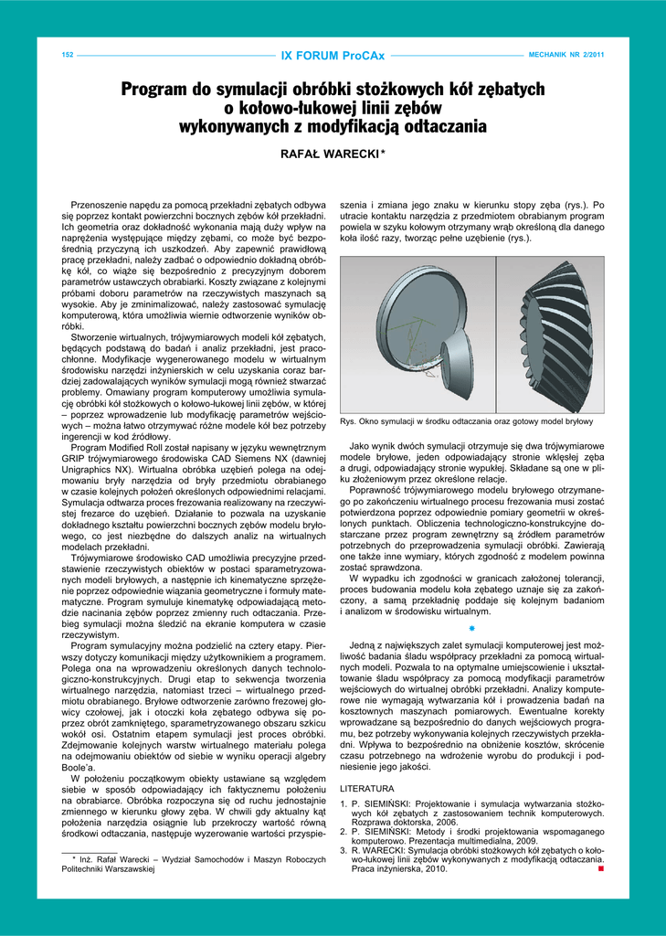 152 IX FORUM ProCAx MECHANIK NR 2/2011 Program do symulacji obróbki stożkowych kół zębatych o kołowo-łukowej linii zębów wykonywanych z modyfikacją odtaczania RAFAŁ WARECKI * Przenoszenie napędu za pomocą przekładni zębatych odbywa się poprzez kontakt powierzchni bocznych zębów kół przekładni. Ich geometria oraz dokładność wykonania mają duży wpływ na naprężenia występujące między zębami, co może być bezpośrednią przyczyną ich uszkodzeń. Aby zapewnić prawidłową pracę przekładni, należy zadbać o odpowiednio dokładną obróbkę kół, co wiąże się bezpośrednio z precyzyjnym doborem parametrów ustawczych obrabiarki. Koszty związane z kolejnymi próbami doboru parametrów na rzeczywistych maszynach są wysokie. Aby je zminimalizować, należy zastosować symulację komputerową, która umożliwia wiernie odtworzenie wyników obróbki. Stworzenie wirtualnych, trójwymiarowych modeli kół zębatych, będących podstawą do badań i analiz przekładni, jest pracochłonne. Modyfikacje wygenerowanego modelu w wirtualnym środowisku narzędzi inżynierskich w celu uzyskania coraz bardziej zadowalających wyników symulacji mogą również stwarzać problemy. Omawiany program komputerowy umożliwia symulację obróbki kół stożkowych o kołowo-łukowej linii zębów, w której – poprzez wprowadzenie lub modyfikację parametrów wejściowych – można łatwo otrzymywać różne modele kół bez potrzeby ingerencji w kod źródłowy. Program Modified Roll został napisany w języku wewnętrznym GRIP trójwymiarowego środowiska CAD Siemens NX (dawniej Unigraphics NX). Wirtualna obróbka uzębień polega na odejmowaniu bryły narzędzia od bryły przedmiotu obrabianego w czasie kolejnych położeń określonych odpowiednimi relacjami. Symulacja odtwarza proces frezowania realizowany na rzeczywistej frezarce do uzębień. Działanie to pozwala na uzyskanie dokładnego kształtu powierzchni bocznych zębów modelu bryłowego, co jest niezbędne do dalszych analiz na wirtualnych modelach przekładni. Trójwymiarowe środowisko CAD umożliwia precyzyjne przedstawienie rzeczywistych obiektów w postaci sparametryzowanych modeli bryłowych, a następnie ich kinematyczne sprzężenie poprzez odpowiednie wiązania geometryczne i formuły matematyczne. Program symuluje kinematykę odpowiadającą metodzie nacinania zębów poprzez zmienny ruch odtaczania. Przebieg symulacji można śledzić na ekranie komputera w czasie rzeczywistym. Program symulacyjny można podzielić na cztery etapy. Pierwszy dotyczy komunikacji między użytkownikiem a programem. Polega ona na wprowadzeniu określonych danych technologiczno-konstrukcyjnych. Drugi etap to sekwencja tworzenia wirtualnego narzędzia, natomiast trzeci – wirtualnego przedmiotu obrabianego. Bryłowe odtworzenie zarówno frezowej głowicy czołowej, jak i otoczki koła zębatego odbywa się poprzez obrót zamkniętego, sparametryzowanego obszaru szkicu wokół osi. Ostatnim etapem symulacji jest proces obróbki. Zdejmowanie kolejnych warstw wirtualnego materiału polega na odejmowaniu obiektów od siebie w wyniku operacji algebry Boole’a. W położeniu początkowym obiekty ustawiane są względem siebie w sposób odpowiadający ich faktycznemu położeniu na obrabiarce. Obróbka rozpoczyna się od ruchu jednostajnie zmiennego w kierunku głowy zęba. W chwili gdy aktualny kąt położenia narzędzia osiągnie lub przekroczy wartość równą środkowi odtaczania, następuje wyzerowanie wartości przyspie* Inż. Rafał Warecki – Wydział Samochodów i Maszyn Roboczych Politechniki Warszawskiej szenia i zmiana jego znaku w kierunku stopy zęba (rys.). Po utracie kontaktu narzędzia z przedmiotem obrabianym program powiela w szyku kołowym otrzymany wrąb określoną dla danego koła ilość razy, tworząc pełne uzębienie (rys.). Rys. Okno symulacji w środku odtaczania oraz gotowy model bryłowy Jako wynik dwóch symulacji otrzymuje się dwa trójwymiarowe modele bryłowe, jeden odpowiadający stronie wklęsłej zęba a drugi, odpowiadający stronie wypukłej. Składane są one w pliku złożeniowym przez określone relacje. Poprawność trójwymiarowego modelu bryłowego otrzymanego po zakończeniu wirtualnego procesu frezowania musi zostać potwierdzona poprzez odpowiednie pomiary geometrii w określonych punktach. Obliczenia technologiczno-konstrukcyjne dostarczane przez program zewnętrzny są źródłem parametrów potrzebnych do przeprowadzenia symulacji obróbki. Zawierają one także inne wymiary, których zgodność z modelem powinna zostać sprawdzona. W wypadku ich zgodności w granicach założonej tolerancji, proces budowania modelu koła zębatego uznaje się za zakończony, a samą przekładnię poddaje się kolejnym badaniom i analizom w środowisku wirtualnym. Jedną z największych zalet symulacji komputerowej jest możliwość badania śladu współpracy przekładni za pomocą wirtualnych modeli. Pozwala to na optymalne umiejscowienie i ukształtowanie śladu współpracy za pomocą modyfikacji parametrów wejściowych do wirtualnej obróbki przekładni. Analizy komputerowe nie wymagają wytwarzania kół i prowadzenia badań na kosztownych maszynach pomiarowych. Ewentualne korekty wprowadzane są bezpośrednio do danych wejściowych programu, bez potrzeby wykonywania kolejnych rzeczywistych przekładni. Wpływa to bezpośrednio na obniżenie kosztów, skrócenie czasu potrzebnego na wdrożenie wyrobu do produkcji i podniesienie jego jakości. LITERATURA 1. P. SIEMIŃSKI: Projektowanie i symulacja wytwarzania stożkowych kół zębatych z zastosowaniem technik komputerowych. Rozprawa doktorska, 2006. 2. P. SIEMIŃSKI: Metody i środki projektowania wspomaganego komputerowo. Prezentacja multimedialna, 2009. 3. R. WARECKI: Symulacja obróbki stożkowych kół zębatych o kołowo-łukowej linii zębów wykonywanych z modyfikacją odtaczania. Praca inżynierska, 2010.