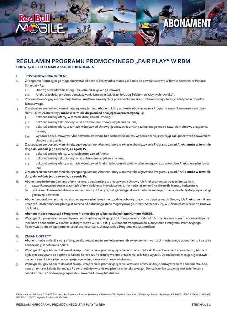 REGULAMIN PROGRAMU PROMOCYJNEGO „FAIR PLAY” W RBM OBOWIĄZUJE OD 17 MARCA 2016 DO ODWOŁANIA I. POSTANOWIENIA OGÓLNE 1. Z Programu Promocyjnego mogą skorzystać Abonenci, którzy od 17 marca 2016 roku do odwołania zawrą w formie pisemnej, w Punkcie Sprzedaży P4: 1.1. Umowę o świadczenie Usług Telekomunikacyjnych („Umowa”), 1.2. Aneks przedłużający okres obowiązywania Umowy o świadczenie Usług Telekomunikacyjnych („Aneks”). Program Promocyjny nie obejmuje Umów i Aneksów zawartych za pośrednictwem sklepu internetowego, telesprzedaży lub u Doradcy Biznesowego. Z zastrzeżeniem postanowień niniejszego regulaminu, Abonent, który w okresie obowiązywania Programu zawarł Umowę na czas określony (Okres Zastrzeżony), może w terminie do 30 dni od dnia jej zawarcia za zgodą P4: 3.1. dokonać zmiany oferty, w ramach której zawarł Umowę; 2. 3. 3.2. 3.3. 4. dokonać zmiany zakupionego wraz z zawarciem Umowy urządzenia na inne; dokonać zmiany oferty w ramach której zawarł Umowę i jednocześnie zmiany zakupionego wraz z zawarciem Umowy urządzenia na inne; 3.4. wypowiedzieć Umowę w trybie natychmiastowym, bez zachowania okresu wypowiedzenia, zwracając zakupione wraz z zawarciem Umowy urządzenie. Z zastrzeżeniem postanowień niniejszego regulaminu, Abonent, który w okresie obowiązywania Programu zawarł Aneks, może w terminie do 30 dni od dnia jego zawarcia, za zgodą P4: 4.1. dokonać zmiany oferty, w ramach której zawarł Aneks; 4.2. dokonać zmiany zakupionego wraz z Aneksem urządzenia na inne; 4.3. 5. 6. 7. 8. 9. dokonać zmiany oferty w ramach której zawarł Aneks i jednocześnie zmiany zakupionego wraz z zawarciem Aneksu urządzenia na inne. Z zastrzeżeniem postanowień niniejszego regulaminu, Abonent, który w okresie obowiązywania Programu zawarł Aneks, może w terminie do 30 dni od dnia jego zawarcia, za zgodą P4: Abonent może dokonać zmiany oferty na inną, obowiązującą w dniu zawarcia Umowy lub Aneksu z tym zastrzeżeniem, że jeśli: a) zawarł Umowę lub Aneks w ramach oferty dla klienta indywidualnego, nie może jej zmienić na ofertę dla biznesu i odwrotnie; b) jeśli zawarł Umowę lub Aneks w ramach oferty dotyczącej usługi dostępu do internetu nie może jej zmienić na ofertę dotycząca usługi głosowej i odwrotnie. Abonent może dokonać zmiany zakupionego urządzenia na inne, zgodnie z obowiązującym na dzień zawarcia Umowy lub Aneksu, cennikiem urządzeń. Dostępność urządzeń jest zależna od aktualnego stanu magazynowego Punktu Sprzedaży P4, w którym została zawarta Umowa lub Aneks. 10. Abonent może skorzystać z Programu Promocyjnego tylko raz dla jednego Numeru MSISDN. W przypadku przeniesienia swoich praw i obowiązków wynikających z Umowy na inny podmiot lub przeniesienia numeru abonenckiego na inne konto abonenckie w okresie, o którym mowa w ust. I. pkt. 3 i 4, Abonent traci prawo do skorzystania z Programu Promocyjnego. Po upływie 30-dniowego terminu na dokonanie zmiany, skorzystanie z Programu nie jest możliwe. II. ZMIANA OFERTY 1. Abonent może zmienić swoją ofertę, co skutkować może zmniejszeniem lub zwiększeniem wartości miesięcznego abonamentu i za taką zmianę nie jest pobierana opłata. 2. W przypadku gdy Abonent dokonał zakupu urządzenia w promocyjnej cenie, a zmiana oferty skutkuje obniżeniem abonamentu, Abonent będzie zobowiązany do dopłaty w Salonie Sprzedaży P4 różnicy w cenie urządzenia, o ile taka wystąpi. Do rozliczenia stosuje się zestawienie cen z cennika urządzeń obowiązującego w dniu zawarcia Umowy lub Aneksu. W przypadku gdy Abonent dokonał zakupu urządzenia w promocyjnej cenie, a zmiana oferty skutkuje podwyższeniem abonamentu, Abonent otrzyma w Salonie Sprzedaży P4 zwrot różnicy w cenie urządzenia, o ile taka wystąpi. Do rozliczenia stosuje się zestawienie cen z cennika urządzeń obowiązującego w dniu zawarcia Umowy lub Aneksu. 3. P4 Sp. z o.o., ul. Taśmowa 7, 02-677 Warszawa, Sąd Rejonowy dla m. st. Warszawy w Warszawie XIII Wydział Gospodarczy Krajowego Rejestru Sądowego, KRS 0000217207, REGON 015808609, NIP 951-21-20-077, kapitał zakładowy 48 856 500 zł REGULAMIN PROGRAMU PROMOCYJNEGO „FAIR PLAY” W RBM STRONA 1 Z 2 III. ZWROT ALBO ZMIANA URZĄDZENIA 1. Abonent może dokonać zmiany zakupionego urządzenia na inne dostępne w cenniku urządzeń obowiązującym w dniu zawarcia Umowy lub Aneksu oraz dostępne w Punkcie Sprzedaży P4 w dniu dokonywania zmiany. W przypadku takiej zmiany brana jest pod uwagę cena urządzenia obowiązująca w dniu zawarcia Umowy lub Aneksu. W przypadku różnicy w cenie urządzeń, Abonent jest zobowiązany do dopłaty różnicy w cenie, albo otrzyma jej zwrot. Zmiana urządzenia na inne, które nie było dostępne w cenniku urządzeń obowiązującym w dniu zawarcia Umowy lub Aneksu, nie jest możliwa. Abonent dokonując zwrotu albo zmiany urządzenia jest zobowiązany do uiszczenia opłaty za korzystanie z urządzenia. Opłaty za korzystanie z urządzenia w zależności od grupy, do której przypisane jest dane urządzenie wynoszą: 2. 3. 4. 5. 6. a) Grupa A – 49 zł z VAT; b) Grupa B – 99 zł z VAT; c) Grupa C – 149 zł z VAT; d) Grupa D – 399 zł z VAT. Zarówno w przypadku wymiany urządzenia, jak i jego zwrotu, opłata za korzystanie z urządzenia pobierana jest w Punkcie Sprzedaży P4 w momencie dokonywania zmiany lub zwrotu. Lista urządzeń z przypisaną wysokością opłaty znajduje się w Cenniku Telefonów, Modemów i Zestawów bez Promocji. 7. Operator będzie uprawniony do odmowy przyjęcia urządzenia zwracanego przez Abonenta w szczególności, w przypadku: 7.1. mechanicznego uszkodzenia urządzenia (w szczególności: obicie, zarysowanie, pęknięcie, zalanie); 7.2. uszkodzenia lub wadliwego działania urządzenia spowodowanego niewłaściwym użytkowaniem, niezgodnym z instrukcją obsługi; 7.3. zniszczenia obudowy urządzenia (w szczególności: zabrudzenie długop
