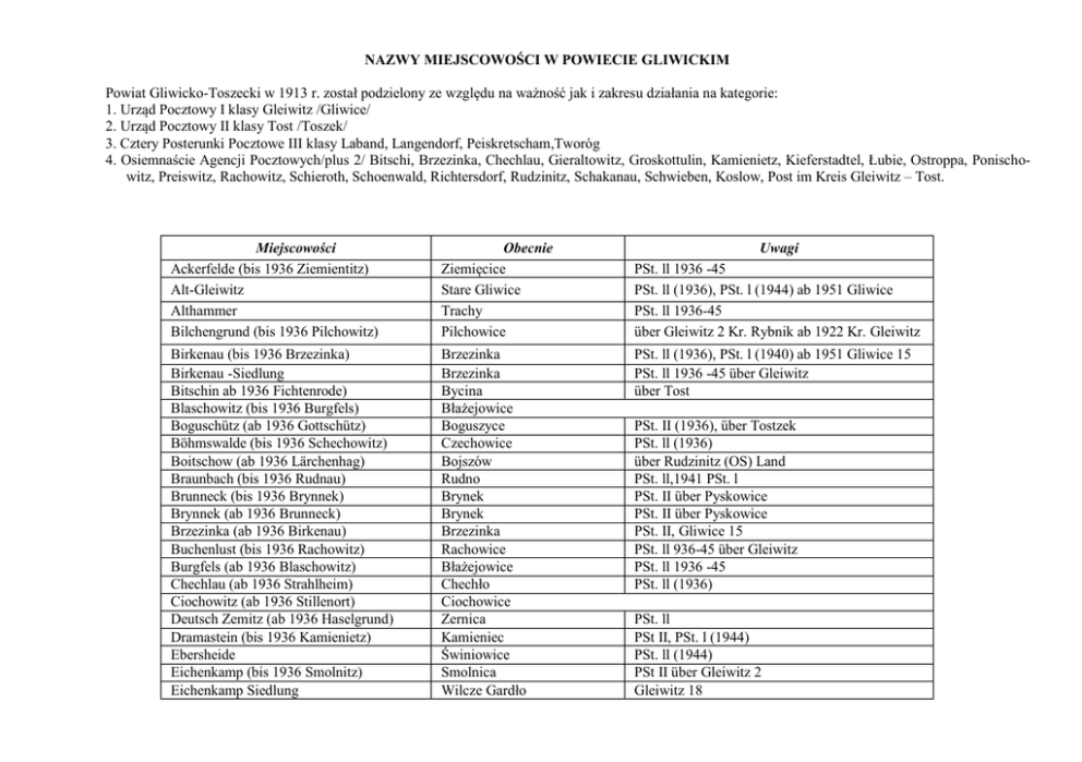 NAZWY MIEJSCOWOŚCI W POWIECIE GLIWICKIM Powiat Gliwicko-Toszecki w 1913 r. został podzielony ze względu na ważność jak i zakresu działania na kategorie: 1. Urząd Pocztowy I klasy Gleiwitz /Gliwice/ 2. Urząd Pocztowy II klasy Tost /Toszek/ 3. Cztery Posterunki Pocztowe III klasy Laband, Langendorf, Peiskretscham,Tworóg 4. Osiemnaście Agencji Pocztowych/plus 2/ Bitschi, Brzezinka, Chechlau, Gieraltowitz, Groskottulin, Kamienietz, Kieferstadtel, Łubie, Ostroppa, Ponischowitz, Preiswitz, Rachowitz, Schieroth, Schoenwald, Richtersdorf, Rudzinitz, Schakanau, Schwieben, Koslow, Post im Kreis Gleiwitz – Tost. Miejscowości Ackerfelde (bis 1936 Ziemientitz) Alt-Gleiwitz Althammer Bilchengrund (bis 1936 Pilchowitz) Obecnie Ziemięcice Stare Gliwice Trachy Pilchowice Uwagi PSt. ll 1936 -45 PSt. ll (1936), PSt. l (1944) ab 1951 Gliwice PSt. ll 1936-45 über Gleiwitz 2 Kr. Rybnik ab 1922 Kr. Gleiwitz Birkenau (bis 1936 Brzezinka) Birkenau -Siedlung Bitschin ab 1936 Fichtenrode) Blaschowitz (bis 1936 Burgfels) Boguschütz (ab 1936 Gottschütz) Böhmswalde (bis 1936 Schechowitz) Boitschow (ab 1936 Lärchenhag) Braunbach (bis 1936 Rudnau) Brunneck (bis 1936 Brynnek) Brynnek (ab 1936 Brunneck) Brzezinka (ab 1936 Birkenau) Buchenlust (bis 1936 Rachowitz) Burgfels (ab 1936 Blaschowitz) Chechlau (ab 1936 Strahlheim) Ciochowitz (ab 1936 Stillenort) Deutsch Zemitz (ab 1936 Haselgrund) Dramastein (bis 1936 Kamienietz) Ebersheide Eichenkamp (bis 1936 Smolnitz) Eichenkamp Siedlung Brzezinka Brzezinka Bycina Błażejowice Boguszyce Czechowice Bojszów Rudno Brynek Brynek Brzezinka Rachowice Błażejowice Chechło Ciochowice Zernica Kamieniec Świniowice Smolnica Wilcze Gardło PSt. ll (1936), PSt. l (1940) ab 1951 Gliwice 15 PSt. ll 1936 -45 über Gleiwitz über Tost PSt. II (1936), über Tostzek PSt. ll (1936) über Rudzinitz (OS) Land PSt. ll,1941 PSt. l PSt. II über Pyskowice PSt. II über Pyskowice PSt. II, Gliwice 15 PSt. ll 936-45 über Gleiwitz PSt. ll 1936 -45 PSt. ll (1936) PSt. ll PSt II, PSt. l (1944) PSt. ll (1944) PSt II über Gleiwitz 2 Gleiwitz 18 Einhof (bis 1936 Schwientoschowitz) Ellguth Zabrze Fichtenrode (bis 1936 Bitschin) Flößingen (bis 1936 Plawniowitz) Föhrengrund Gerolsdorf (bis 1936 Gieraltowitz) Gieraltowitz (ab 1936 Gerolsdorf) Gleiwitz Gottschütz (bis 1936 Boguschütz) Graumannsdorf (bis 1936 Schierakowitz) Groß Kottulin (ab 1936 Rodenau O.S.) Grosspatschin (ab 1936 Hartlingen) Grünwiese (bis 1936 Niewiesche) Gutenquell (bis 1936 Karchowitz) Hartlingen (bis 1936 Grosspatschin) Haselgrund (bis 1936 Deutsch Zemitz) Herzogshain (bis 1936 Xiondslas) Hohenlieben (bis 1936 Lubie) Horneck (bis 1936 Tworog) Hubenland (bis 1936 Lohnia) Hubertusgrund Jasten Kamienietz (ab 1936 Dramastein) Karchowitz (ab 1936 Gutenquell) Keßlern (bis 1936 Kotlischowitz) Kieferstädtel Kieleschka Kirschen (bis 1936 Wischnitz) Klüschau LAND (?über Rudzinitz) Koslow (ab 1936 ündenhain) Kotlischowitz (ab 1936 Keßlern) Kressengrund (bis 1936 Schalscha) Laband Langendorf Lärchenhag (bis 1936 Boitschow) Lindenhain (bis 1936 Koslow) Swiętoszowice Ligota Zabrska Bycina Pławniowice Łącza Gierałtowice Gierałtowice Gliwice Boguszyce Sierakowice Kotulin Paczyna Niewiesze Karchowice Paczyna Żernica Księży Las Łubie Tworóg Łany Wojska Jasiona Kamieniec Karchowice Kotliszowice Sośnicowice Kieleczka Wiśnicze Kleszczowice Kozłów Kotliszowice Szałsza Łabędy Wielowieś Bojszów Kozłów PSt. ll 1936-45 PSt. ll 1936 45 über Tost PSt. ll 1936 45, über Gleiwitz 2 PSt. ll 1936-45 PSt. II (1944) Gliwice 1,2,7,20,21 PSt. II über Tost PSt. ll (1936), PSt. l (1944) über Tost PSt. ll 1936-45 PSt. ll 1936-45 über Tost PSt. ll (1936), PSt. l (1941) PSt II PSt. ll 1936-45 PSt. ll (1944) PSt. ll (1944) PSt. ll PSt. ll 1936-45 über Gleiwitz 2 PSt. ll (1936) PSt. ll 1936-15 PSt.I11936-45 Klüschau PSt. I1 1936-45 ab 1964 Gliwice 9, PSt. ll (1944) PSt. ll (1936) Lohnia (ab 1936 Hubenland) Lubie9ab 1936 Hohenlieben Maiwald (bis 1936 Sacharsowitz) Mikoleska Muldenau (bis 1936 Ponischowitz) Neubersdorf (bis 1936 Nieborowitz) Nieborowitz (ab 1936 Neubersdorf) Niewiesche (ab 1936 Grünwiese) Oehringen (bis 1936 Sossnitza) Oratsche Ostroppa (ab 1936 Stroppendorf) Ostwalde (bis 1936 Pohlom) Peiskretscham Peiskretscham A Petersdorf Pilchowitz (ab 1936 Bilchengrund) Plawniowitz (ab 1936 Flößingen) Pohlom (ab 1936 Ostwalde) Ponischowitz (ab 1936 Muldenau) Preiswitz Preschlebie (ab 1936 Sandwiesen) Proboschowitz (ab 1936 Probstfeide) Probstfeide (bis 1936 Proboschowitz) Rachowitz (ab 1936 Buchenlust) Radun (ab 1936 Zwieborn) Reichenhöh Richtersdorf Rodenau O.S. (bis 1936 Groß Kottulin) Rudgershagen (bis 1936 Rudzinitz) Rudnau (ab 1936 Braunbach) Rudzinitz (ab 1936 Rudgershagen) Sacharsowitz (ab 1936 Maiwald) Sandhuben (bis 1936 Scharkow) Sandwiesen (bis 1936 Preschlebie) Sarnau Schakanau Schalscha (ab 1936 Kressengrund) Łany Łubie Zacharzowice PSt. ll 1936 -45 Poniszowice Nieborowice Nieborowice Niewiesze Sośnica PSt. ll 1936-45 über Gleiwitz 2 ab 1940 PSt. ll Ostropa Połomia Pyskowice Pyskowice Szobiszowice Pilchowice Pławniowice Połomia Poniszowice Przyszowice Przezchlebie Proboszowice Proboszowice Rachowice Radonia Płużnica Wójtowa Wieś Kotulin PSt. II, Gliwice 17 PSt. ll (1936) Rudno Rudziniec Zacharzowice Czarków Przezchlebie Sarnów Czekanów Szałsza PSt. ll Gleiwitz 3,früher Hindenburg PSt. ll (1944) Gliwice 6 über Gleiwitz 2 Kr. Rybnik ab 1922 Kr. Gleiwitz PSt. ll PAg PSt. I11936-45 PSt. II über Toszek PSt. ll 1936-45 Gliwice 12 PSt. ll (1936), PSt. l (1944) Rudziniec PSt. ll (1936) PSt. II über Pyskowice PSt. ll 1936 -45 PSt. ll (1944) PSt. ll 1936-45 Scharkow (ab 1936 Sandhuben) Schechowitz (ab 1936 Böhmswalde) Schierakowitz (ab 1936 Graumannsdorf) Schieroth (ab 1936 Schönrode) Schönrode (bis 1936 Schieroth) Schönwald Schreibersort Schrotkirch Schwieben Schwientoschowitz (ab 1936 Einhof) Smolnitz (ab 1936 Eichenkamp) Solmsdorf Sossnitza (ab 1936 Oehringen) Steineich Stille