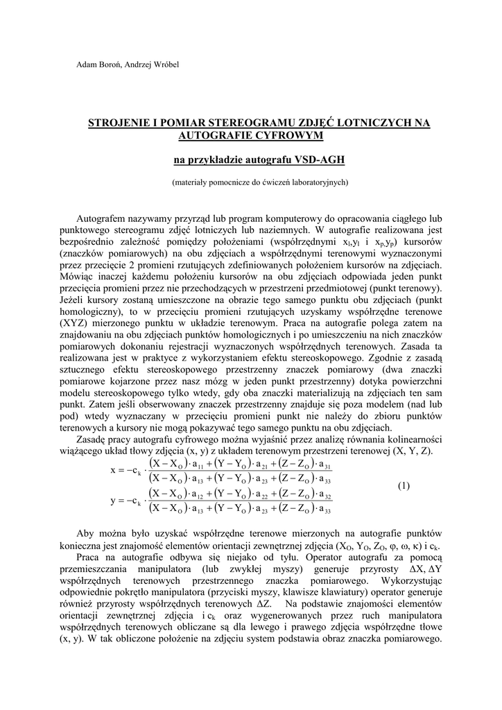Adam Boroń, Andrzej Wróbel STROJENIE I POMIAR STEREOGRAMU ZDJĘĆ LOTNICZYCH NA AUTOGRAFIE CYFROWYM na przykładzie autografu VSD-AGH (materiały pomocnicze do ćwiczeń laboratoryjnych) Autografem nazywamy przyrząd lub program komputerowy do opracowania ciągłego lub punktowego stereogramu zdjęć lotniczych lub naziemnych. W autografie realizowana jest bezpośrednio zaleŜność pomiędzy połoŜeniami (współrzędnymi xl,yl i xp,yp) kursorów (znaczków pomiarowych) na obu zdjęciach a współrzędnymi terenowymi wyznaczonymi przez przecięcie 2 promieni rzutujących zdefiniowanych połoŜeniem kursorów na zdjęciach. Mówiąc inaczej kaŜdemu połoŜeniu kursorów na obu zdjęciach odpowiada jeden punkt przecięcia promieni przez nie przechodzących w przestrzeni przedmiotowej (punkt terenowy). JeŜeli kursory zostaną umieszczone na obrazie tego samego punktu obu zdjęciach (punkt homologiczny), to w przecięciu promieni rzutujących uzyskamy współrzędne terenowe (XYZ) mierzonego punktu w układzie terenowym. Praca na autografie polega zatem na znajdowaniu na obu zdjęciach punktów homologicznych i po umieszczeniu na nich znaczków pomiarowych dokonaniu rejestracji wyznaczonych współrzędnych terenowych. Zasada ta realizowana jest w praktyce z wykorzystaniem efektu stereoskopowego. Zgodnie z zasadą sztucznego efektu stereoskopowego przestrzenny znaczek pomiarowy (dwa znaczki pomiarowe kojarzone przez nasz mózg w jeden punkt przestrzenny) dotyka powierzchni modelu stereoskopowego tylko wtedy, gdy oba znaczki materializują na zdjęciach ten sam punkt. Zatem jeśli obserwowany znaczek przestrzenny znajduje się poza modelem (nad lub pod) wtedy wyznaczany w przecięciu promieni punkt nie naleŜy do zbioru punktów terenowych a kursory nie mogą pokazywać tego samego punktu na obu zdjęciach. Zasadę pracy autografu cyfrowego moŜna wyjaśnić przez analizę równania kolinearności wiąŜącego układ tłowy zdjęcia (x, y) z układem terenowym przestrzeni terenowej (X, Y, Z). (X − X O ) ⋅ a 11 + (Y − YO ) ⋅ a 21 + (Z − Z O ) ⋅ a 31 x = −c k ⋅ (X − X O ) ⋅ a 13 + (Y − YO ) ⋅ a 23 + (Z − Z O ) ⋅ a 33 (1) (X − X O ) ⋅ a 12 + (Y − YO ) ⋅ a 22 + (Z − Z O ) ⋅ a 32 y = −c k ⋅ (X − X O ) ⋅ a 13 + (Y − YO ) ⋅ a 23 + (Z − Z O ) ⋅ a 33 Aby moŜna było uzyskać współrzędne terenowe mierzonych na autografie punktów konieczna jest znajomość elementów orientacji zewnętrznej zdjęcia (XO, YO, ZO, ϕ, ω, κ) i ck. Praca na autografie odbywa się niejako od tyłu. Operator autografu za pomocą przemieszczania manipulatora (lub zwykłej myszy) generuje przyrosty ∆X, ∆Y współrzędnych terenowych przestrzennego znaczka pomiarowego. Wykorzystując odpowiednie pokrętło manipulatora (przyciski myszy, klawisze klawiatury) operator generuje równieŜ przyrosty współrzędnych terenowych ∆Z. Na podstawie znajomości elementów orientacji zewnętrznej zdjęcia i ck oraz wygenerowanych przez ruch manipulatora współrzędnych terenowych obliczane są dla lewego i prawego zdjęcia współrzędne tłowe (x, y). W tak obliczone połoŜenie na zdjęciu system podstawia obraz znaczka pomiarowego. Równocześnie obserwator śledzi efekt w postaci połoŜenia przestrzennego kursora na stereogramie stwierdzając czy jest on pod czy nad modelem i czy „dotkną” zamierzonego celu. W zaleŜności od tego dalej zmienia trzema generatorami myszy współrzędne terenowe zbliŜając się coraz bardziej do celu, czyli osadzenia kursora na powierzchni modelu. Po osadzeniu znaczka w zamierzonym miejscu wykonywana jest rejestracja jego współrzędnych terenowych, będących szukanymi współrzędnymi terenowymi mierzonego punktu. W autografie cyfrowym VSD-AGH do omówionych wyŜej obliczeń oprócz równania kolinearności zastosowano wzory Bezpośredniej Transformacji Liniowej (DLT) realizujące zaleŜność rzutową pomiędzy płaszczyzną zdjęcia (x,y) a przestrzenią przedmiotową (X,Y,Z). x = (AX+BY+CZ+D)/(EX+FY+GZ+1) y = (HX+ IY+JZ+ K)/(EX+FY+GZ+1) (2) A…..K - 11 współczynników Wykorzystanie wzorów na transformację DLT nie zmienia zasady pracy na autografie. Jak to wyŜej omówiono, za pomocą manipulatora (myszy) generowane są przyrosty współrzędnych terenowych ∆X, ∆Y, ∆Z. Na podstawie znajomości 11 współczynników A…..K dla lewego i prawego zdjęcia obliczane jest połoŜenie (x,y) kursorów na tych zdjęciach. Równocześnie obserwator śledzi efekt w postaci połoŜenia przestrzennego kursora na stereogramie stwierdzając czy jest pod czy nad modelem i w zaleŜności od tego dalej zmienia trzema generatorami myszy współrzędne terenowe zbliŜając się coraz bardziej do celu, czyli osadzenia kursora na powierzchni modelu. Po zrealizowaniu tego celu następuje rejestracja współrzędnych terenowych znaczka (mierzonego punktu). Jak widać z równań (1) praca w trybie autogrametrycznym jest moŜliwa pod warunkiem znajomości elementów orientacji zewnętrznej zdjęć lub 11 współczynników DLT (równania 2) dla kaŜdego zdjęcia. Wyznaczenie wartości elementów orientacji zewnętrznej zdjęć lub tych współczynników jest celem etapu zwanego strojeniem modelu. Dla zdjęć wykonanych kamerami fotogrametrycznymi (dla których znamy elementy orientacji wewnętrznej) stosuje się wieloetapowy proces strojenia. Dla jego wykonania musimy znać co najmniej trzy fotopunkty o wyznaczonych współrzędnych terenowych. Dla zdjęć niemetrycznych o nieznanych elementach orientacji wewnętrznej musimy zastosować transformację DLT. Wyznaczenie współczynników równań DLT (patrz równania 2) jest moŜliwe tylko wtedy jeśli znamy współrzędne terenowe (X,Y,Z) i obrazowe (x,y) co najmniej 6 fotopunktów dla kaŜdego zdjęcia. W VSD dla obu zdjęć muszą to być te same punkty. Ilość 6 punktów wynika z tego, Ŝe liczba niewiadomych wynosi 11 a jeden punkt kontrolny dostarcza dwóch równań obserwacyjnych