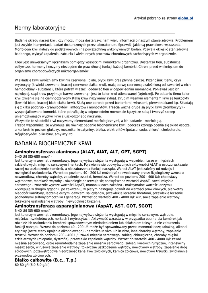 Artykuł pobrano ze strony eioba.pl Normy laboratoryjne Badanie składu naszej krwi, czy moczu mogą dostarczyć nam wielu informacji o naszym stanie zdrowia. Problemem jest zwykle interpretacja badań dostarczonych przez laboratorium. Sprawdź, jakie są prawidłowe wskazania. Morfologia krwi należy do podstawowych i najpowszechniej wykonywanych badań. Pozwala określić stan zdrowia badanego, wykryć zapalenia, zatrucia i wiele innych procesów chorobowych zachodzących w organizmie. Krew jest uniwersalnym łącznikiem pomiędzy wszystkimi komórkami organizmu. Dostarcza tlen, substancje odżywcze, hormony i enzymy niezbędne do prawidłowej funkcji każdej komórki. Chroni przed wniknięciem do organizmu chorobotwórczych mikroorganizmów. W składzie krwi wyróżniamy krwinki czerwone i białe, płytki krwi oraz płynne osocze. Przenośniki tlenu, czyli erytrocyty (krwinki czerwone, inaczej czerwone ciałka krwi), mają barwę czerwoną uzależnioną od zawartej w nich hemoglobiny - substancji, która potrafi wiązać i oddawać tlen w odpowiednim momencie. Ponieważ jest ich najwięcej, stąd krew przyjmuje barwę czerwoną - jest to kolor krwi utlenowanej (tętniczej). Po oddaniu tlenu kolor krwi zmienia się na ciemnoczerwony (taką krew nazywamy żylną). Drugim ważnym elementem krwi są leukocyty (krwinki białe, inaczej białe ciałka krwi). Służą one obronie przed bakteriami, wirusami, pierwotniakami itp. Składają się z kilku podgrup - granulocytów, limfocytów i monocytów. Trzecią ważną grupą są płytki krwi (trombocyty) wyspecjalizowane komórki, które potrafią się w odpowiednim momencie łączyć ze sobą i tworzyć skrzep uniemożliwiający wypływ krwi z uszkodzonego naczynia. Wszystkie te składniki krwi nazywamy elementami morfologicznymi, a ich badanie - morfologią. Trzeba wspomnieć, że wykonuje się również badanie biochemiczne krwi, podczas którego ocenia się skład osocza, a konkretnie poziom glukozy, mocznika, kreatyniny, białka, elektrolitów (potasu, sodu, chloru), cholesterolu, trójglicerydów, bilirubiny, amylazy itd. BADANIA BIOCHEMICZNE KRWI Aminotransferaza alaninowa (ALAT, AIAT, ALT, GPT, SGPT) 5-40 U/I (85-680 nmol/l) Jest to enzym wewnątrzkomórkowy. Jego najwyższe stężenia występują w wątrobie, niższe w mięśniach szkieletowych, mięśniu sercowym i nerkach. Pojawienie się podwyższonych aktywności ALAT w osoczu wskazuje raczej na uszkodzenie komórek, a nie zaburzenia funkcji narządu. Wzrost ALAT jest zależny od rodzaju i rozległości uszkodzenia. Wzrost do poziomu 40 - 200 U/l może być spowodowany przez: fizjologiczny wzrost u noworodków, choroby wątroby, zapalenie trzustki, hemoliza. Wzrost do poziomu 200 - 400 U/l: cholestazy wątrobowe, marskość wątroby - równolegle obserwuje się podwyższone wartości AspAT, zawał mięśnia sercowego - znacznie wyższe wartości AspAT, mononukleoza zakaźna - maksymalne wartości enzymu występują w drugim tygodniu po zakażeniu, w piątym następuje powrót do wartości prawidłowych, pierwotny niedobór karnityny, leczenie dużymi dawkami salicylanów, przewlekłe leczenie fibratami, przewlekłe leczenie pochodnymi sulfonylomocznika I generacji. Wzrost do wartości 400 - 4000 U/l: wirusowe zapalenie wątroby, toksyczne uszkodzenie wątroby, niewydolność krążenia. Aminotransferaza asparaginianowa (AspAT, AST, GOT, SGOT) 5-40 U/l (85-680 nmol/l) Jest to enzym wewnątrzkomórkowy. Jego najwyższe stężenia występują w mięśniu sercowym, wątrobie, mięśniach szkieletowych, nerkach i erytrocytach. Aktywność wzrasta w w przypadku obumarcia komórek jak również ich uszkodzeniu komórek spowodowanym niedotlenieniem lub działaniem toksyn, a nie zaburzenia funkcji narządu. Wzrost do poziomu 40 - 200 U/l może być spowodowany przez: mononukleozę zakaźną, alkohol etylowy (ostre stany upojenia alkoholowego) - hemoliza in vivo lub in vitro, inne choroby wątroby, zapalenie trzustki. Wzrost do poziomu 200 - 400 U/l: zawał mięśnia sercowego, zabiegi chirurgiczne, choroby mięśni szkieletowych (miopatie, dystrofie), przewlekłe zapalenie wątroby. Wzrost do wartości 400 - 4000 U/l: zawał mięśnia sercowego, ostre reumatoidalne zapalenie mięśnia sercowego, zabiegi kardiochirurgiczne, intensywny masaż serca, wirusowe zapalenie wątroby, toksyczne uszkodzenie wątroby, nowotwory wątroby, zapalenie dróg żółciowych, pozawątrobowa niedrożność kanalików żółciowych, kamica żółciowa, nowotwór trzustki, zwłóknienie przewodów żółciowych. Białko całkowite (B.c., T.p.) 60-80 g/l (6,0-8,0 g/dl) W tej ilości znajdują się: 55-65% albumin, 3-5% alfa1-globulin, 7-10% alfa2-globulin, 9-13% beta-globulin, 14-20% gamma-globulin. Białko stanowi ważny składnik osocza utrzymujący ciśnienie wewnątrz naczyniowe. Stanowi mieszaninę albumin, globulin, fibrynogenu, glikoprotein, lipoprotein i innych. Białka osocza ulegają stałej odnowie i degradacji. Stężenie białka we krwi zależy od jego podaży w pokarmach, od syntezy głównie w wątrobie i komórkach układu siateczkowo-śródbłonkowego oraz od stopnia utraty białek przez nerki, przewód pokarmowy, skórę i płuca. Wartości podwyższone mogą być spowodowane przez: wytwarzanie białek patologicznych (szpiczak mnogi, choroba Waldenstroma), wzmożone wytwarzanie białek fizjologicznych (marskość wątroby, kolagenozy, przewlekłe stany zapalne, skaza hiperglobulinowa), znaczne odwodnienie organizmu. Wartości obniżone mogą być spowodowane przez: niedostateczną podaż białka (wadliwe żywienie, niedożywienie, jadłowstręt, dieta ubogobiałkowa), upośledzenie wchłaniania białka z przewodu pokarmowego, nadmierna utrata białka przez przewód pokarmowy (enteropatia wysiękowa, przewlekłe stany zapalne jelit), nadmierna utrata białka przez nerki (zespół nerczycowy), nadmierna utrata białka przez skórę (oparzenia, stany zapalne skóry z wysiękiem), nadmierna utrata 