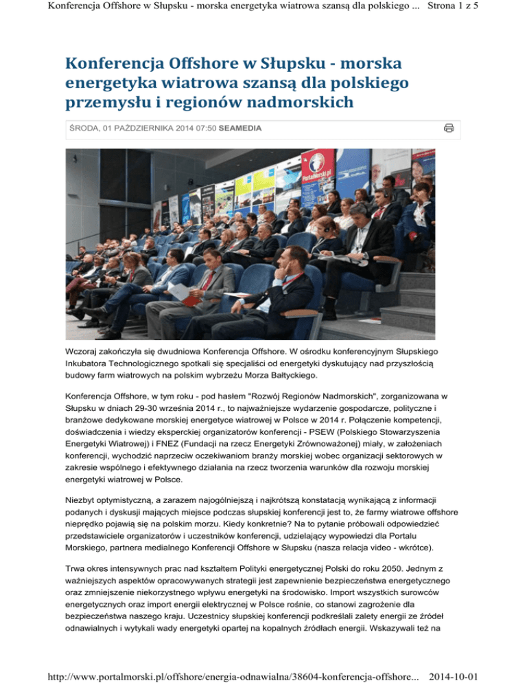 Konferencja Offshore w Słupsku - morska energetyka wiatrowa szansą dla polskiego ... Strona 1 z 5 KonferencjaOffshorewSłupsku-morska energetykawiatrowaszansądlapolskiego przemysłuiregionównadmorskich ŚRODA, 01 PAŹDZIERNIKA 2014 07:50 SEAMEDIA Wczoraj zakończyła się dwudniowa Konferencja Offshore. W ośrodku konferencyjnym Słupskiego Inkubatora Technologicznego spotkali się specjaliści od energetyki dyskutujący nad przyszłością budowy farm wiatrowych na polskim wybrzeżu Morza Bałtyckiego. Konferencja Offshore, w tym roku - pod hasłem "Rozwój Regionów Nadmorskich", zorganizowana w Słupsku w dniach 29-30 września 2014 r., to najważniejsze wydarzenie gospodarcze, polityczne i branżowe dedykowane morskiej energetyce wiatrowej w Polsce w 2014 r. Połączenie kompetencji, doświadczenia i wiedzy eksperckiej organizatorów konferencji - PSEW (Polskiego Stowarzyszenia Energetyki Wiatrowej) i FNEZ (Fundacji na rzecz Energetyki Zrównoważonej) miały, w założeniach konferencji, wychodzić naprzeciw oczekiwaniom branży morskiej wobec organizacji sektorowych w zakresie wspólnego i efektywnego działania na rzecz tworzenia warunków dla rozwoju morskiej energetyki wiatrowej w Polsce. Niezbyt optymistyczną, a zarazem najogólniejszą i najkrótszą konstatacją wynikającą z informacji podanych i dyskusji mających miejsce podczas słupskiej konferencji jest to, że farmy wiatrowe offshore nieprędko pojawią się na polskim morzu. Kiedy konkretnie? Na to pytanie próbowali odpowiedzieć przedstawiciele organizatorów i uczestników konferencji, udzielający wypowiedzi dla Portalu Morskiego, partnera medialnego Konferencji Offshore w Słupsku (nasza relacja video - wkrótce). Trwa okres intensywnych prac nad kształtem Polityki energetycznej Polski do roku 2050. Jednym z ważniejszych aspektów opracowywanych strategii jest zapewnienie bezpieczeństwa energetycznego oraz zmniejszenie niekorzystnego wpływu energetyki na środowisko. Import wszystkich surowców energetycznych oraz import energii elektrycznej w Polsce rośnie, co stanowi zagrożenie dla bezpieczeństwa naszego kraju. Uczestnicy słupskiej konferencji podkreślali zalety energii ze źródeł odnawialnych i wytykali wady energetyki opartej na kopalnych źródłach energii. Wskazywali też na http://www.portalmorski.pl/offshore/energia-odnawialna/38604-konferencja-offshore... 2014-10-01 Konferencja Offshore w Słupsku - morska energetyka wiatrowa szansą dla polskiego ... Strona 2 z 5 energetykę wiatrową, jako element bezpieczeństwa energetycznego, podając, że gospodarka Unii Europejskiej jest wysoce zależna od importu - UE importuje 53 % zużywanej energii. Łączny koszt importu surowców wynosi ponad 1 mld euro dziennie. Przeciwnicy rozwoju energetyki opartej na źródłach odnawialnych podnoszą wysoki koszt energii wyprodukowanej z wiatraków ustawionych na morzu. Zwolennicy odpowiadają, że energetyka wykorzystująca kopalne źródła energii czy jądrowa jest wspierana "ukrytymi subsydiami" i zwolnieniami podatkowymi. Jednak jeden z zagranicznych panelistów konferencji, zapytany o to, czy faktycznie 1 kWh z wiatraków, po uwzględnieniu wszelkich form pomocy publicznej dla "obu stron", jest faktycznie tańsza od 1 kWh wyprodukowanego w elektrowni węglowej czy np. opartej na generatorach napędzanych silnikami spalinowymi, nie potrafił podać konkretów i uchylił się od odpowiedzi. W kontekście rosnącego zapotrzebowania na energię i zwiększającego się uzależnienia od zewnętrznych dostaw surowców energetycznych, morska energetyka wiatrowa z jej ogromnym potencjałem (pojedyncze morskie turbiny wiatrowe są większe i efektywniejsze w porównaniu z lądowymi) oraz udokumentowanym zainteresowaniem inwestorów, może stanowić niezwykle atrakcyjną propozycję, której pominięcie w opracowywaniu Polityki energetycznej Polski do roku 2050 byłoby ogromnym błędem. Tymczasem prelegenci i paneliści słupskiej konferencji wytykali rządowi opóźnienia we wprowadzaniu rozwiązań umożliwiająch rozpoczęcie inwestycji w sektorze offshore wind w Polsce (uregulowań prawnych i programu wsparcia). Wśród planowanych docelowych odbiorców informacji technicznych, tez i postulatów formułowanych na Konferencji Offshore byli rząd i parlament oraz władze samorządowe. Jednak, jak to często bywa na podobnych konferencjach w Polsce, wielu przedstawicieli władz nie przyjęło zaproszeń i nie pojawiło się na konferencji, a większość z tych, którzy byli na niej obecni, po pokazaniu się na jej początku uciekali "do ważniejszych zadań", odbierając sobie możliwość poznania faktów dotyczących morskiej energetyki wiatrowej pozwalających im na podejmowanie racjonalnych, korzystnych dla kraju czy regionu decyzji wpływających na gospodarkę w oparciu o realną wiedzę. Sporo miejsca poświęcono w programie konferencji, a także w dyskusjach podczas paneli nie poświęconych bezpośrednio temu tematowi, morskiej energetyce wiatrowej jako szansie dla polskich regionów nadmorskich. Szacuje się, że około 16% nakładów inwestycyjnych na budowę morskich farm wiatrowych (MFW) może trafić bezpośrednio lub pośrednio do portów, stoczni i armatorów, przy czym 1-3% kosztów inwestycyjnych może trafić do portów obsługujących budowę MFW. Ponadto, przy założeniu instalacji MFW o mocy 6 GW do roku 2030 przewiduje się utworzenie około 30 tys. nowych miejsc pracy. Prelegenci i paneliści zgodnie podkreślali, że branża morskiej energetyki wiatrowej stanowi ogromny potencjał dla rozwoju regionów nadmorskich, jednak zastanawiali się - w jaki sposób efektywnie można go wykorzystać, szczególnie wobec faktu, iż dotychczas rząd i władze regionalne nie zawsze podejmują decyzje korzystne dla przyszłego rozwoju morskiej energetyki wiatrowej lub odsuwają w czasie decyzje, które już dawno powinny zapaść. Jednym z tematów konferencji odbywającej się w Słupskim In