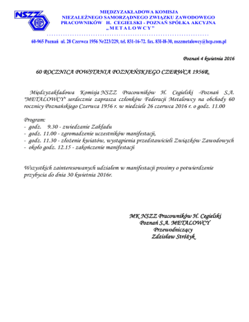 MIĘDZYZAKŁADOWA KOMISJA NIEZALEŻNEGO SAMORZĄDNEGO ZWIĄZKU ZAWODOWEGO PRACOWNIKÓW H. CEGIELSKI - POZNAŃ SPÓŁKA AKCYJNA „METALOWCY” ...................................................................... 60-965 Poznań ul. 28 Czerwca 1956 Nr223/229, tel. 831-16-72. fax. 83I-l8-30, [email protected] Poznań 4 kwietnia 2016 60 ROCZNICA POWSTANIA POZNAŃSKIEGO CZERWCA 1956R. Międzyzakładowa Komisja NSZZ Pracowników H. Cegielski -Poznań S.A. "METALOWCY" serdecznie zaprasza członków Federacji Metalowcy na obchody 60 rocznicy Poznańskiego Czerwca 1956 r. w niedziele 26 czerwca 2016 r. o godz. 11.00 Program: - godz. 9.30 - zwiedzanie Zakładu - godz. 11.00 - zgromadzenie uczestników manifestacji, - godz. 11.30 - złożenie kwiatów, wystąpienia przedstawicieli Związków Zawodowych - około godz. 12.15 - zakończenie manifestacji Wszystkich zainteresowanych udziałem w manifestacji prosimy o potwierdzenie przybycia do dnia 30 kwietnia 2016r. MK NSZZ Pracowników Pracowników H. Cegielski Poznań S.A. METALOWCY Przewodniczący Zdzisław Stróżyk