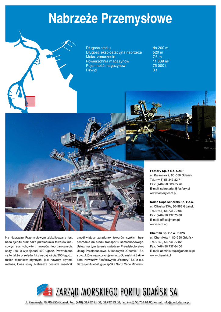 Nabrzeże Przemysłowe Długość statku Długość eksploatacyjna nabrzeża Maks. zanurzenie Powierzchnia magazynów Pojemność magazynów Dźwigi do 200 m 520 m 7,6 m 11 839 m2 75 000 t 3t Fosfory Sp. z o.o. GZNF ul. Kujawska 2, 80-550 Gdańsk Tel.: (+48) 58 343 82 71 Fax: (+48) 58 303 85 76 E-mail: [email protected] www.fosfory.com.pl North Cape Minerals Sp. z o.o. ul. Oliwska 33A, 80-563 Gdańsk Tel.: (+48) 58 737 79 98 Fax: (+48) 58 737 75 08 E-mail: [email protected] www.ncm.no Na Nabrzeżu Przemysłowym zlokalizowana jest baza sjenitu oraz baza przeładunku towarów masowych suchych, w tym nawozów nieorganicznych, sody i soli o wydajności 400 t/godz. Prowadzone są tu także przeładunki z wydajnością 300 t/godz. takich ładunków płynnych, jak: nawozy płynne, melasa, kwas solny. Nabrzeże posiada zasobnik umożliwiający załadunek towarów sypkich bezpośrednio na środki transportu samochodowego. Usługi na tym terenie świadczy Przedsiębiorstwo Usług Przeładunkowo-Składowych „Chemiki” Sp. z o.o., które współpracuje m.in. z Gdańskimi Zakładami Nawozów Fosforowych „Fosfory” Sp. z o.o. Bazę sjenitu obsługuje spółka North Cape Minerals. Chemiki Sp. z o.o. PUPS ul. Chemików 4, 80-550 Gdańsk Tel.: (+48) 58 737 72 82 Fax: (+48) 58 737 64 00 E-mail: [email protected] www.chemiki.pl ul. Zamknięta 18, 80-955 Gdańsk, tel.: (+48) 58 737 91 00, 58 737 93 00, fax: (+48) 58 737 94 85, e-mail: [email protected]