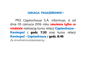 UWAGA PASAŻEROWIE ! PKS Częstochowa S.A. informuje, iż od dnia 05 czerwca 2016 roku zawiesza tylko w niedziele realizację kursu relacji Częstochowa Koniecpol z godz. 7:20 oraz kursu relacji Koniecpol - Częstochowa z godz. 8:45 Za utrudnienia przepraszamy…