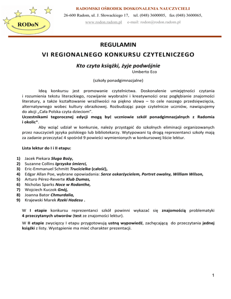 RADOMSKI OŚRODEK DOSKONALENIA NAUCZYCIELI 26-600 Radom, ul. J. Słowackiego 17, www.rodon.radom.pl tel. (048) 3600005, fax (048) 3600065, e-mail: [email protected] REGULAMIN VI REGIONALNEGO KONKURSU CZYTELNICZEGO Kto czyta książki, żyje podwójnie Umberto Eco (szkoły ponadgimnazjalne) Ideą konkursu jest promowanie czytelnictwa. Doskonalenie umiejętności czytania i rozumienia tekstu literackiego, rozwijanie wyobraźni i kreatywności oraz pogłębianie znajomości literatury, a także kształtowanie wrażliwości na piękno słowa – to cele naszego przedsięwzięcia, alternatywnego wobec kultury obrazkowej. Rozbudzając pasje czytelnicze uczniów, nawiązujemy do akcji „Cała Polska czyta dzieciom”. Uczestnikami tegorocznej edycji mogą być uczniowie szkół ponadgimnazjalnych z Radomia i okolic*. Aby wziąć udział w konkursie, należy przystąpić do szkolnych eliminacji organizowanych przez nauczycieli języka polskiego lub bibliotekarzy. Wytypowani tą drogą reprezentanci szkoły mają za zadanie przeczytać 4 spośród 9 powieści wymienionych w konkursowej liście lektur. Lista lektur do I i II etapu: 1) 2) 3) 4) 5) 6) 7) 8) 9) Jacek Piekara Sługa Boży, Suzanne Collins Igrzyska śmierci, Eric-Emmanuel Schmitt Trucicielka (całość), Edgar Allan Poe, wybrane opowiadania: Serce oskarżycielem, Portret owalny, William Wilson, Arturo Pérez-Reverte Klub Dumas, Nicholas Sparks Noce w Rodanthe, Wojciech Kuczok Gnój, Joanna Bator Chmurdalia, Krajewski Marek Rzeki Hadesu . W I etapie konkursu reprezentanci szkół powinni wykazać się znajomością problematyki 4 przeczytanych utworów (test ze znajomości lektur). W II etapie zwycięzcy I etapu przygotowują ustną wypowiedź, zachęcającą do przeczytania jednej książki z listy. Wystąpienie ma mieć charakter prezentacji. 1 RADOMSKI OŚRODEK DOSKONALENIA NAUCZYCIELI 26-600 Radom, ul. J. Słowackiego 17, www.rodon.radom.pl tel. (048) 3600005, fax (048) 3600065, e-mail: [email protected] Terminarz działań konkursowych: 1. Eliminacje szkolne do dnia 25.01.2013 r. Zgłoszenia zawierające nazwę szkoły, nazwiska uczestników z podaną listą 4 lektur, nazwiska opiekunów należy nadesłać lub dostarczyć osobiście do 12.02.2013r. na adres RODoN-u. 2. Etap I – 04.03.2013 r. (poniedziałek) godz.15.00 w V LO przy ul. Romualda Traugutta 52a w Radomiu (test sprawdzający znajomość wybranych utworów). 3. Etap II – 08.04.2013 r. (poniedziałek) godz.13.00 w Miejskiej Bibliotece Publicznej przy ul.Piłsudskiego 12 (prezentacje ustne). Godzina zostanie podana w późniejszym terminie. Czas wypowiedzi 5-7 min. Kryteria oceny prezentacji: · treść wystąpienia - 7 pkt. · kompozycja – 3 pkt. · język – 10 pkt. · pomysł – 5 pkt. · wyraz artystyczny - 5 pkt. O kolejności miejsc finałowych decyduje suma punktów uzyskanych w obu etapach konkursu. Finaliści konkursu otrzymają dyplomy oraz nagrody rzeczowe ufundowane przez organizatorów i partnerów konkursu. Organizator: Radomski Ośrodek Doskonalenia Nauczycieli Partner: Oddział Radomski Stowarzyszenia Nauczycieli Polonistów Koordynatorzy projektu: Aleksandra Nobis, Elżbieta Zawodnik, Monika Kamińska * Uczestnicy konkursu spoza Radomia zobowiązani są do uiszczenia opłaty 2 zł. Uczestnik zawodów lub jego prawny opiekun wyraża w macierzystej szkole zgodę na przetwarzanie i publikowanie przez RODoN danych osobowych, uzyskanych wyników, wizerunku na stronie internetowej RODoN-u podczas trwania całej edycji zawodów. 2