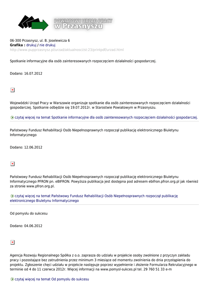 06-300 Przasnysz, ul. B. Joselewicza 6 Grafika : drukuj / nie drukuj http://www.pupprzasnysz.pl/urzad/aktualnosci/st:23/printpdf/urzad.html Spotkanie informacyjne dla osób zainteresowanych rozpoczęciem działalności gospodarczej. Dodano: 16.07.2012 Wojewódzki Urząd Pracy w Warszawie organizuje spotkanie dla osób zainteresowanych rozpoczęciem działalności gospodarczej. Spotkanie odbędzie się 19.07.2012r. w Starostwie Powiatowym w Przasnyszu. czytaj więcej na temat Spotkanie informacyjne dla osób zainteresowanych rozpoczęciem działalności gospodarczej. Państwowy Fundusz Rehabilitacji Osób Niepełnosprawnych rozpoczął publikację elektronicznego Biuletynu Informatycznego Dodano: 12.06.2012 Państwowy Fundusz Rehabilitacji Osób Niepełnosprawnych rozpoczął publikację elektronicznego Biuletynu Informatycznego PFRON pn. eBIFRON. Powyższa publikacja jest dostępna pod adresem ebifron.pfron.org.pl jak również za stronie www.pfron.org.pl. czytaj więcej na temat Państwowy Fundusz Rehabilitacji Osób Niepełnosprawnych rozpoczął publikację elektronicznego Biuletynu Informatycznego Od pomysłu do sukcesu Dodano: 04.06.2012 Agencja Rozwoju Regionalnego Spółka z o.o. zaprasza do udziału w projekcie osoby zwolnione z przyczyn zakładu pracy i pozostające bez zatrudnienia przez minimum 3 miesiące od momentu zwolnienia do dnia przystąpienia do projektu. Zgłoszenie chęci udziału w projekcie następuje poprzez wypełnienie i złożenie Formularza Rekrutacyjnego w terminie od 4 do 11 czerwca 2012r. Więcej informacji na www.pomysl-sukces.pl tel. 29 760 51 33 e-m czytaj więcej na temat Od pomysłu do sukcesu NABÓR WNIOSKÓW DOTYCZĄCYCH ORGANIZACJI STAŻY Dodano: 15.05.2012 OGŁOSZENIE Powiatowy Urząd Pracy w Przasnyszu w związku z realizacją projektu współfinansowanego z Europejskiego Funduszu Społecznego w ramach Poddziałania 6.1.3 pn. ,,Aktywizacja bezrobotnych kluczem do zatrudnienia’’ organizuje staż dla osób bezrobotnych. Pracodawca po ukończonym stażu ma obowiązek zatrudnić każdego skierowanego na staż bezrobotnego. Wnioski można składać w PUP w Przasnyszu ul. B. Joselewicza 6 o czytaj więcej na temat NABÓR WNIOSKÓW DOTYCZĄCYCH ORGANIZACJI STAŻY NABÓR WNIOSKÓW O PRZYZNANIE JEDNORAZOWYCH ŚRODKÓW NA PODJECIE DZIAŁALNOŚCI GOSPODARCZEJ Dodano: 15.05.2012 O G Ł O S Z E N I E PUP w Przasnyszu realizuje projekt współfinansowany z Europejskiego Funduszu Społecznego w ramach Poddziałania 6.1.3. pn. „Aktywizacja bezrobotnych kluczem do zatrudnienia”. W ramach projektu m.in. udzielane są jednorazowo środki na rozpoczęcie działalności gospodarczej. Osoby bezrobotne chcące uzyskać jednorazowe środki na rozpoczęcie działalności gospodarczej mogą składać wnioski w terminie od 1 czytaj więcej na temat NABÓR WNIOSKÓW O PRZYZNANIE JEDNORAZOWYCH ŚRODKÓW NA PODJECIE DZIAŁALNOŚCI GOSPODARCZEJ Ogłoszenie o środkach PFRON na rehabilitację osób niepełnosprawnych zarejestrowanych jako osoby bezrobotne lub poszukujące pracy Dodano: 09.05.2012 OGŁOSZENIE Powiatowy Urząd Pracy w Przasnyszu informuje, że posiada środki PFRON na rehabilitację osób niepełnosprawnych zarejestrowanych jako osoby bezrobotne lub poszukujące pracy niepozostające w zatrudnieniu. Środki można uzyskać na: Rozpoczęcie działalności gospodarczej. Wyposażenie stanowiska pracy. Szkolenie. Staż. Bliższych informacji dotyczących: pozycji 1 i 2 można uzyskać w pok. 4 tel. 0 29 756 47 37, czytaj więcej na temat Ogłoszenie o środkach PFRON na rehabilitację osób niepełnosprawnych zarejestrowanych jako osoby bezrobotne lub poszukujące pracy ogłoszenie Dodano: 17.04.2012 Powiatowy Urząd Pracy w Przasnyszu informuje,że został zakończony nabór wniosków w ramach wyposażenia lub doposażenia stanowiska pracy . czytaj więcej na temat ogłoszenie Spotkanie dla osób bezrobotnych z wyższym wykształceniem. Dodano: 28.03.2012 OGŁOSZENIE Powiatowy Urząd Pracy w Przasnyszu informuje, że w dniu 23 kwienia 2012 roku o godz. 10-tej w Starostwie Powiatowym w Przasnyszu (sala konferencyjna I piętro) odbędzie się spotkanie dla osób bezrobotnych posiadających wykształcenie wyższe. czytaj więcej na temat Spotkanie dla osób bezrobotnych z wyższym wykształceniem. Przejdź do strony 18 Przejdź do strony 19 Przejdź do strony 20 Przejdź do strony 21 Przejdź do strony 22 Jesteś na stronie 23 Przejdź do strony 24 Przejdź do strony 25 Przejdź do strony 26 Przejdź do strony 27 Przejdź do strony 28