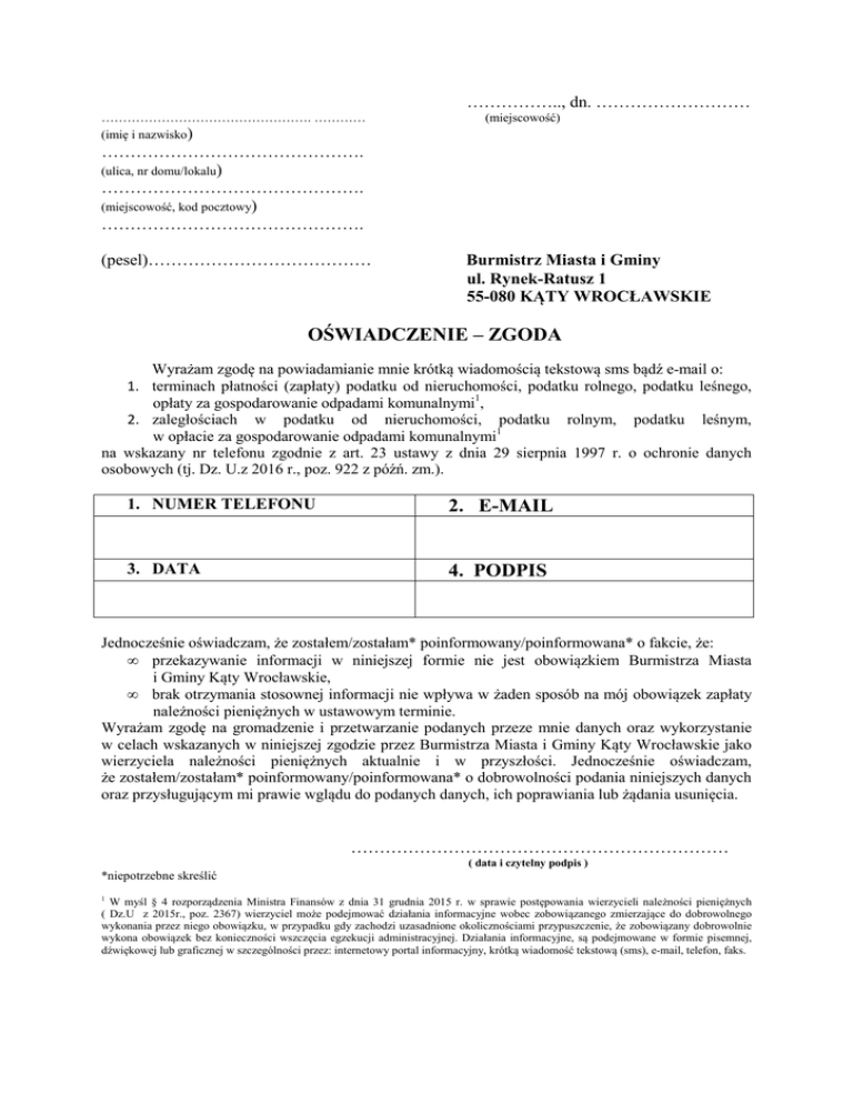 …………….., dn. ……………………… …………………………………………. ………… (imię i nazwisko) (miejscowość) ………………………………………. (ulica, nr domu/lokalu) ………………………………………. (miejscowość, kod pocztowy) ………………………………………. (pesel)………………………………… Burmistrz Miasta i Gminy ul. Rynek-Ratusz 1 55-080 KĄTY WROCŁAWSKIE OŚWIADCZENIE – ZGODA Wyrażam zgodę na powiadamianie mnie krótką wiadomością tekstową sms bądź e-mail o: 1. terminach płatności (zapłaty) podatku od nieruchomości, podatku rolnego, podatku leśnego, opłaty za gospodarowanie odpadami komunalnymi1, 2. zaległościach w podatku od nieruchomości, podatku rolnym, podatku leśnym, w opłacie za gospodarowanie odpadami komunalnymi1 na wskazany nr telefonu zgodnie z art. 23 ustawy z dnia 29 sierpnia 1997 r. o ochronie danych osobowych (tj. Dz. U.z 2016 r., poz. 922 z późń. zm.). 1. NUMER TELEFONU 2. E-MAIL 3. DATA 4. PODPIS Jednocześnie oświadczam, że zostałem/zostałam* poinformowany/poinformowana* o fakcie, że: • przekazywanie informacji w niniejszej formie nie jest obowiązkiem Burmistrza Miasta i Gminy Kąty Wrocławskie, • brak otrzymania stosownej informacji nie wpływa w żaden sposób na mój obowiązek zapłaty należności pieniężnych w ustawowym terminie. Wyrażam zgodę na gromadzenie i przetwarzanie podanych przeze mnie danych oraz wykorzystanie w celach wskazanych w niniejszej zgodzie przez Burmistrza Miasta i Gminy Kąty Wrocławskie jako wierzyciela należności pieniężnych aktualnie i w przyszłości. Jednocześnie oświadczam, że zostałem/zostałam* poinformowany/poinformowana* o dobrowolności podania niniejszych danych oraz przysługującym mi prawie wglądu do podanych danych, ich poprawiania lub żądania usunięcia. ………………………………………………………… ( data i czytelny podpis ) *niepotrzebne skreślić 1 W myśl § 4 rozporządzenia Ministra Finansów z dnia 31 grudnia 2015 r. w sprawie postępowania wierzycieli należności pieniężnych ( Dz.U z 2015r., poz. 2367) wierzyciel może podejmować działania informacyjne wobec zobowiązanego zmierzające do dobrowolnego wykonania przez niego obowiązku, w przypadku gdy zachodzi uzasadnione okolicznościami przypuszczenie, że zobowiązany dobrowolnie wykona obowiązek bez konieczności wszczęcia egzekucji administracyjnej. Działania informacyjne, są podejmowane w formie pisemnej, dźwiękowej lub graficznej w szczególności przez: internetowy portal informacyjny, krótką wiadomość tekstową (sms), e-mail, telefon, faks.