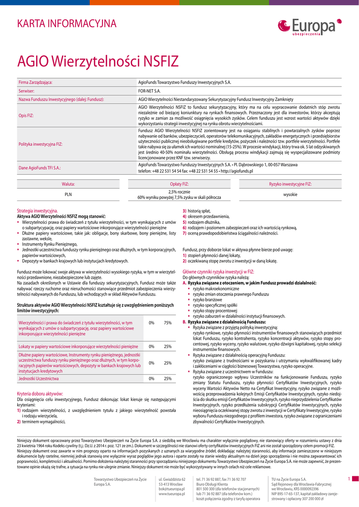 KARTA INFORMACYJNA AGIO Wierzytelności NSFIZ Firma Zarządzająca: AgioFunds Towarzystwo Funduszy Inwestycyjnych S.A. Serwiser: FOR-NET S.A. Nazwa Funduszu Inwestycyjnego (dalej: Fundusz): AGIO Wierzytelności Niestandaryzowany Sekurytyzacyjny Fundusz Inwestycyjny Zamknięty AGIO Wierzytelności NSFIZ to fundusz sekurytyzacyjny, który ma na celu wypracowanie dodatnich stóp zwrotu niezależnie od bieżącej koniunktury na rynkach finansowych. Przeznaczony jest dla inwestorów, którzy akceptują ryzyko w zamian za możliwość osiągnięcia wysokich zysków. Celem funduszu jest wzrost wartości aktywów dzięki wykorzystaniu strategii inwestycyjnej na rynku obrotu wierzytelnościami. Fundusz AGIO Wierzytelności NSFIZ zorientowany jest na osiąganiu stabilnych i powtarzalnych zysków poprzez nabywanie od banków, ubezpieczycieli, operatorów telekomunikacyjnych, zakładów energetycznych i przedsiębiorstw użyteczności publicznej nieobsługiwane portfele kredytów, pożyczek i należności tzw. portfele wierzytelności. Portfele takie nabywa się za ułamek ich wartości nominalnej (15-25%). W procesie windykacji, który trwa ok. 5 lat odzyskiwanych jest średnio 40-50% nominału wierzytelności. Obsługą procesu windykacji zajmują się wyspecjalizowane podmioty licencjonowane przez KNF tzw. serwiserzy. AgioFunds Towarzystwo Funduszy Inwestycyjnych S.A. • Pl. Dąbrowskiego 1, 00-057 Warszawa telefon: +48 22 531 54 54 fax: +48 22 531 54 55 • http://agiofunds.pl Opis FIZ: Polityka inwestycyjna FIZ: Dane AgioFunds TFI S.A.: Waluta: Opłaty FIZ: Ryzyko inwestycyjne FIZ: PLN 2,5% rocznie 60% wyniku powyżej 7,5% zysku w skali półrocza wysokie Strategia inwestycyjna. Aktywa AGIO Wierzytelności NSFIZ mogą stanowić: Wierzytelności prawa do świadczeń z tytułu wierzytelności, w tym wynikających z umów o subpartycypację, oraz papiery wartościowe inkorporujące wierzytelności pieniężne Dłużne papiery wartościowe, takie jak: obligacje, bony skarbowe, bony pieniężne, listy zastawne, weksle, Instrumenty Rynku Pieniężnego, Jednostki uczestnictwa funduszy rynku pieniężnego oraz dłużnych, w tym korporacyjnych, papierów wartościowych, Depozyty w bankach krajowych lub instytucjach kredytowych. Fundusz może lokować swoje aktywa w wierzytelności wysokiego ryzyka, w tym w wierzytelności przedawnione, niezabezpieczone lub zajęte. Na zasadach określonych w Ustawie dla funduszy sekurytyzacyjnych, Fundusz może także nabywać rzeczy ruchome oraz nieruchomości stanowiące przedmiot zabezpieczenia wierzytelności nabywanych do Funduszu, lub wchodzących w skład Aktywów Funduszu. Struktura aktywów AGIO Wierzytelności NSFIZ kształtuje się z uwzględnieniem poniższych limitów inwestycyjnych: Wierzytelności i prawa do świadczeń z tytułu wierzytelności, w tym wynikających z umów o subpartycypację, oraz papiery wartościowe inkorporujące wierzytelności pieniężne 0% 75% Lokaty w papiery wartościowe inkorporujące wierzytelności pieniężne 0% 25% Dłużne papiery wartościowe, Instrumenty rynku pieniężnego, jednostki uczestnictwa funduszy rynku pieniężnego oraz dłużnych, w tym korporacyjnych papierów wartościowych, depozyty w bankach krajowych lub instytucjach kredytowych 0% 25% Jednostki Uczestnictwa 0% 25% Kryteria doboru aktywów: Dla osiągnięcia celu inwestycyjnego, Fundusz dokonując lokat kieruje się następującymi kryteriami: 1) rodzajem wierzytelności, z uwzględnieniem tytułu z jakiego wierzytelność powstała i rodzaju wierzyciela, 2) terminem wymagalności, 3) historią spłat, 4) okresem przedawnienia, 5) rodzajem dłużnika, 6) rodzajem i poziomem zabezpieczeń oraz ich wartością rynkową, 7) oceną prawdopodobieństwa ściągalności należności. Fundusz, przy doborze lokat w aktywa płynne bierze pod uwagę: 1) stopień płynności danej lokaty, 2) oczekiwaną stopę zwrotu z inwestycji w daną lokatę. Główne czynniki ryzyka inwestycji w FIZ: Do głównych czynników ryzyka należą: A. Ryzyka związane z otoczeniem, w jakim Fundusz prowadzi działalność: ryzyko makroekonomiczne ryzyko zmian otoczenia prawnego Funduszu ryzyko branżowe ryzyko specyficznej spółki ryzyko stopy procentowej ryzyko zaburzeń w działalności instytucji finansowych. B. Ryzyka związane z działalnością Funduszu: Ryzyka związane z przyjętą polityką inwestycyjną: ryzyko rynkowe, ryzyko płynności instrumentów finansowych stanowiących przedmiot lokat Funduszu, ryzyko kontrahenta, ryzyko koncentracji aktywów, ryzyko stopy procentowej, ryzyko wyceny, ryzyko walutowe, ryzyko dźwigni kapitałowej, ryzyko selekcji instrumentów finansowych. Ryzyka związane z działalnością operacyjną Funduszu: ryzyko związane z trudnościami w pozyskaniu i utrzymaniu wykwalifikowanej kadry i zakłóceniami w ciągłości biznesowej Towarzystwa, ryzyko operacyjne. Ryzyka związane z uczestnictwem w Funduszu: ryzyko ograniczonego wpływu Uczestników na funkcjonowanie Funduszu, ryzyko zmiany Statutu Funduszu, ryzyko płynności Certyfikatów Inwestycyjnych, ryzyko wyceny Wartości Aktywów Netto na Certyfikat Inwestycyjny, ryzyko związane z możliwością przeprowadzenia kolejnych Emisji Certyfikatów Inwestycyjnych, ryzyko niedojścia do skutku emisji Certyfikatów Inwestycyjnych, ryzyko nieprzydzielenia Certyfikatów Inwestycyjnych, ryzyko przedłużenia subskrypcji Certyfikatów Inwestycyjnych, ryzyko nieosiągnięcia oczekiwanej stopy zwrotu z inwestycji w Certyfikaty Inwestycyjne, ryzyko wyboru Funduszu niezgodnego z profilem inwestora, ryzyko związane z ograniczeniami zbywalności Certyfikatów Inwestycyjnych. Niniejszy dokument opracowany przez Towarzystwo Ubezpieczeń na Życie Europa S.A. z siedzibą we Wrocławiu ma charakter wyłącznie poglądowy, nie stanowiący oferty w rozumieniu ustawy z dnia 23 kwietnia 1964 roku Kodeks cywilny (t.j.: Dz.U. z 2014 r. poz. 121 ze zm.). Dokument w szczególności nie stanowi oferty certyfikatów i