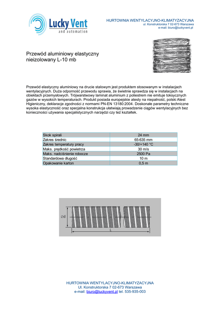 HURTOWNIA WENTYLACYJNO-KLIMATYZACYJNA ul. Konstruktorska 7 02-673 Warszawa e-mail: [email protected] Przewód aluminiowy elastyczny nieizolowany L-10 mb Przewód elastyczny aluminiowy na drucie stalowym jest produktem stosowanym w instalacjach wentylacyjnych. Duża odporność przewodu sprawia, że świetnie sprawdza się w instalacjach na obiektach przemysłowych. Trójwarstwowy laminat aluminium z poliestrem nie emituje toksycznych gazów w wysokich temperaturach. Produkt posiada europejskie atesty na niepalność, polski Atest Higieniczny, deklaracje zgodności z normami PN-EN 13180:2004. Doskonałe parametry techniczne wysoka elastyczność oraz specjalna konstrukcja ułatwiają prowadzenie ciągów wentylacyjnych bez konieczności używania specjalistycznych narzędzi czy też kształtek. Skok spirali Zakres średnic Zakres temperatury pracy Maks. prędkość powietrza Maks. nadciśnienie robocze Standardowa długość Opakowanie karton 24 mm 65-635 mm -30/+140 °C 30 m/s 2500 Pa 10 m 0,5 m HURTOWNIA WENTYLACYJNO-KLIMATYZACYJNA Ul. Konstruktorska 7 02-673 Warszawa e-mail: [email protected] tel. 535-935-003