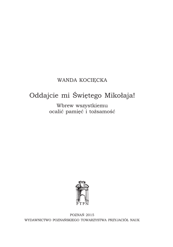 WANDA KOCIĘCKA Oddajcie mi Świętego Mikołaja! Wbrew wszystkiemu ocalić pamięć i tożsamość POZNAŃ 2015 WYDAWNICTWO POZNAŃSKIEGO TOWARZYSTWA PRZYJACIÓŁ NAUK Spis treści Nota redakcyjna......................................................... 7 Kresy – ziemie wspomnieniami znaczone (Barbara Kubis)...................................................... 9 Oddajcie mi Świętego Mikołaja!.................................. 37 [Część] 1................................................................ 39 [Część] 2................................................................ 82 [Część] 3................................................................ 125 Gorycz spotkania........................................................ 167 Listy do Tadeusza Konwickiego.................................. 179 Od Autorki................................................................. 190