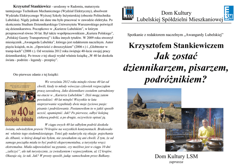 Krzysztof Stankiewicz - urodzony w Radomiu, maturzysta tamtejszego Technikum Mechanicznego (Wydział Elektryczny), absolwent Wydziału Elektrycznego Wyższej Szkoły Inżynierskiej (obecnie Politechnika Lubelska). Nigdy jednak nie dane mu było pracować w zawodzie elektryka. Po skończeniu Studium Dziennikarskiego Uniwersytetu Warszawskiego poświęcił się dziennikarstwu. Początkowo w „Kurierze Lubelskim”, w którym przepracował równo 30 lat. Był także współpracownikiem „Kuriera Polskiego”, „Polskiej Gazety Transportowej” i kilku innych tytułów. W 2009 roku stworzył miesięcznik „Awangarda Lubelska”, którego jest redaktorem naczelnym. Autor pięciu książek, m.in. „Opowieści z dreszczykiem” (2006 r.) i „Globtroter w tramp-kach” (2008 r.). Od września 2012 roku świętuje 40-lecie swojej pracy dziennikarskiej. Po trosze z tej okazji wydał właśnie książkę „W 40 lat dookoła świata - podróże - legendy - przepisy”. Oto pierwsze zdanie z tej książki: We wrześniu 2012 roku minęło równo 40 lat od chwili, kiedy to młody wówczas człowiek rozpocząłem pracę zawodową. Jako dziennikarz zostałem zatrudniony na etacie w „Kurierze Lubelskim”. Dziś mogę zatem powiedzieć: 40 lat minęło! Wszystkie te lata nieprzerwanie wypełniały dwie moje życiowe pasje: pisanie i podróżowanie. Postanowiłem to w jakiś sposób uczcić, upamiętnić. Jak? Po pierwsze, odbyć kolejną ciekawą podróż, a po drugie, oczywiście opisać ją. W ciągu owych 40 lat odbyłem podróż dookoła świata, odwiedziłem prawie 70 krajów na wszystkich kontynentach. Brakowało mi właśnie tego siedemdziesiątego. Toteż gdy nadarzyła się okazja pojechania do Albanii, w której dotąd nie byłem, nie zawahałem się ani chwili. Z tym, że od samego początku miała to być podróż eksperymentalna, a turystyka wręcz ekstremalna. Miała odpowiedzieć na pytanie, czy możliwe jest w ciągu 10 dni „zaliczyć”, ale tak turystycznie, ze zwiedzeniem i wypoczynkiem, aż 12 krajów. Okazuje się, że tak. Jak? W prosty sposób, jadąc samochodem przez Bałkany. Dom Kultury Lubelskiej Spółdzielni Mieszkaniowej Spotkanie z redaktorem naczelnym „Awangardy Lubelskiej” Krzysztofem Stankiewiczem Jak zostać dziennikarzem, pisarzem, podróżnikiem? Dom Kultury LSM zaprasza Najczęściej młodzi ludzie, ale przecież nie tylko oni, bo pasje nachodzą człowieka w każdym wieku, wszyscy marzymy o dalekich podróżach. Wielu z nas cechuje dociekliwość i bawi słowo pisane, chciałoby zostać dziennikarzem. Niektórzy piszą wiersze albo też myślą o napisaniu pierwszej w życiu książki. Jak to zrobić? To właśnie będzie tematem tego spotkania. Zapraszamy. Dom Kultury Lubelskiej Spółdzielni Mieszkaniowej serdecznie zaprasza na spotkanie z redaktorem naczelnym „Awangardy Lubelskiej” Krzysztofem Stankiewiczem Jak zostać dziennikarzem, pisarzem, podróżnikiem? Spotkanie odbędzie się we wtorek 14 maja 2013 r. o godz. 18.00 w Galerii Sztuki Domu Kultury LSM w Lublinie, ul. K. Wallenroda 4a, tel. 81 743 48 29 www.domkulturylsm.pl Wstęp wolny