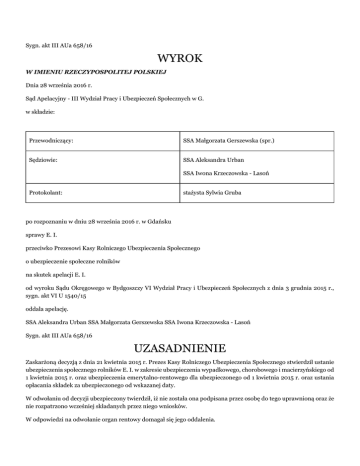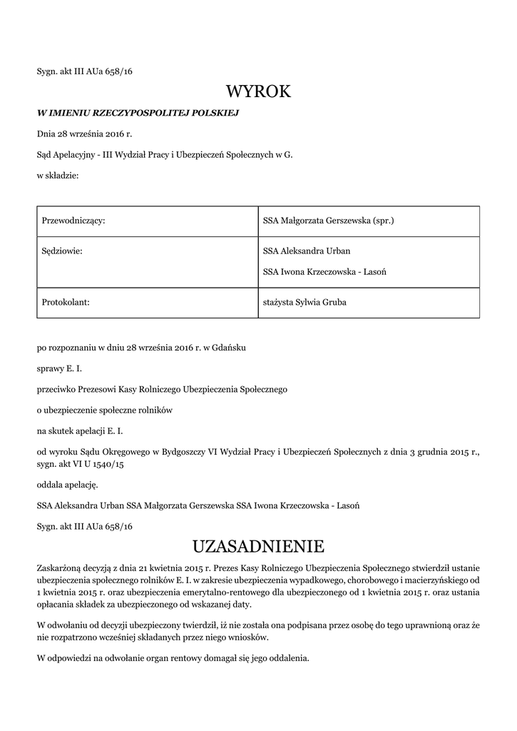Sygn. akt III AUa 658/16 WYROK W IMIENIU RZECZYPOSPOLITEJ POLSKIEJ Dnia 28 września 2016 r. Sąd Apelacyjny - III Wydział Pracy i Ubezpieczeń Społecznych w G. w składzie: Przewodniczący: SSA Małgorzata Gerszewska (spr.) Sędziowie: SSA Aleksandra Urban SSA Iwona Krzeczowska - Lasoń Protokolant: stażysta Sylwia Gruba po rozpoznaniu w dniu 28 września 2016 r. w Gdańsku sprawy E. I. przeciwko Prezesowi Kasy Rolniczego Ubezpieczenia Społecznego o ubezpieczenie społeczne rolników na skutek apelacji E. I. od wyroku Sądu Okręgowego w Bydgoszczy VI Wydział Pracy i Ubezpieczeń Społecznych z dnia 3 grudnia 2015 r., sygn. akt VI U 1540/15 oddala apelację. SSA Aleksandra Urban SSA Małgorzata Gerszewska SSA Iwona Krzeczowska - Lasoń Sygn. akt III AUa 658/16 UZASADNIENIE Zaskarżoną decyzją z dnia 21 kwietnia 2015 r. Prezes Kasy Rolniczego Ubezpieczenia Społecznego stwierdził ustanie ubezpieczenia społecznego rolników E. I. w zakresie ubezpieczenia wypadkowego, chorobowego i macierzyńskiego od 1 kwietnia 2015 r. oraz ubezpieczenia emerytalno-rentowego dla ubezpieczonego od 1 kwietnia 2015 r. oraz ustania opłacania składek za ubezpieczonego od wskazanej daty. W odwołaniu od decyzji ubezpieczony twierdził, iż nie została ona podpisana przez osobę do tego uprawnioną oraz że nie rozpatrzono wcześniej składanych przez niego wniosków. W odpowiedzi na odwołanie organ rentowy domagał się jego oddalenia. Wyrokiem z dnia 3 grudnia 2015 r. Sąd Okręgowy w Bydgoszczy VI Wydział Pracy i Ubezpieczeń Społecznych oddalił odwołanie, wskazując następujące motywy rozstrzygnięcia: Decyzją z dnia 28 marca 2011 r. Prezes Kasy Rolniczego Ubezpieczenia Społecznego stwierdził podleganie przez wnioskodawcę ubezpieczeniu społecznemu rolników i obowiązek wypłacania składek na ubezpieczenia wypadkowe, chorobowe, macierzyńskie oraz emerytalno-rentowe od 1 lutego 2008 r. Wcześniej ubezpieczony miał prawo do rolniczej renty przyznanej mu do 31 stycznia 2008 r. Wyrokiem z dnia 25 listopada 2011 r. Sąd Okręgowy w Bydgoszczy oddalił odwołanie ubezpieczonego od decyzji z dnia 28 marca 2011 r. Decyzją z dnia 28 stycznia 2014 r. KRUS odmówił ubezpieczonemu prawa do renty rolniczej z tytułu niezdolności do pracy. Decyzją z dnia 31 marca 2015 r., Zakład Ubezpieczeń Społecznych Oddział w B. ustalił wysokość i podjął wypłatę emerytury począwszy od 1 lutego 2015 r. Przedmiotowa decyzja nie została zaskarżona przez ubezpieczonego. Po wpływie decyzji z dnia 31 marca 2015 r. do KRUS, organu rentowy wydał zaskarżoną w niniejszej sprawie decyzję, którą podpisał kierownik placówki terenowej ze wzmianką, iż została ona wydana z upoważnienia Prezesa KRUS. Sąd wyjaśnił, że zgodnie z art. 7 ust. 1 ustawy o ubezpieczeniu społecznym rolników, ubezpieczeniu wypadkowemu, chorobowemu i macierzyńskiemu podlega z mocy ustawy rolnik, którego gospodarstwo obejmuje obszar użytków rolnych powyżej 1 hektara przeliczeniowego lub dział specjalny. Domownik rolnika, o którym mowa w punkcie 1, jeżeli ten rolnik lub domownik nie podlega innemu ubezpieczeniu społecznemu lub nie ma ustalonego prawa do emerytury lub renty, albo nie ma ustalonego prawa do świadczeń z ubezpieczeń społecznych. Na podstawie art. 16 ust. 3 w zw. z art. 16 ust. 1 powołanej ustawy ubezpieczeniu emerytalno-rentowemu nie podlega rolnik, który ma ustalone prawo do emerytury lub renty. Konsekwencją przedstawionej regulacji prawnej jest ustalenie, że ubezpieczony - wobec nabycia prawa do emerytury - został wyłączony z ubezpieczenia społecznego rolników. Jak wynika bowiem z powołanych przepisów ubezpieczenie ustaje od dnia następującego po dniu, w którym ustały okoliczności uzasadniające podleganie ubezpieczeniu. Odnośnie zarzutu ubezpieczonego, że decyzja wydana w jego sprawie nie została podpisana przez osobę do tego uprawnioną oraz że nie rozpatrzono wcześniej składanych przez niego wniosków Sąd wskazał, że zgodnie z art. 36 ust. 1 pkt 1 w zw. z art. 36 ust. 2 ustawy o ubezpieczeniu społecznym rolników Prezes Kasy może upoważnić do wydawania decyzji w sprawach o podleganiu ubezpieczeniu oraz ustaniu ubezpieczenia pracowników Kasy. Ponadto Prezes Kasy i Prezes Zakładu mogą postanowić, że określone decyzje będą wydawane z upoważnienia Prezesa Kasy przez pracowników zakładu. Przy wydaniu zaskarżonej decyzji Prezes Kasy skorzystał z upoważnienia, dla którego podstawę stanowi powołany wyżej przepis, dlatego też nie można zgodzić się z argumentem skarżącego odnośnie podpisania decyzji przez osobę nieuprawnioną. Z tych względów, Sąd Okręgowy, uznając odwołanie wnioskodawcy za bezzasadne, na mocy art. 47714 § 1 k.p.c. orzekł, jak w sentencji. Apelację od wyroku wywiódł wnioskodawca zaskarżając go w całości i zarzucając mu naruszenie zasad postępowania cywilnego poprzez nie rozpoznanie istoty sprawy oraz nie wyjaśnienie wszystkich okoliczności faktycznych istotnych dla rozstrzygnięcia sprawy i oparcie postępowania o nieistniejącą decyzję z dnia 28 stycznia 2014 r., także i inne, m. in. choćby przedstawiane w pismach i na rozprawie. Uzasadniając swoje stanowisko skarżący podkreślił, że emerytura z ZUS przyjęta z biedy i wielomiesięcznym opóźnieniem w bezskutecznym oczekiwaniu na zakończenie postępowania rentowego w KRUS świadczy o pozbawieniu go przysługującego każdemu swobodnego prawa wyboru renty czy emerytury oraz o nierównym traktowaniu. Krzywdą jest bowiem zakończenie w KRUS ubezpieczenia wnioskodawcy przed zakończeniem postępowania rentowego trwającego od 25 lutego 2008 r. Będąc, zatem pokrzywdzonym przez KRUS i niestety przez Sąd skarżący wniósł o zmianę wyroku lub jeśli to nie możliwe o jego uchylenie. Sąd Apelacyjny zważył, co następuje: Apelacja wnioskodawcy nie zasługuje na uwzględnienie. Istota sporu w analizowanej sprawie sprowadzała się do ustalenia, c